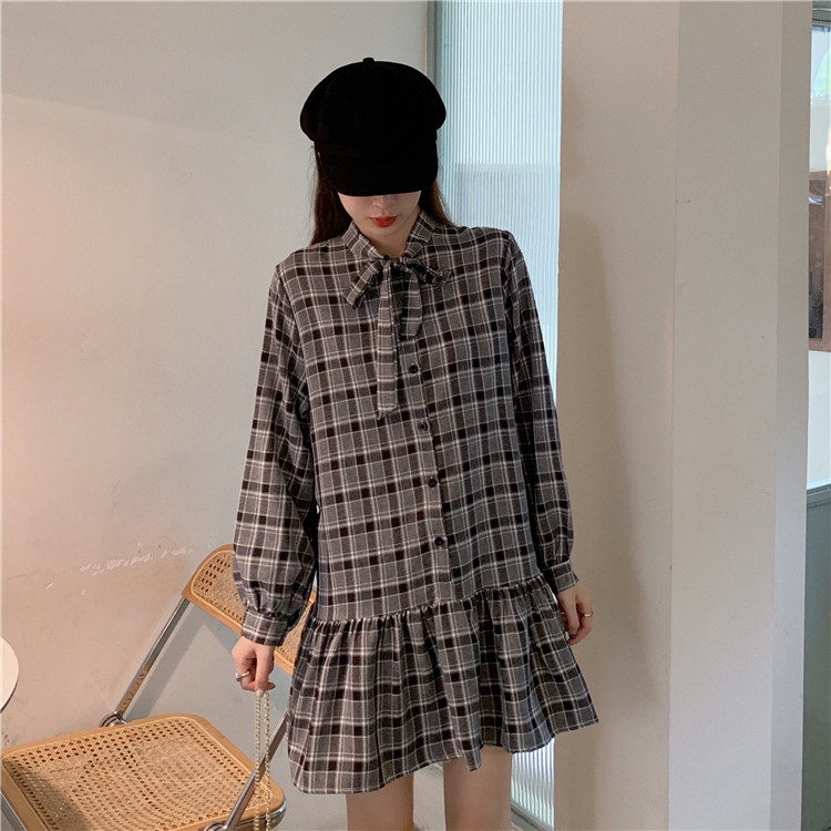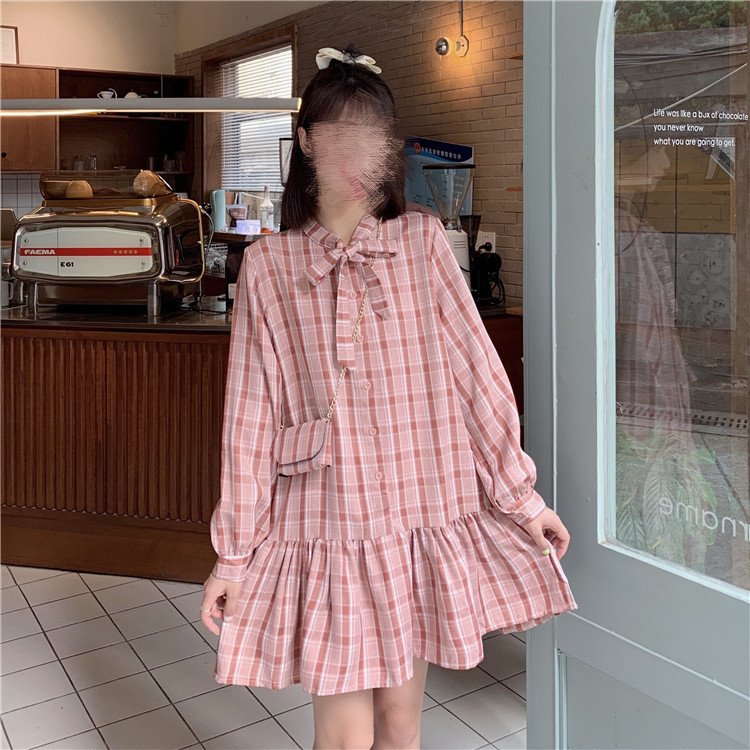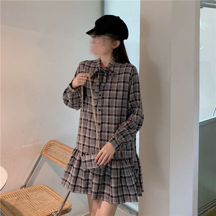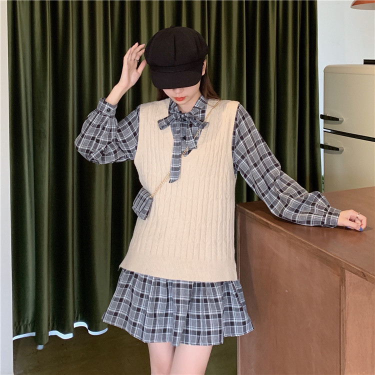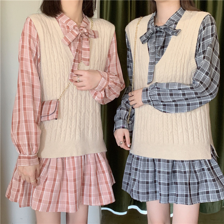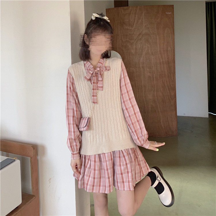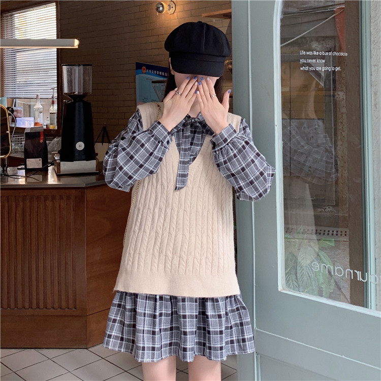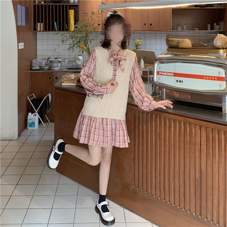 学院風スタイルが可愛いニットベストとチェック柄ロングワンピースの二点組です。