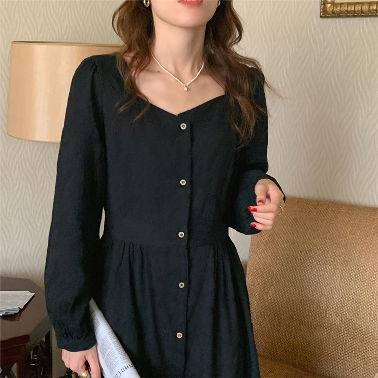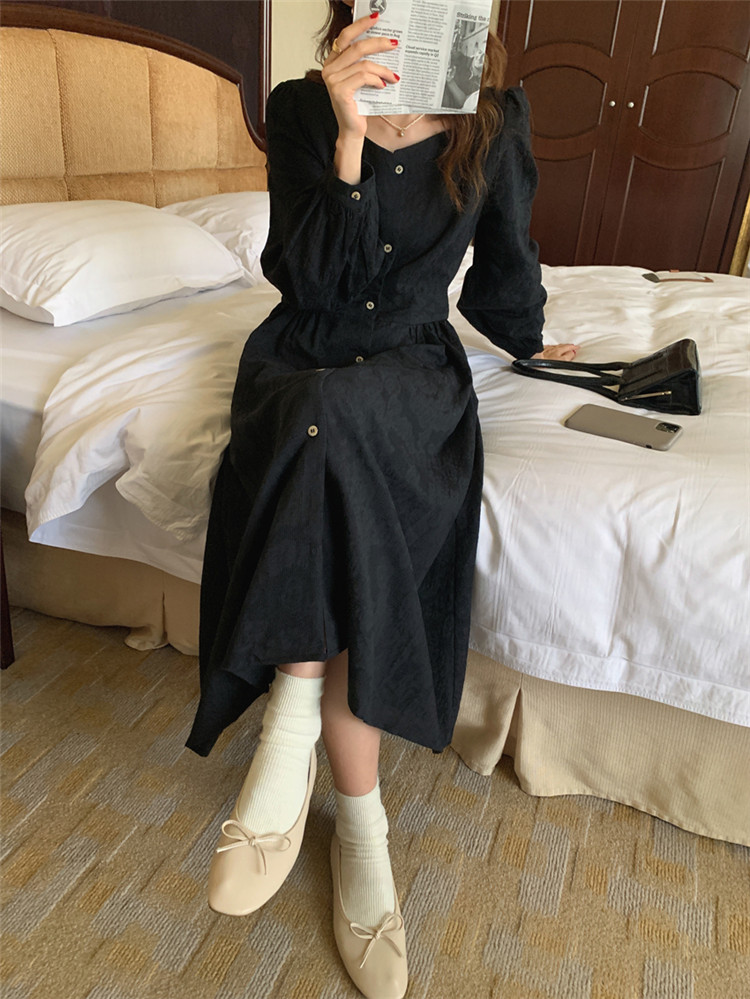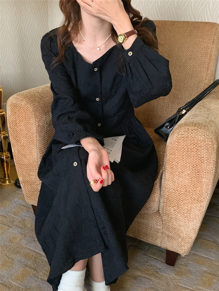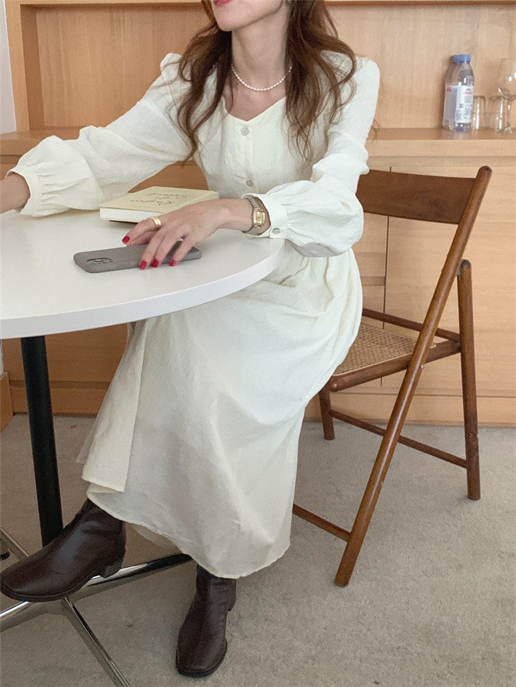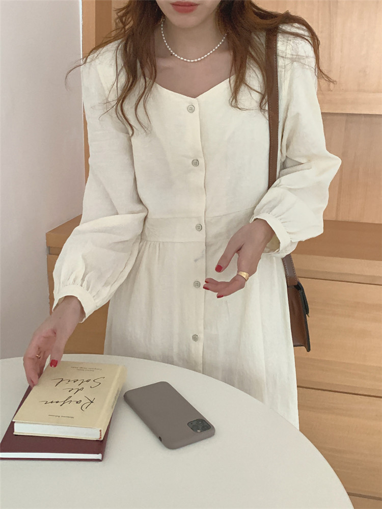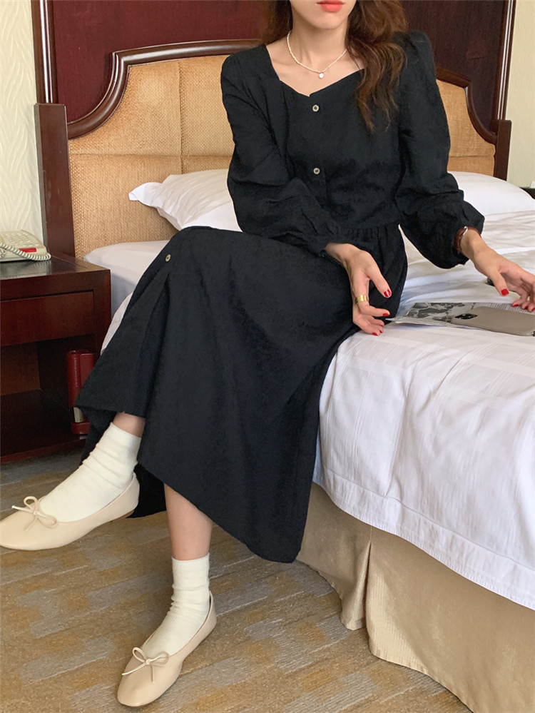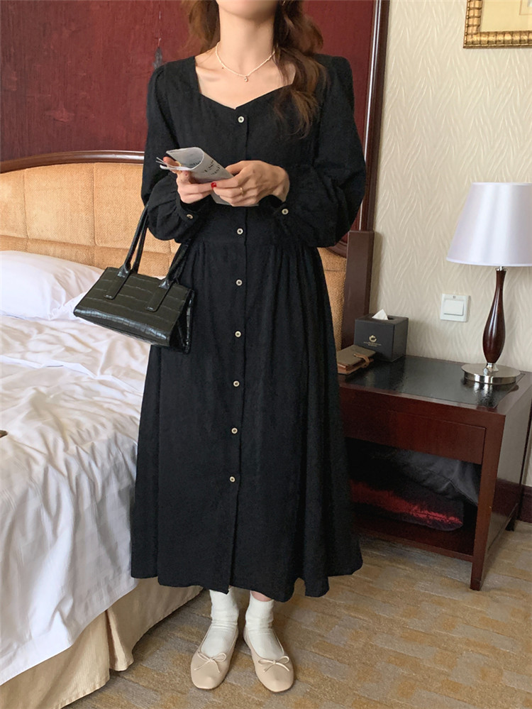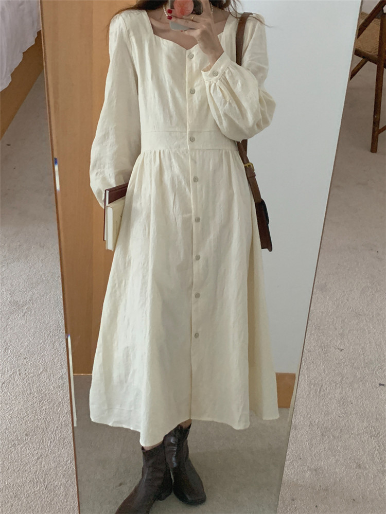 エレガントな四角襟と前ボタン留めが特徴的なロングワンピースです。