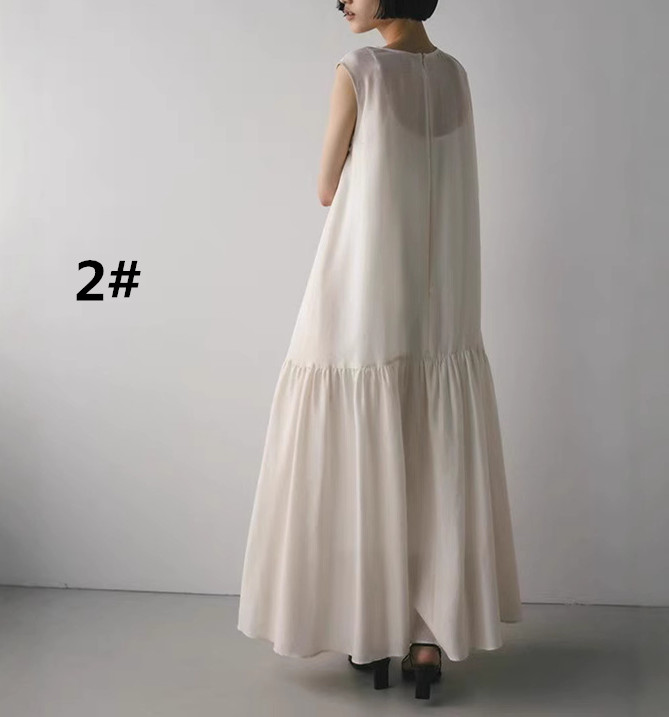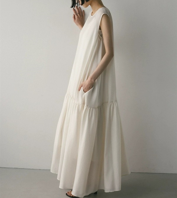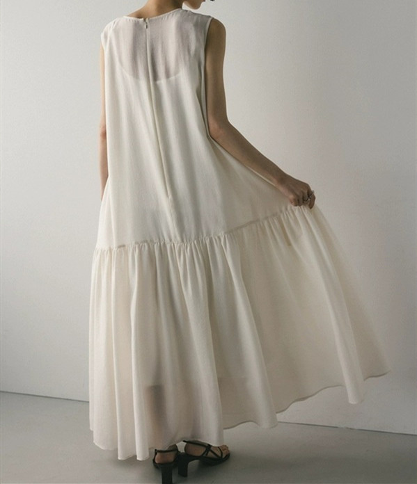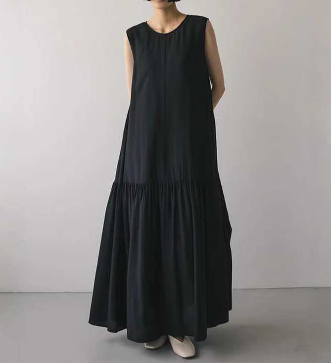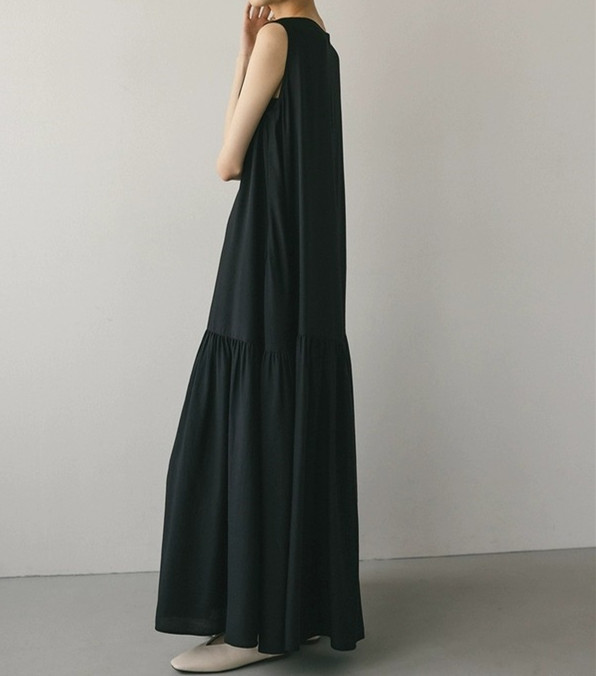 裾に向かって広がるティアードデザインが美しいノースリーブのロングワンピース。