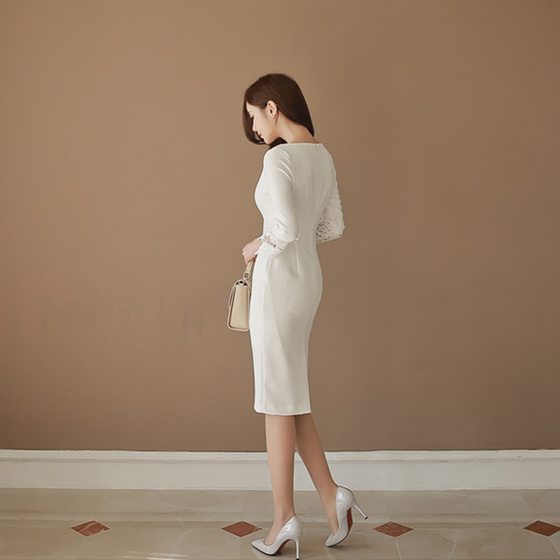 袖口の繊細なレースデザインが上品で、フォーマルなシーンにぴったりな一着です。