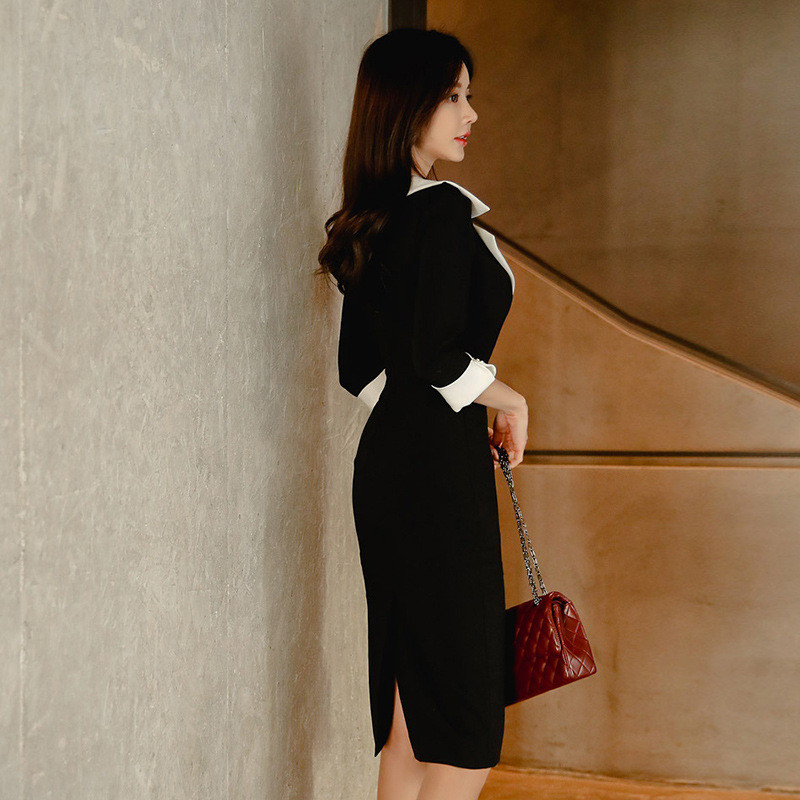 黒と白のコントラストが美しい上品なデザインで、通勤やフォーマルなシーンにぴったりな一着です。