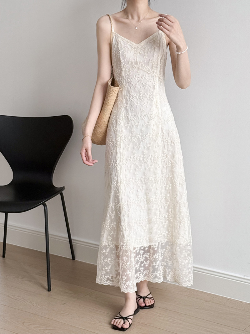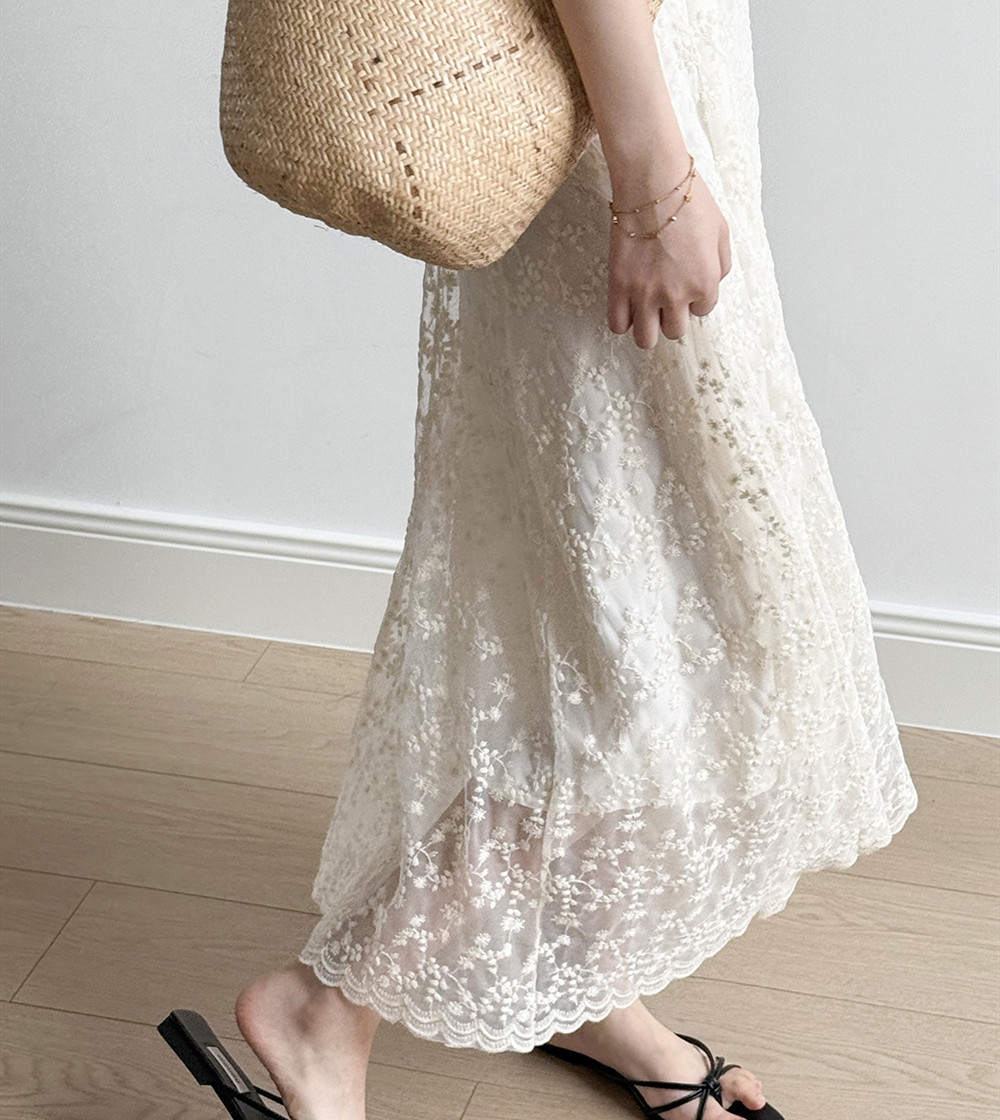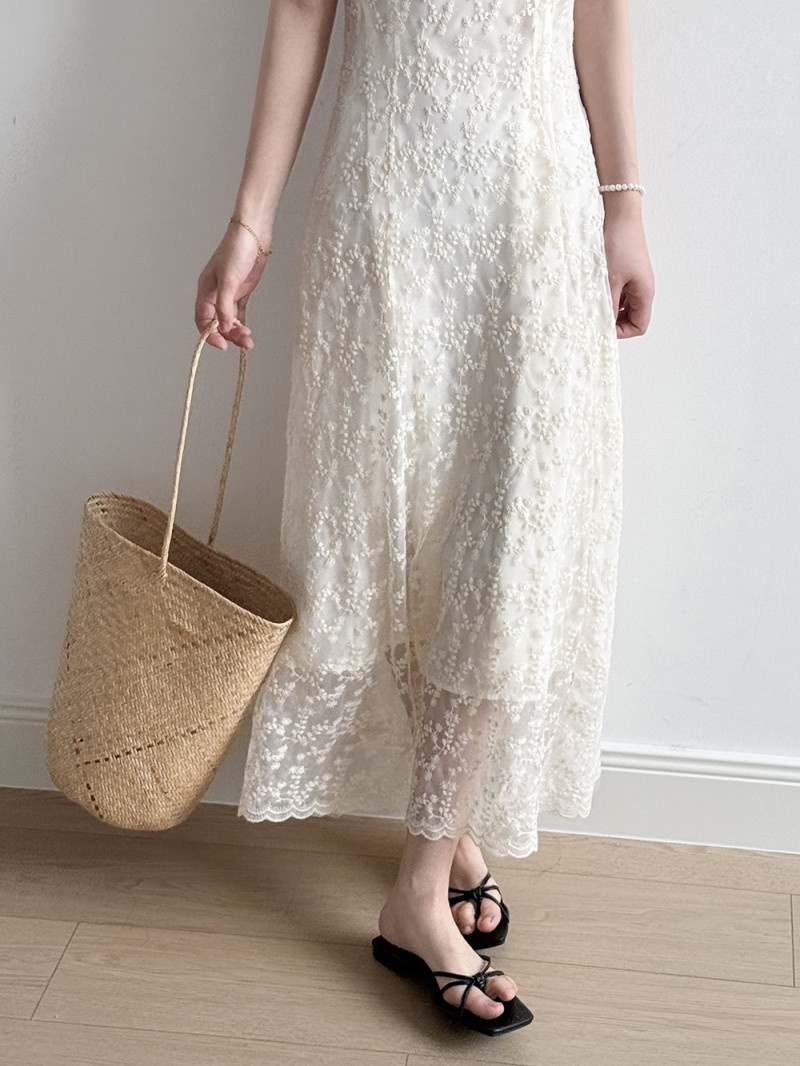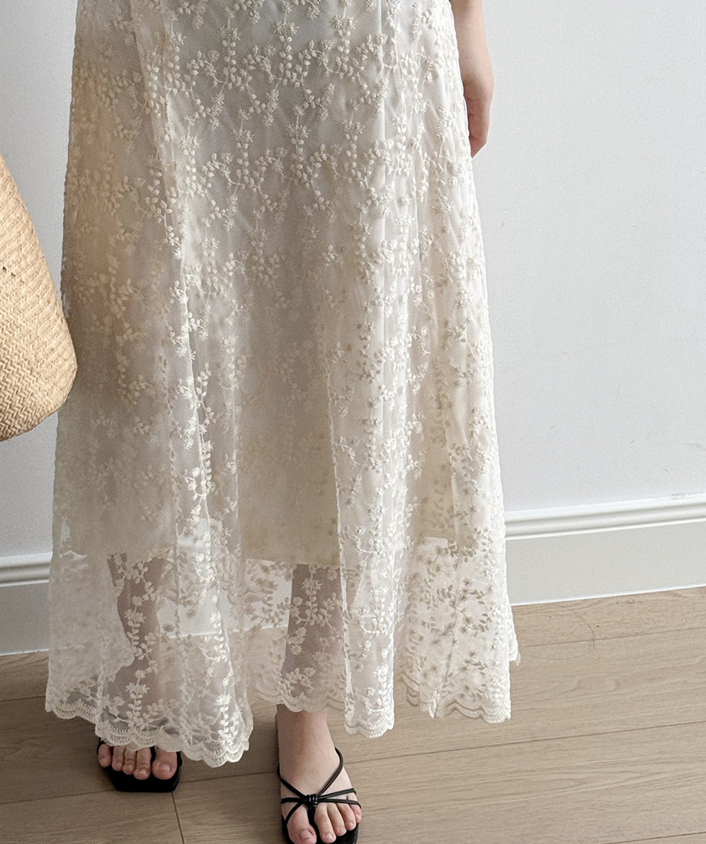 繊細なレース素材が女性らしさを引き立て、ロングワンピースならではの優雅なシルエットが魅力的。