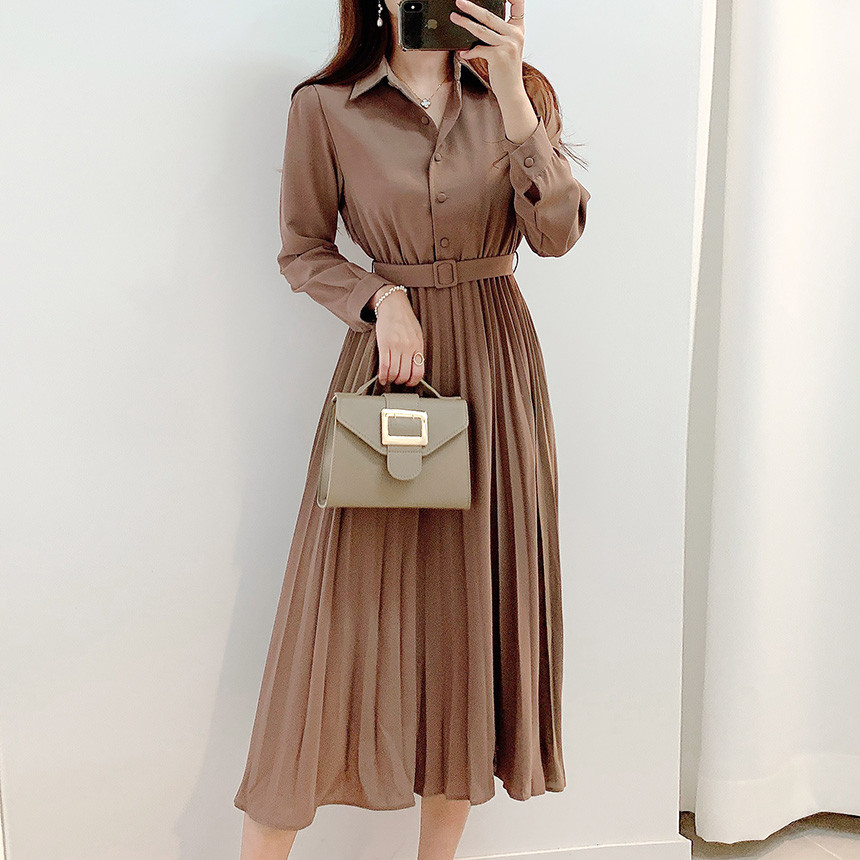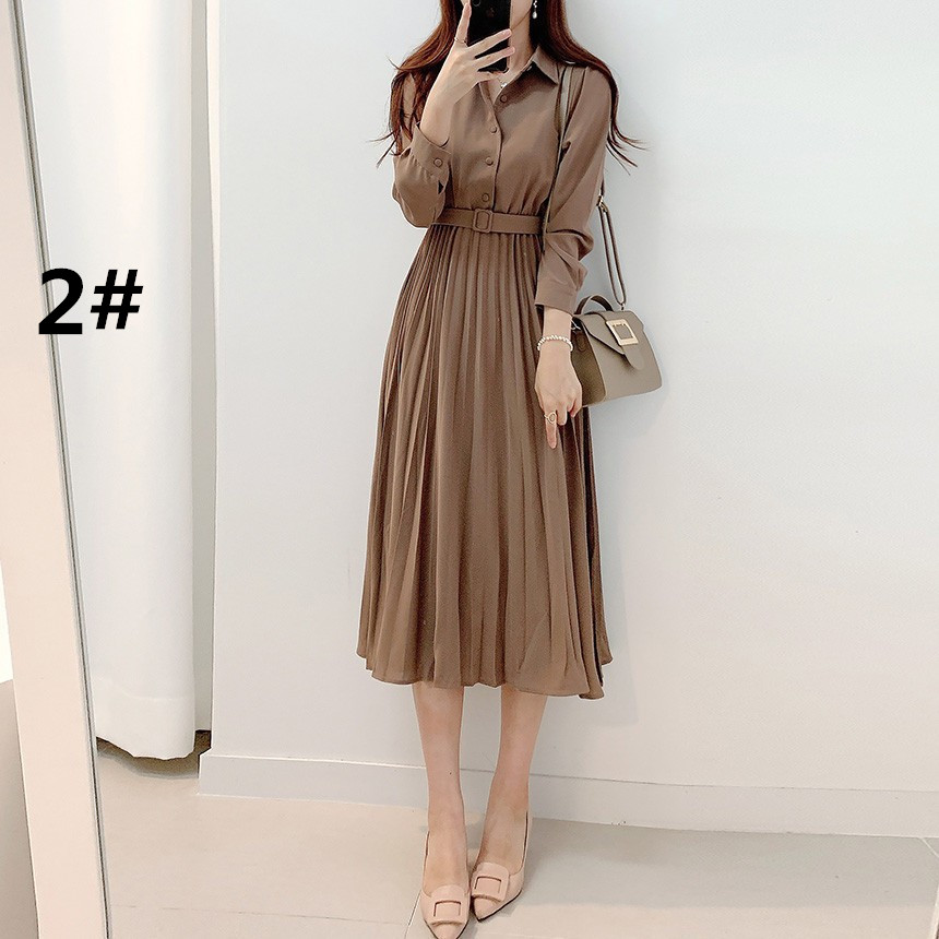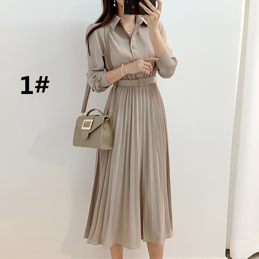 襟付きのシャツデザインにプリーツスカートが上品な印象を演出します。