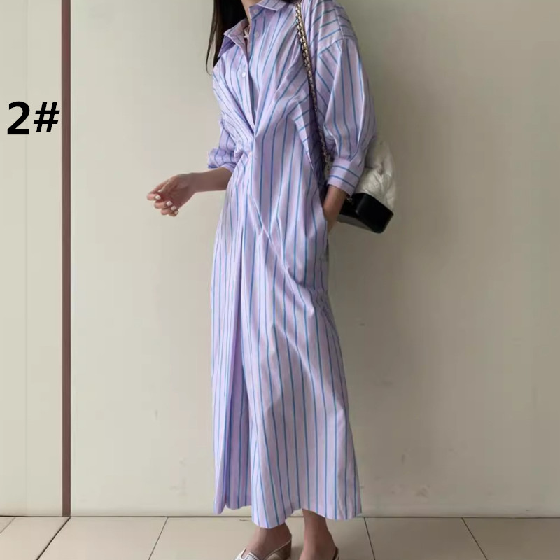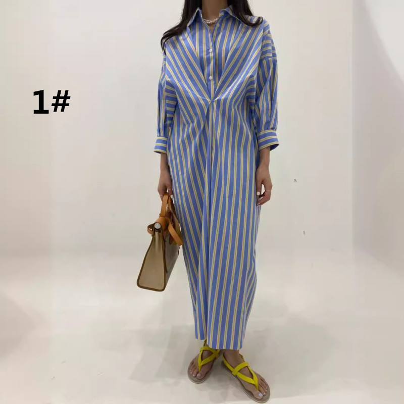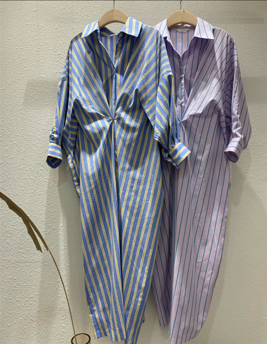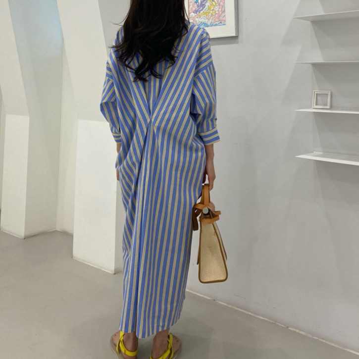 1枚で簡単楽チン、上品なストライプ柄のロングワンピース。