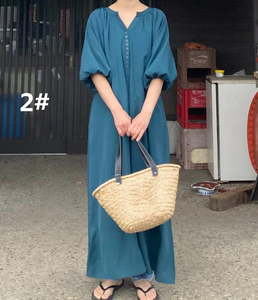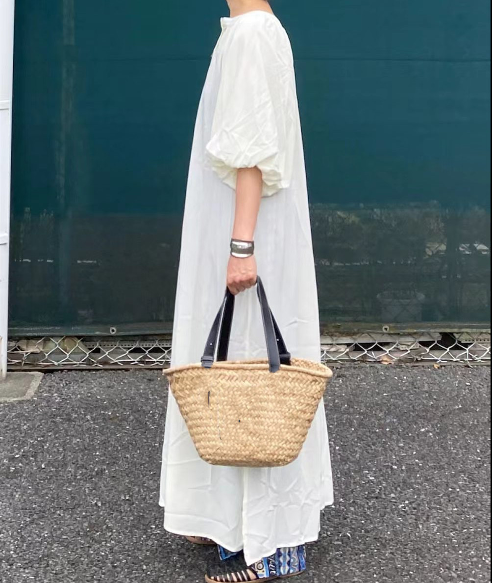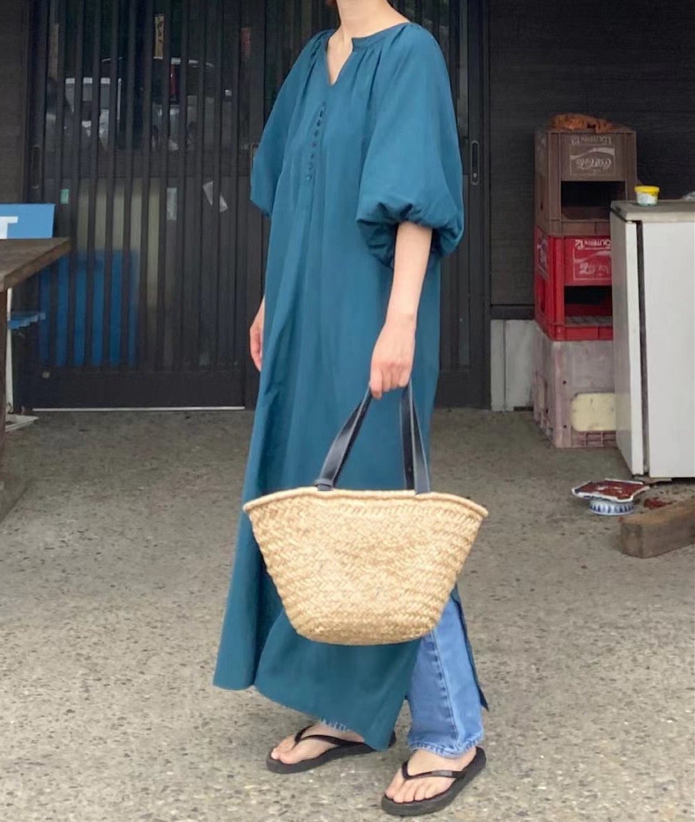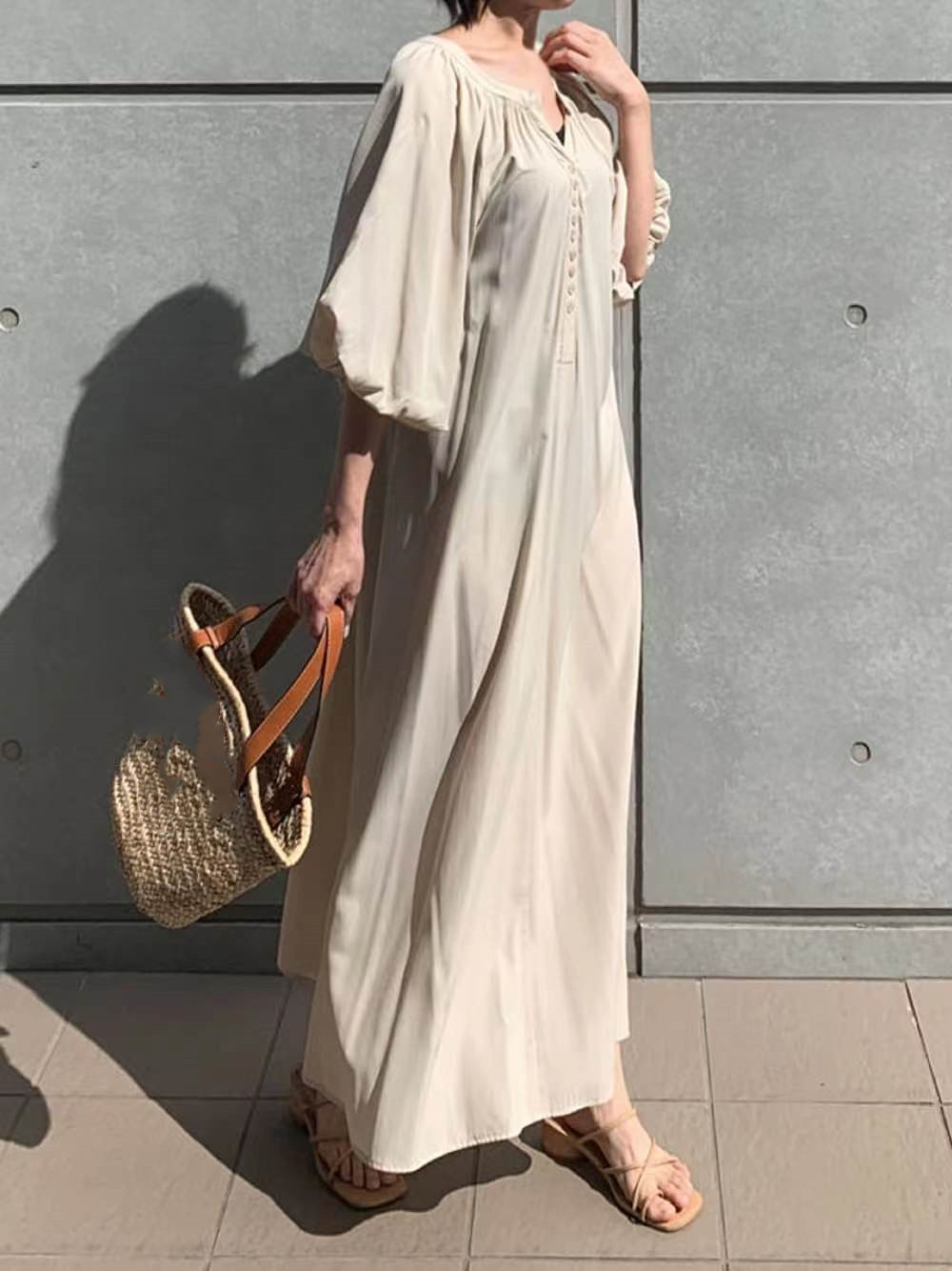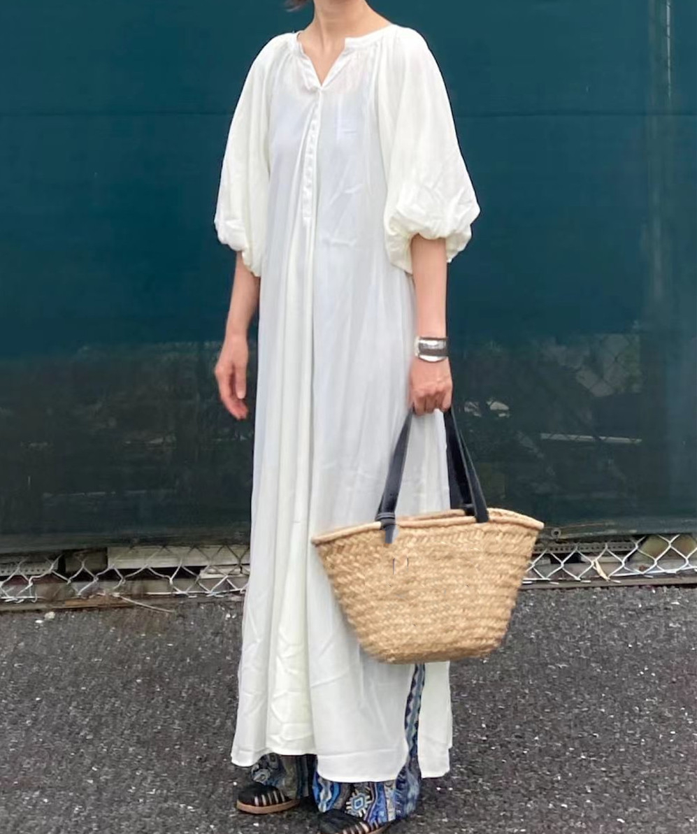 シャツタイプのすっきりとした襟元と、ふんわり袖が上品な印象を演出。