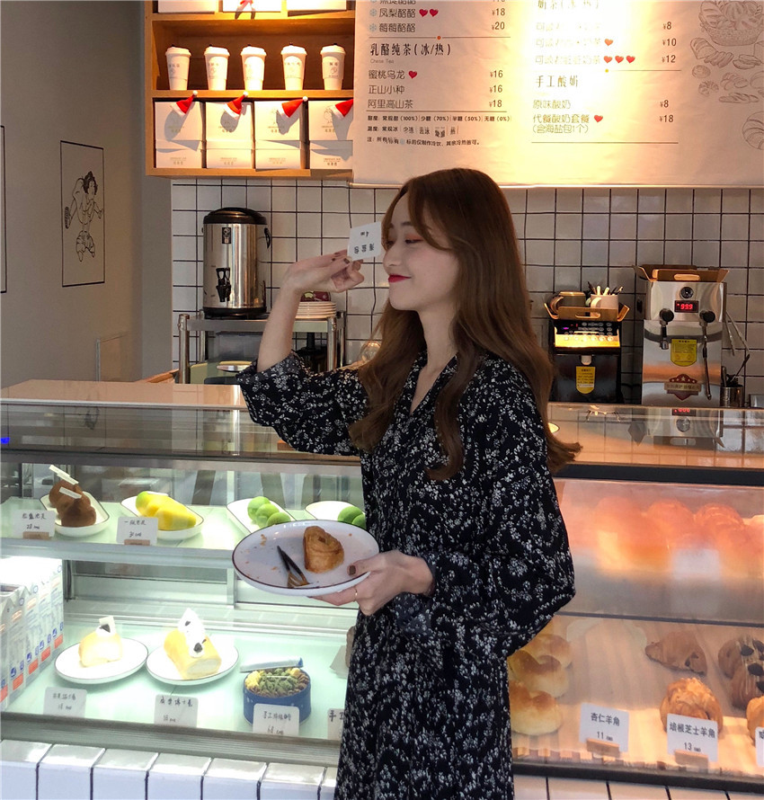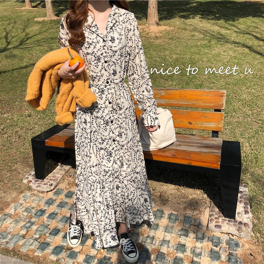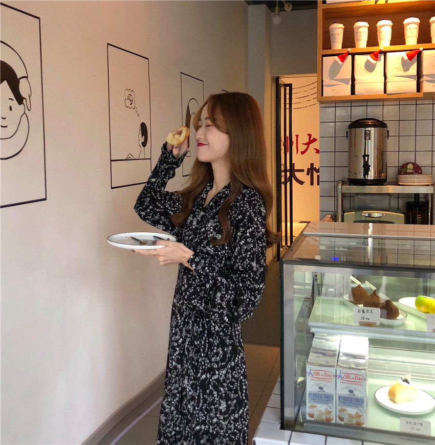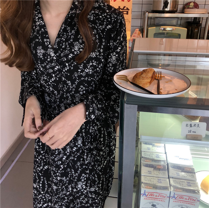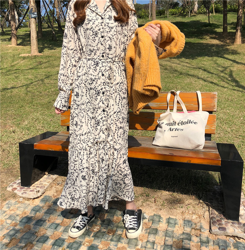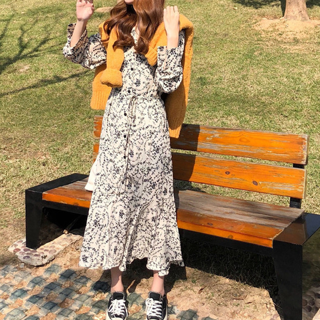 上品な小花柄とロングワンピースの美しいシルエットで、大人の女性らしさを演出。