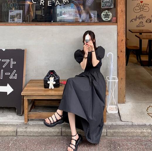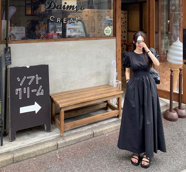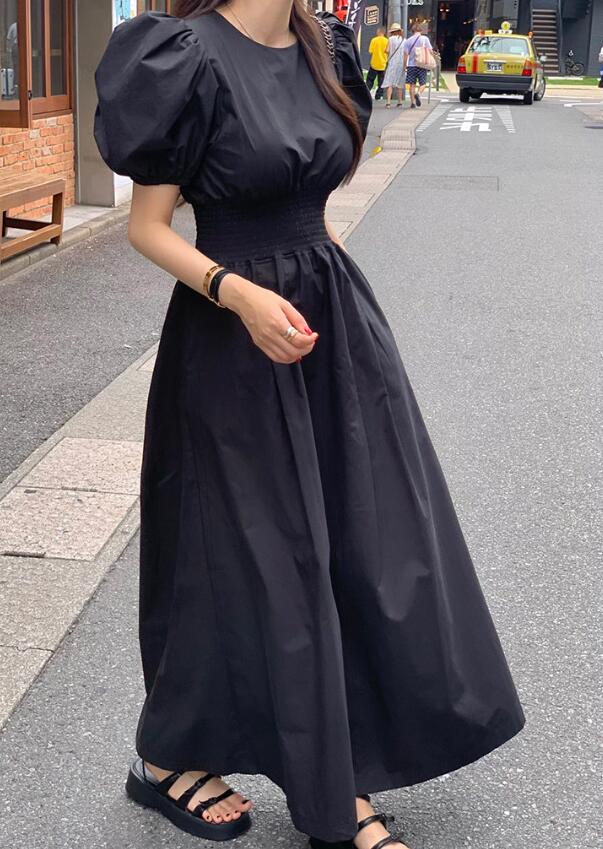 エレガントなパフスリーブが印象的なフレアロングワンピースです。 ウエストマークでスタイルアップ効果抜群の美しいシルエットを実現。 上品な黒色で様々なシーンに対応できる万能アイテム。 ロングワンピース専門店こだわりの上質な仕上がりをお楽しみください。