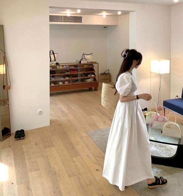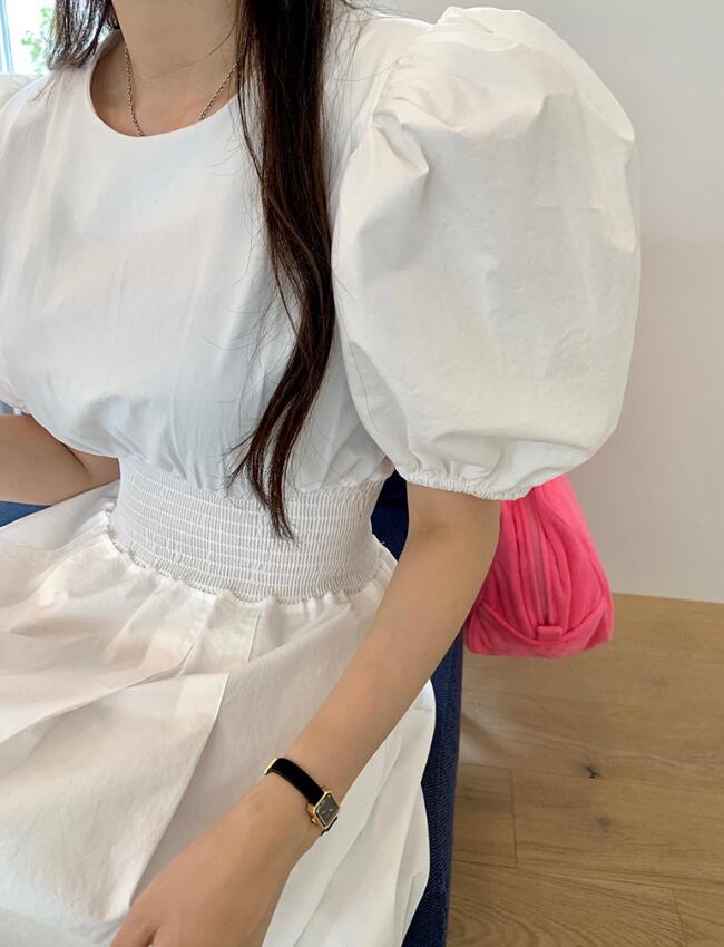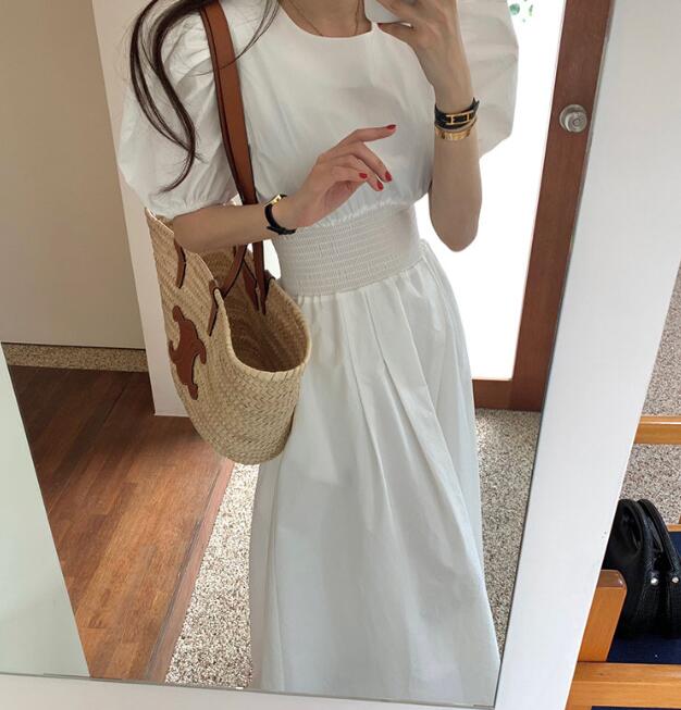 エレガントなパフスリーブが印象的なフレアロングワンピースです。