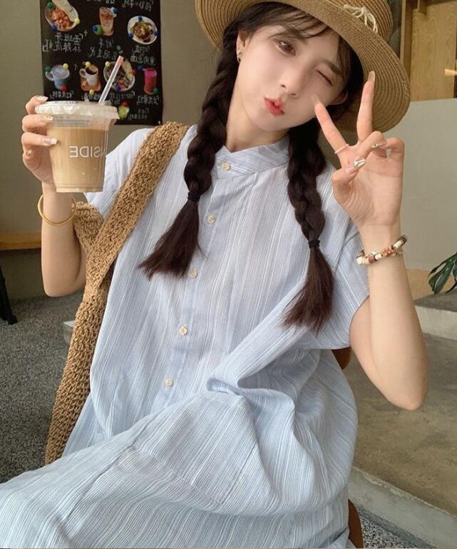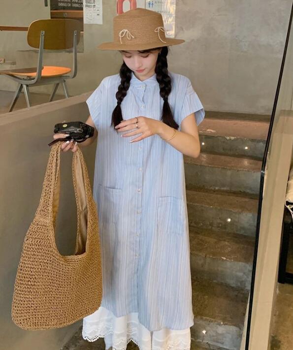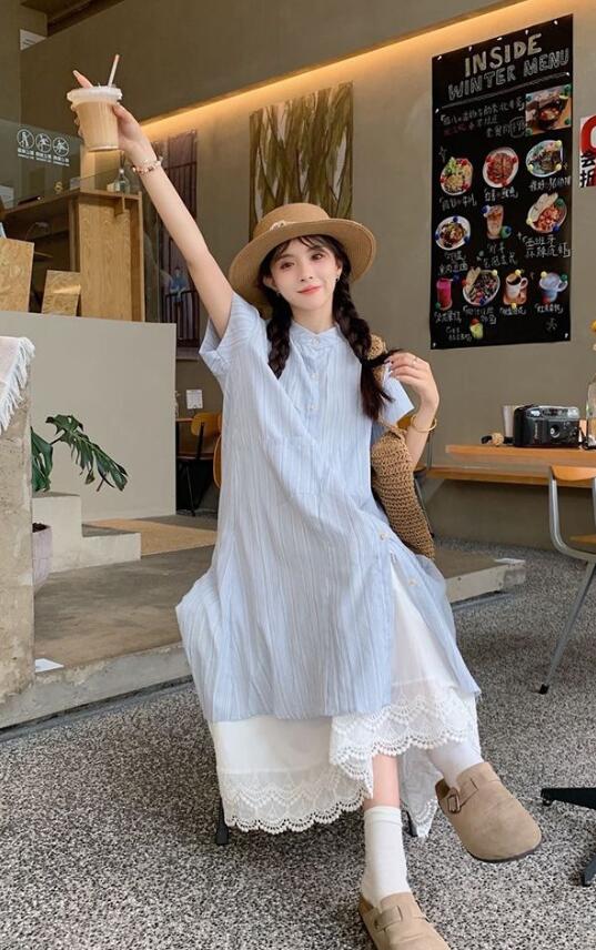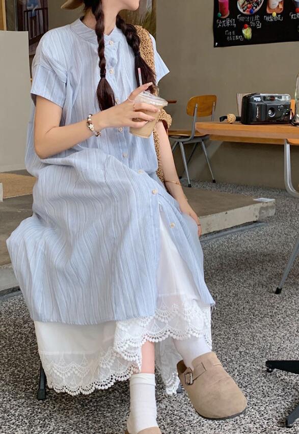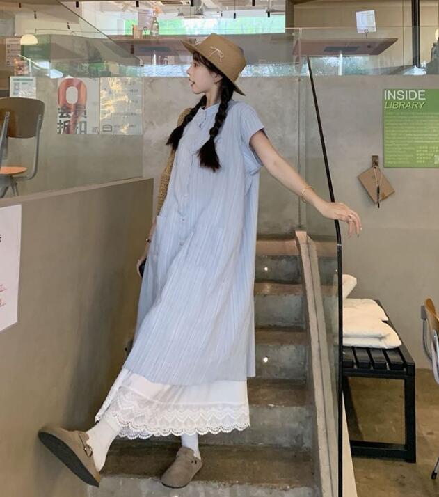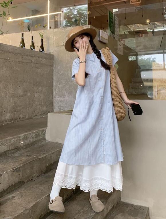 上品なストライプシャツワンピースとレースペチスカートの2点セット。