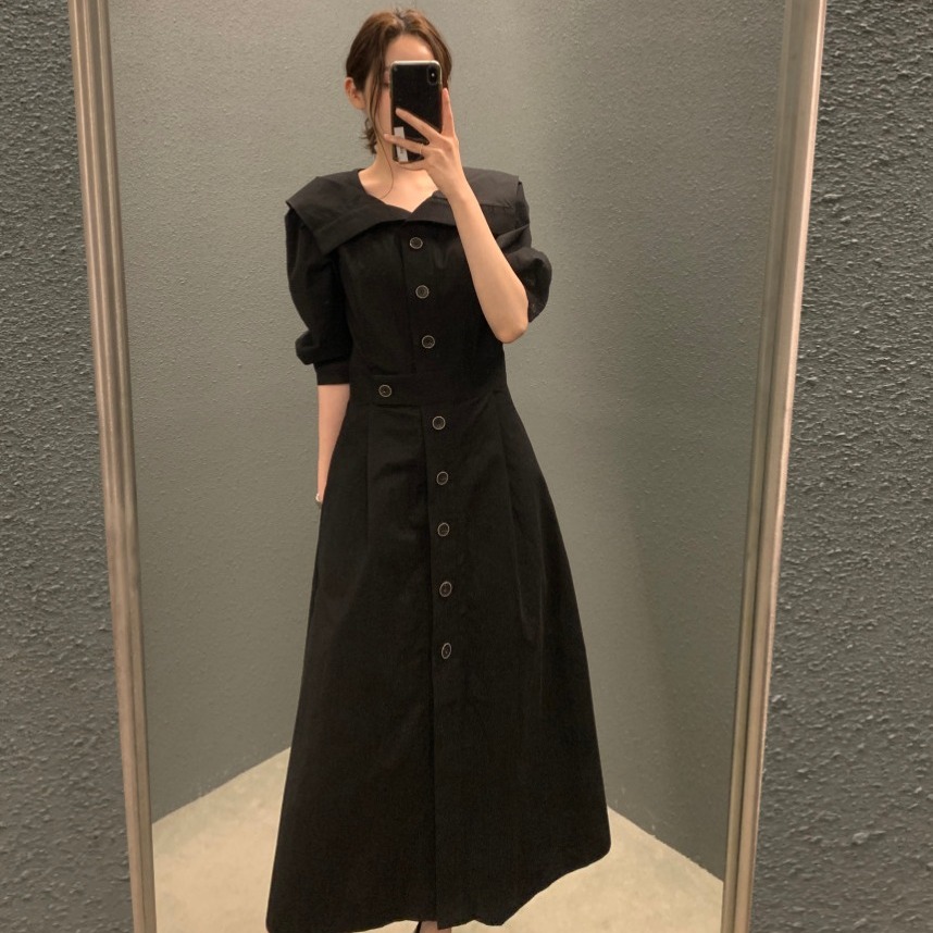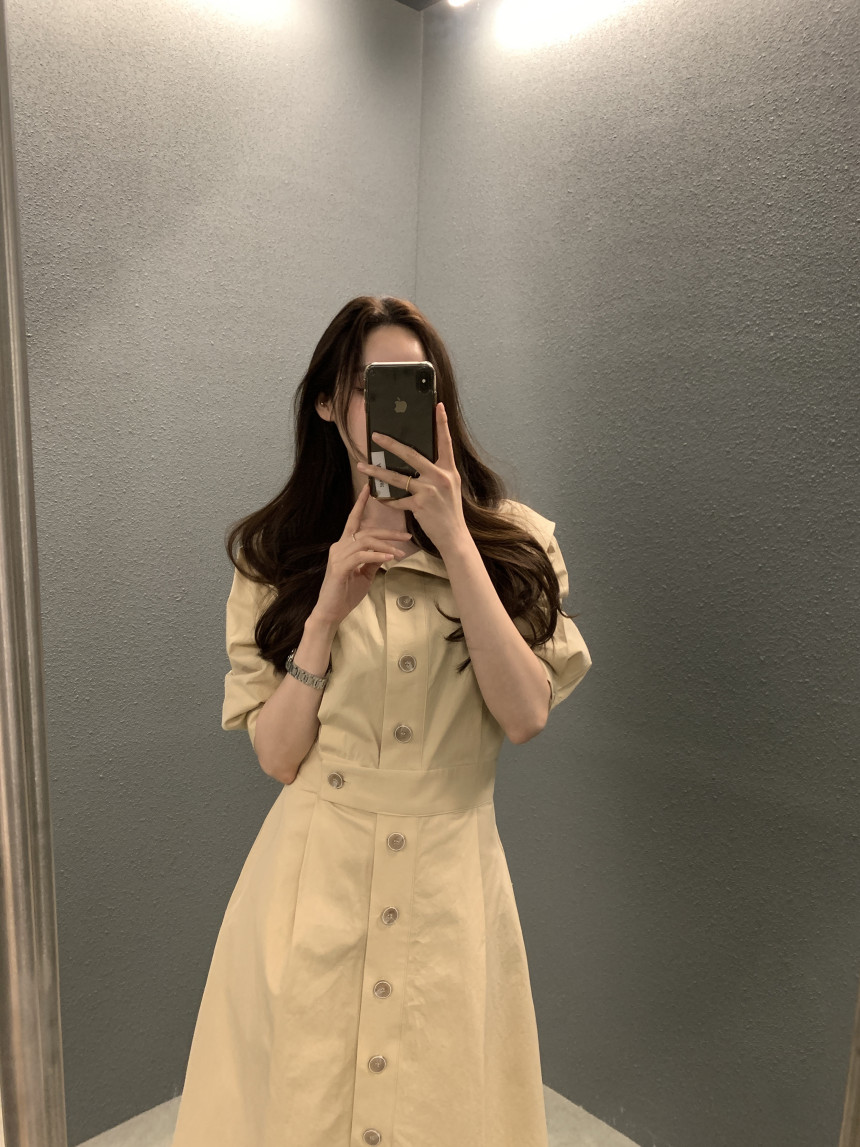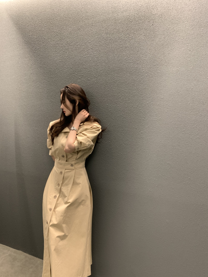 フロントボタンとウエストギャザーが美しいシルエットを演出するロングワンピース。