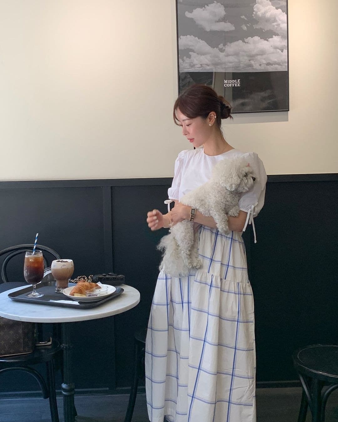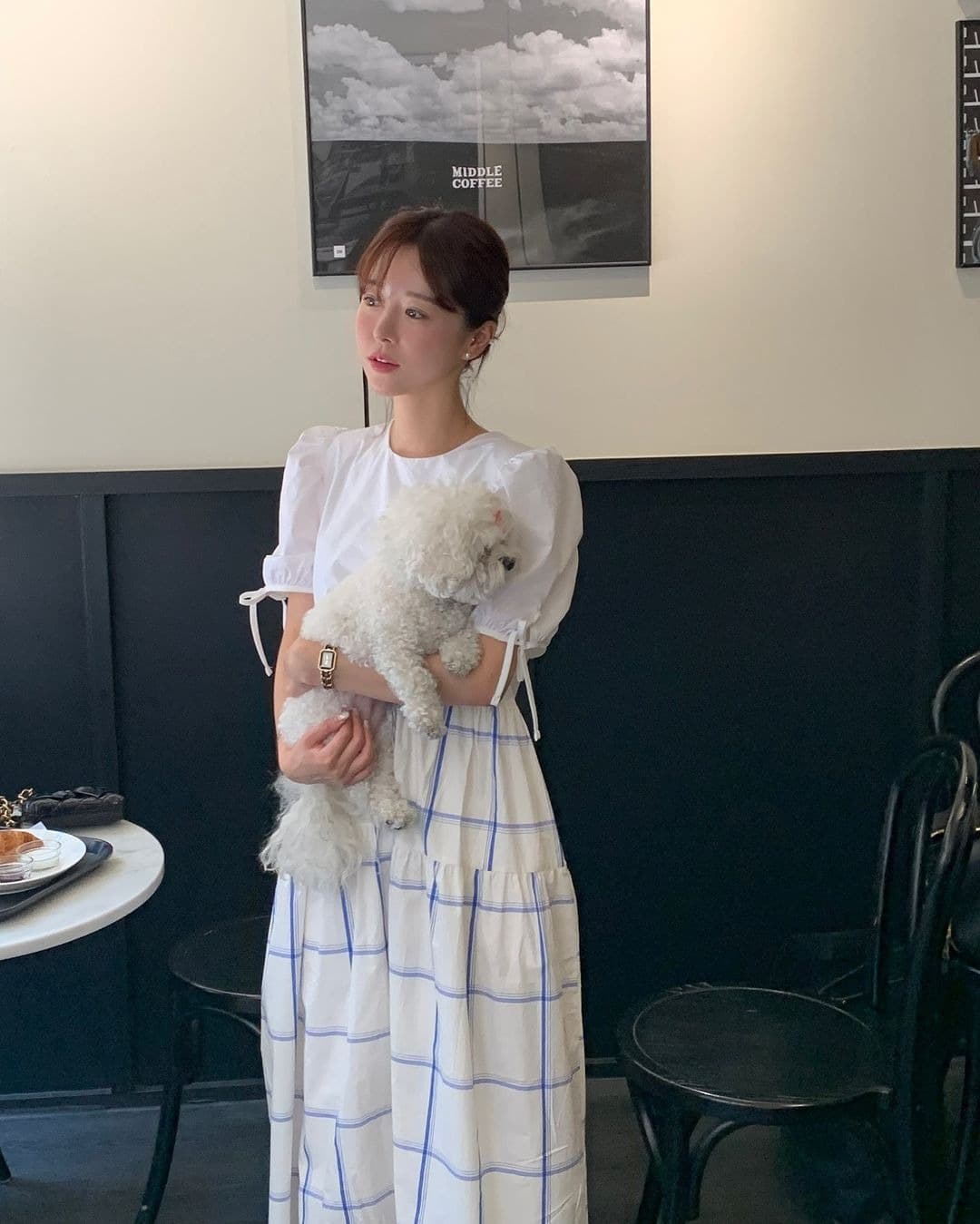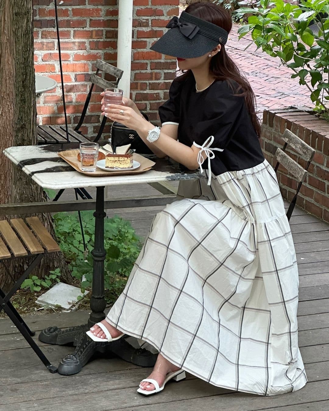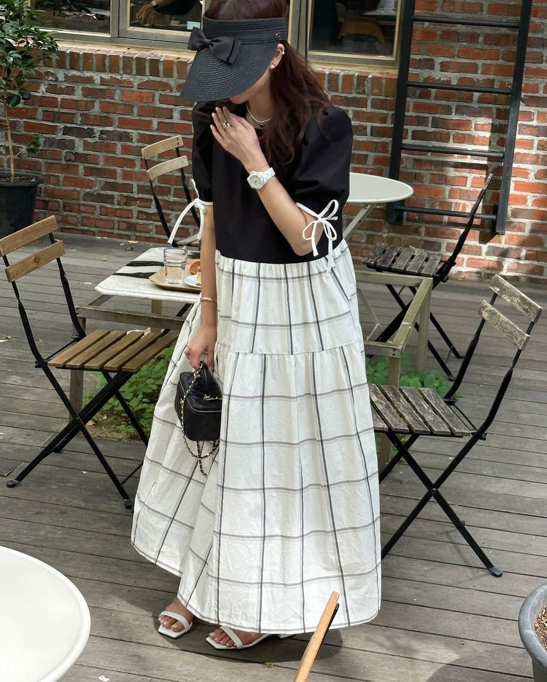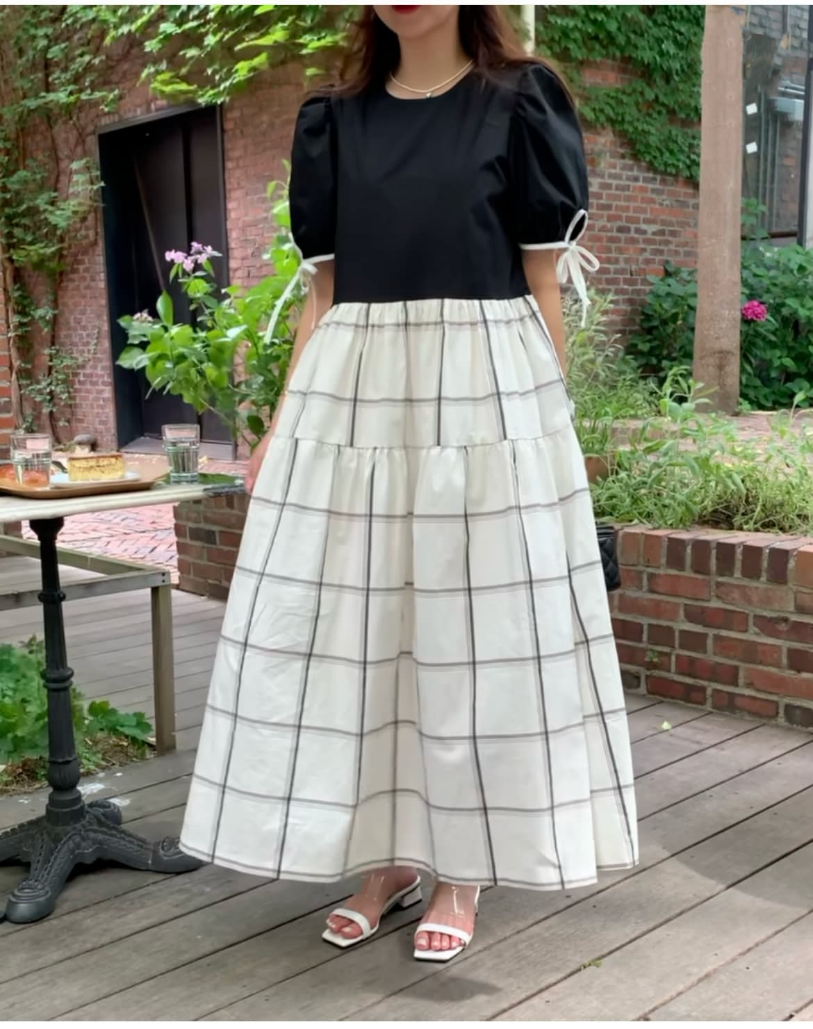 白とチェック柄の切替デザインが印象的で、フレアシルエットが女性らしさを引き立てます。