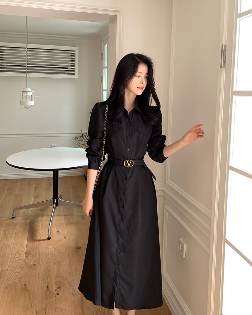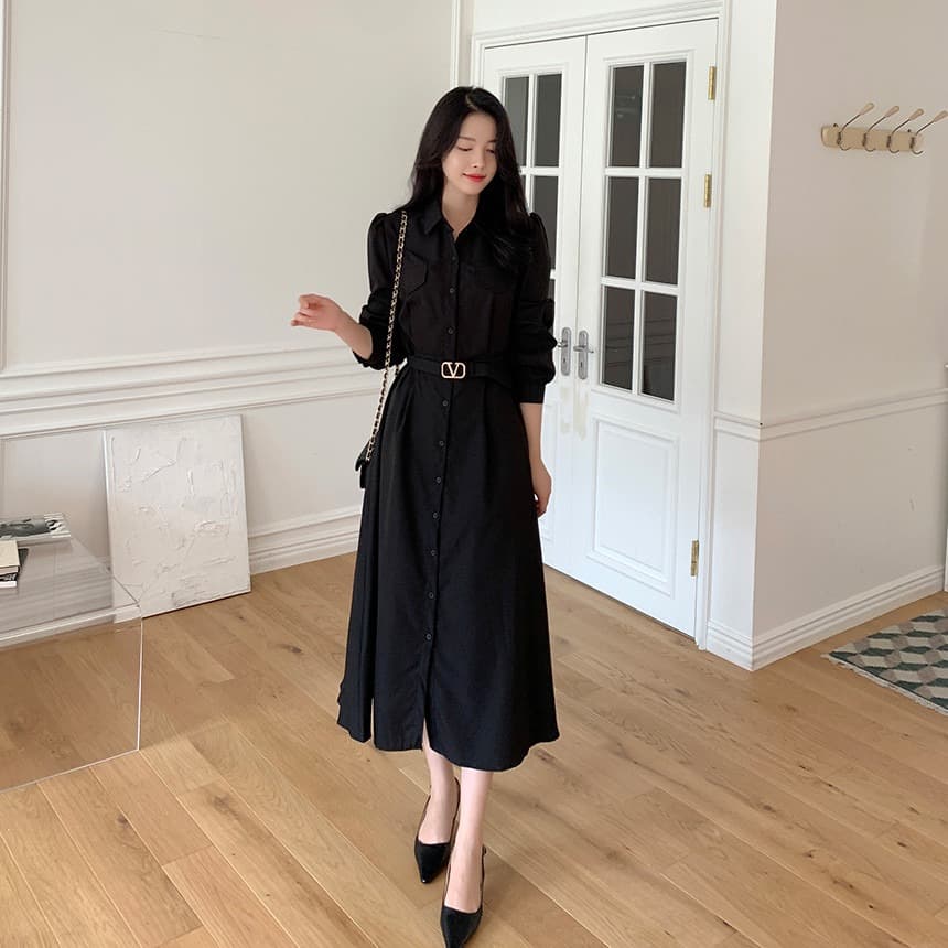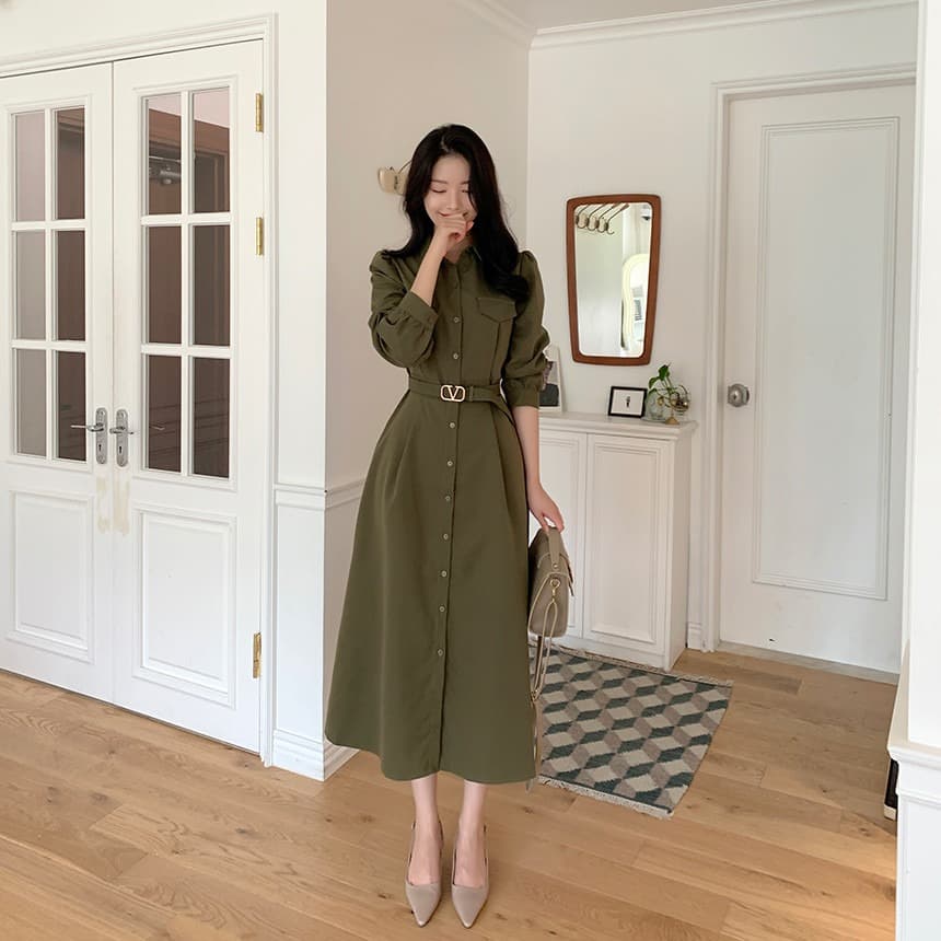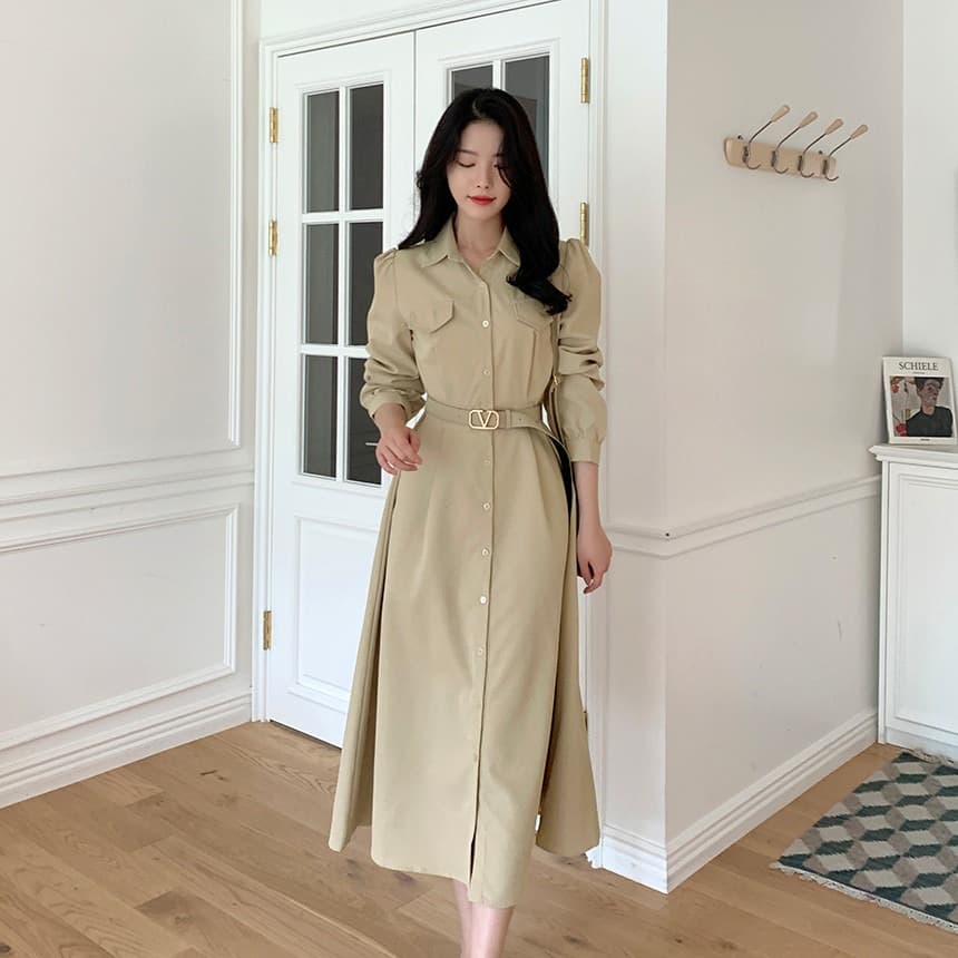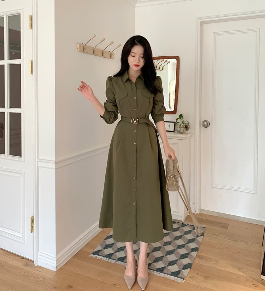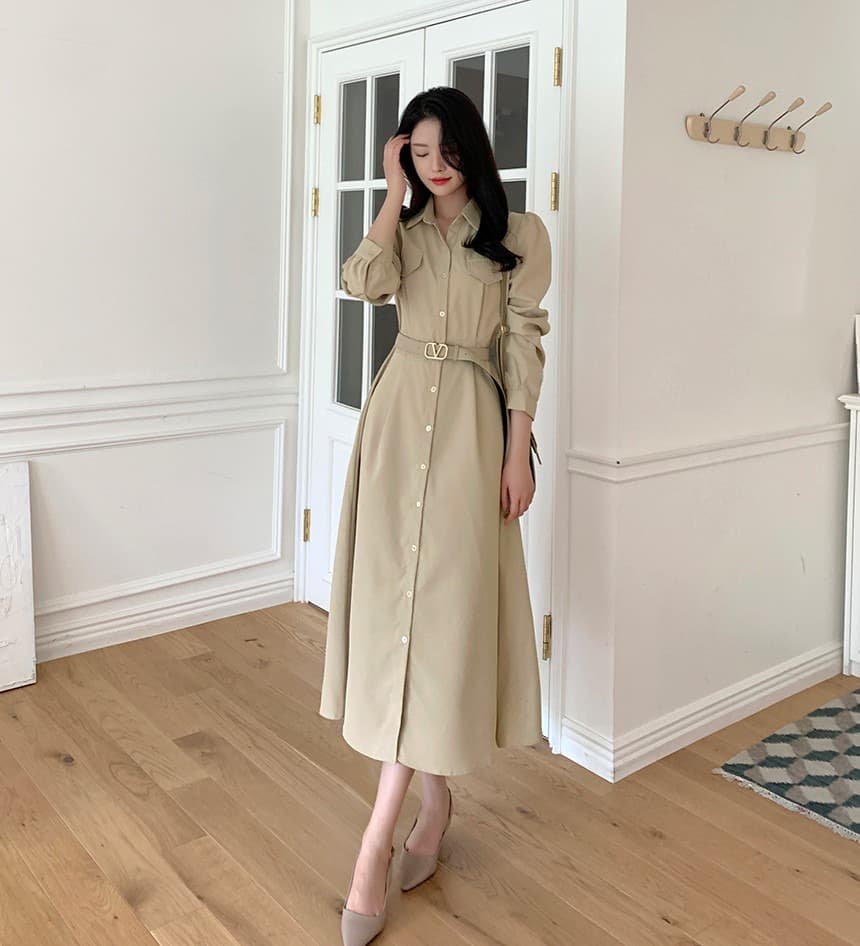 エレガントな襟付きデザインが魅力的なシャツ風ロングワンピース。