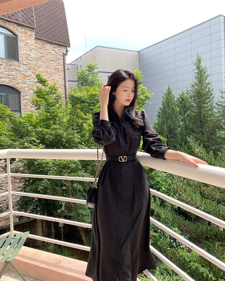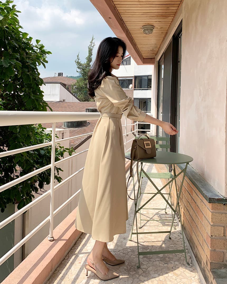ウエストベルトで美しいシルエットを演出し、上品な印象に。