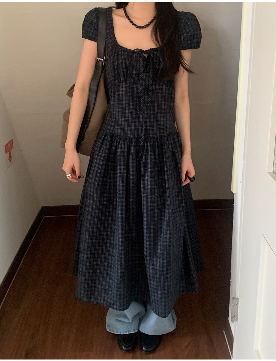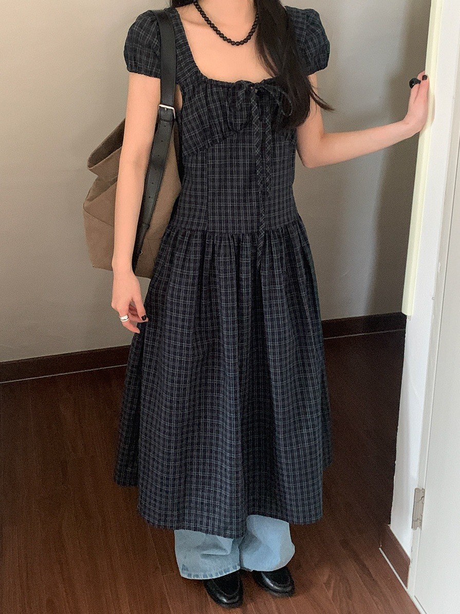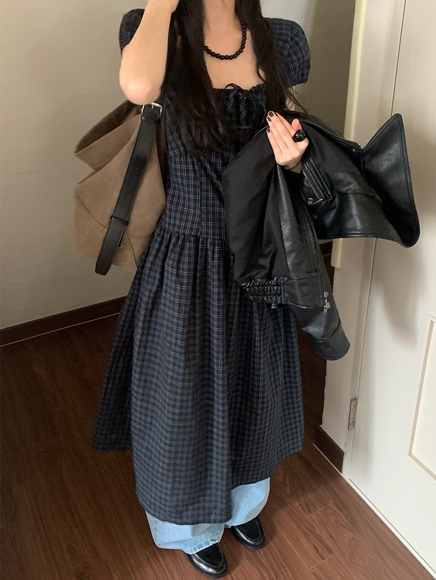 上品な気質を演出するチェック柄のロングワンピース。