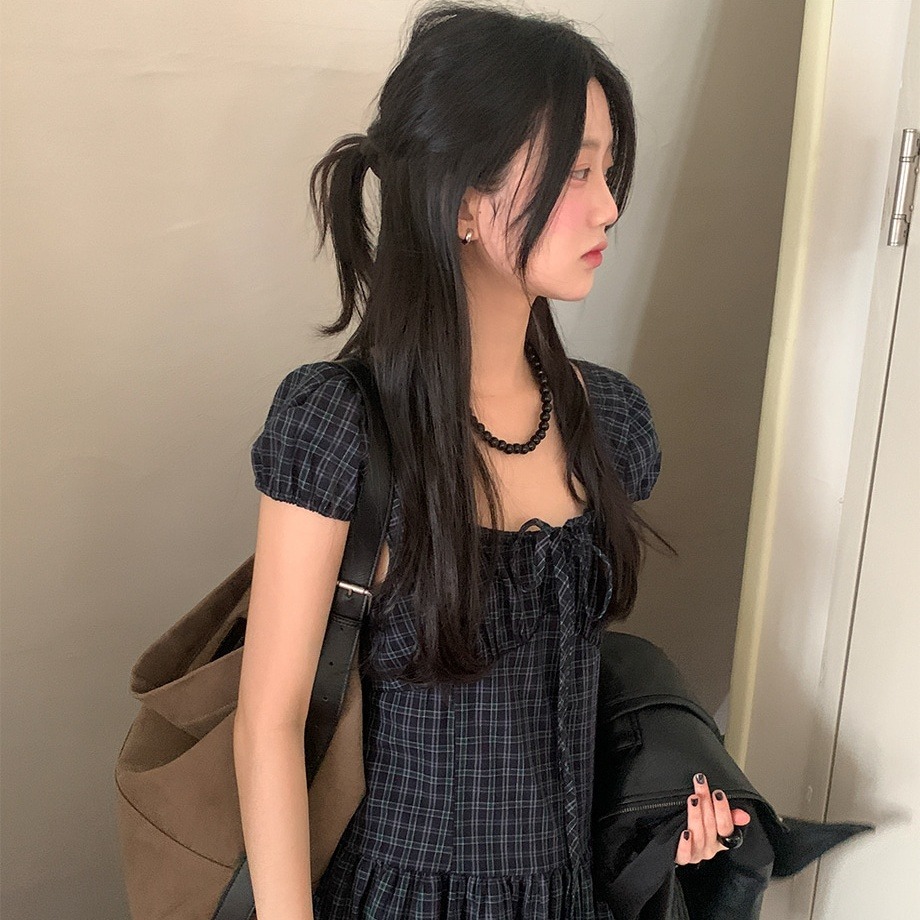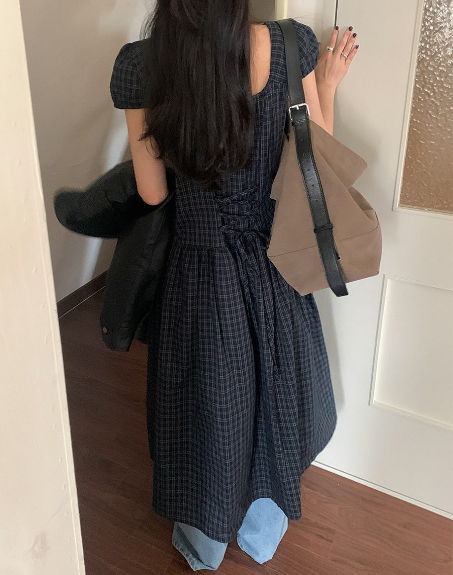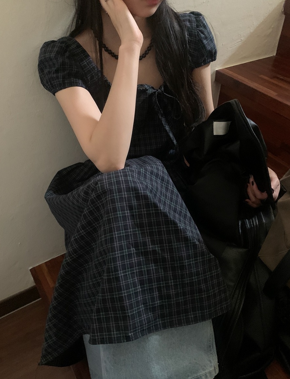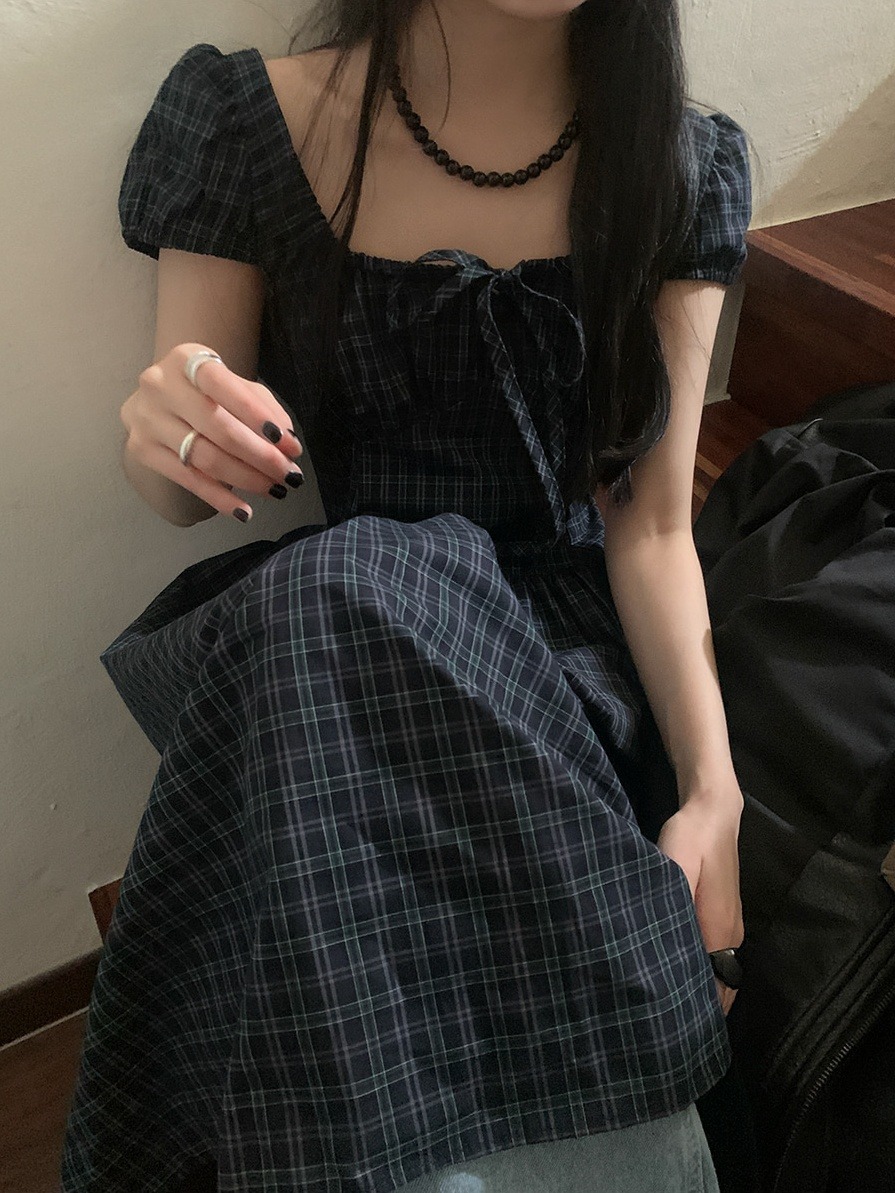 上品な気質を演出するチェック柄のロングワンピース。