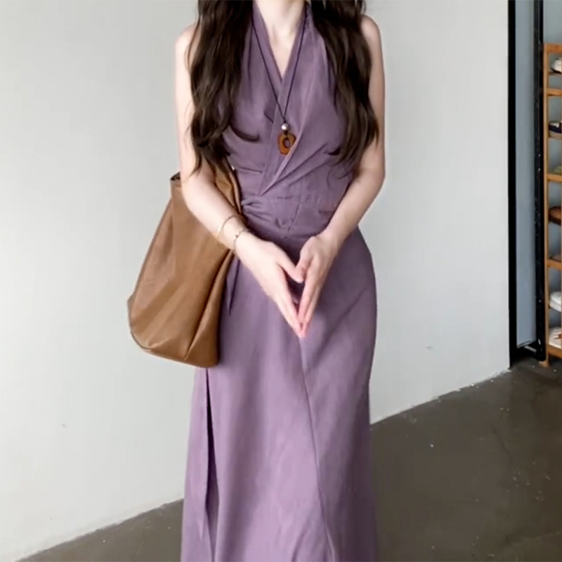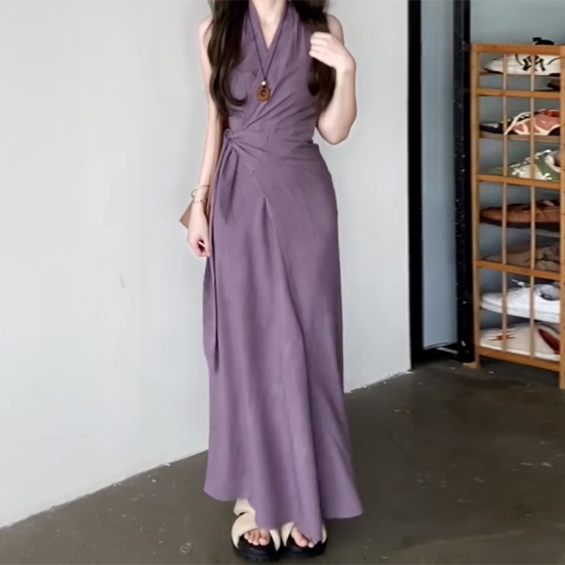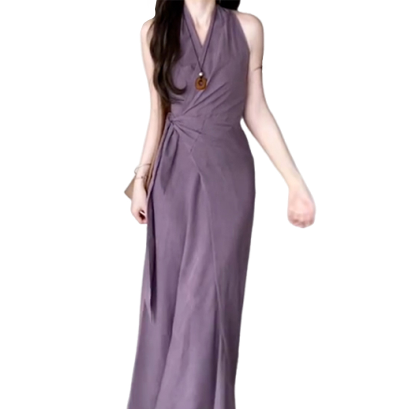 エレガントなホルターネックデザインが魅力的なノースリーブロングワンピース。
