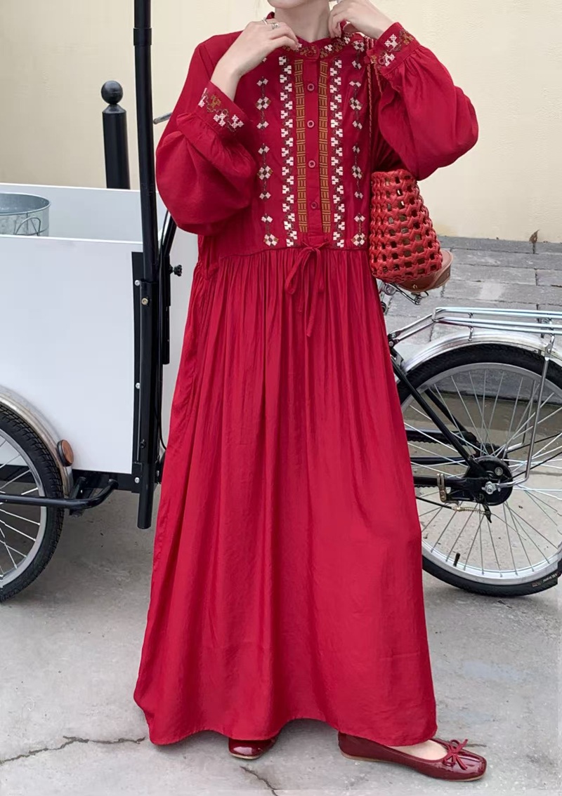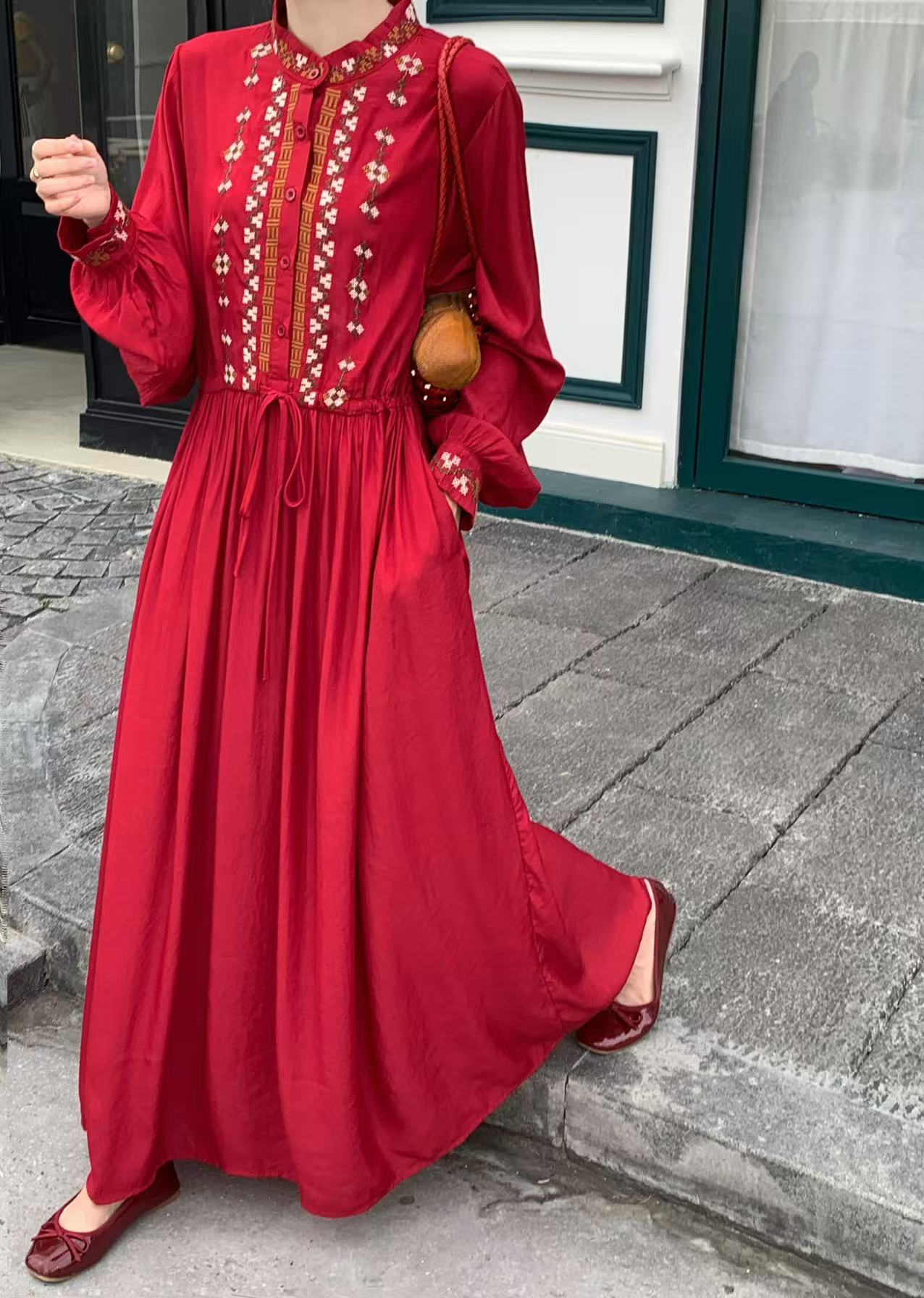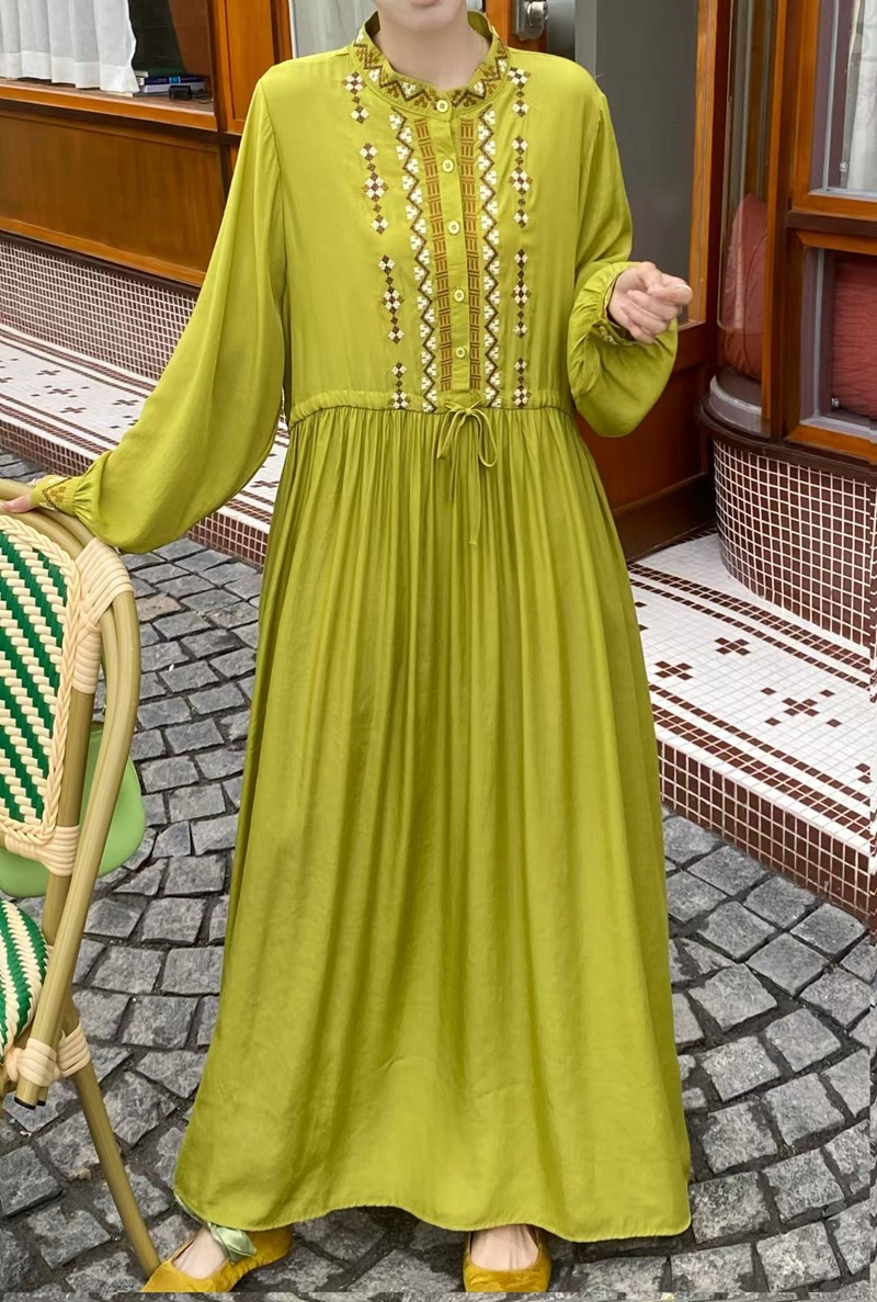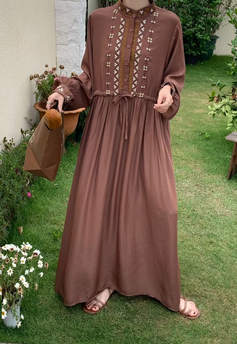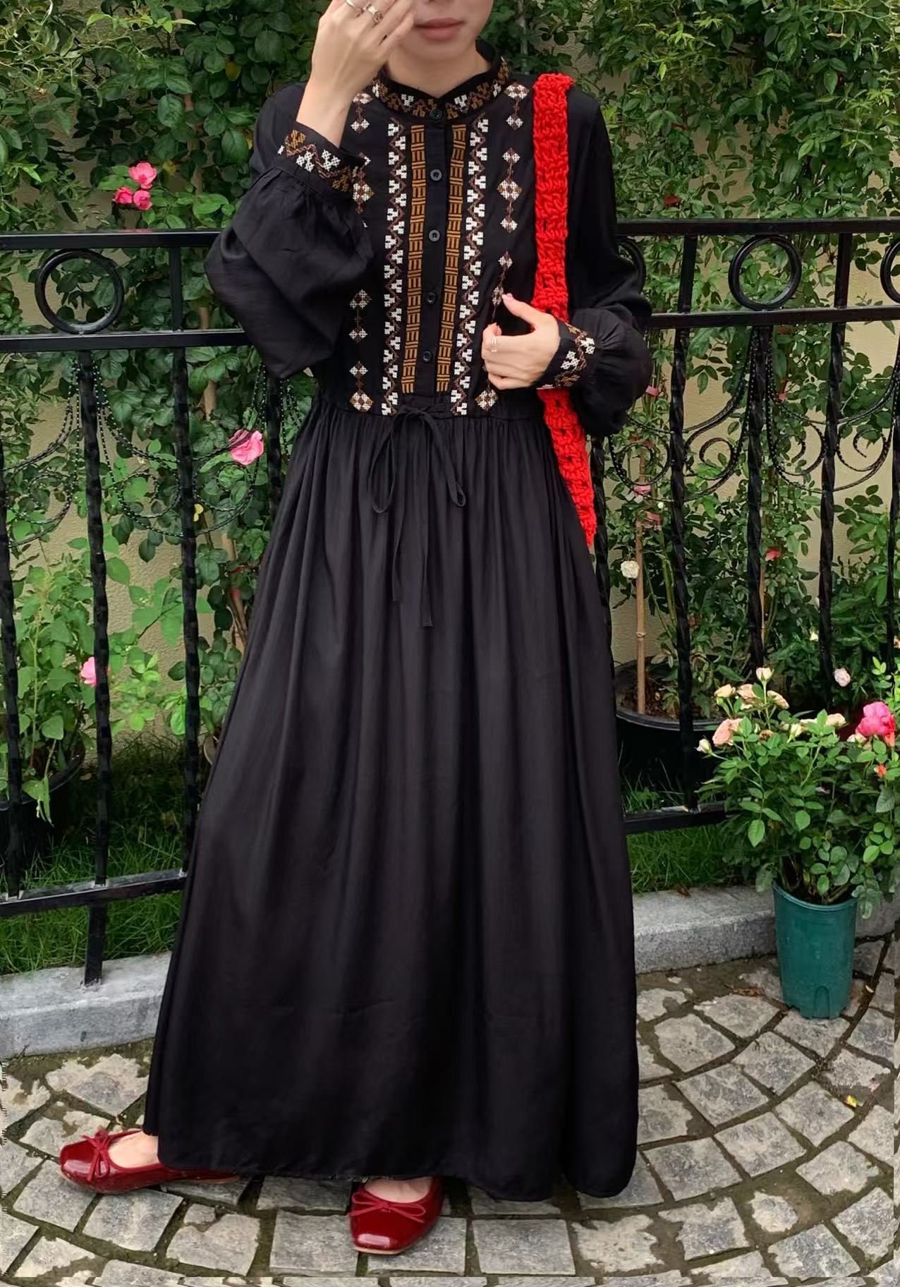 エレガントな民族風刺繍が美しいフレアシルエットのロングワンピース。 繊細な刺繍とふんわり袖が上品な印象を演出します。 ゆったりとした着心地で体型カバー効果も抜群。 秋冬コーディネートの主役として活躍する一着です。