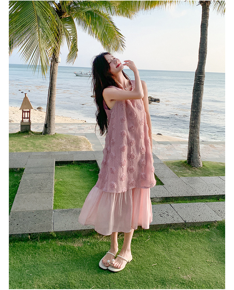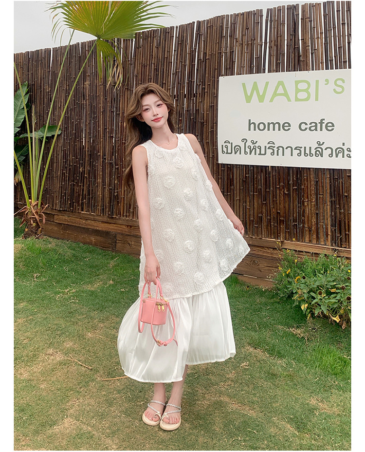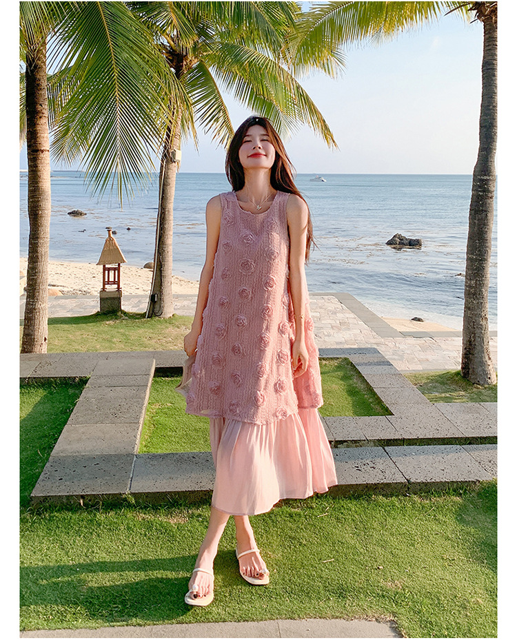 上品な立体フラワー柄が美しいノースリーブのロングワンピースです。