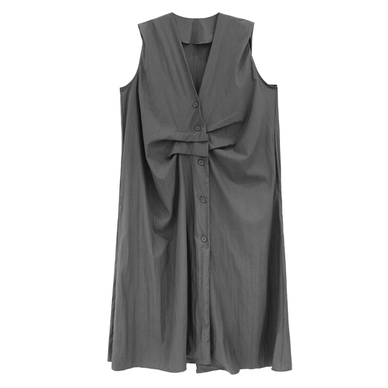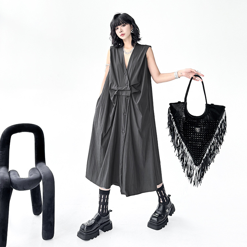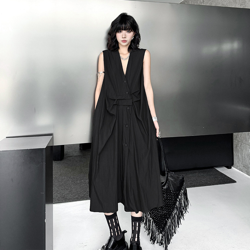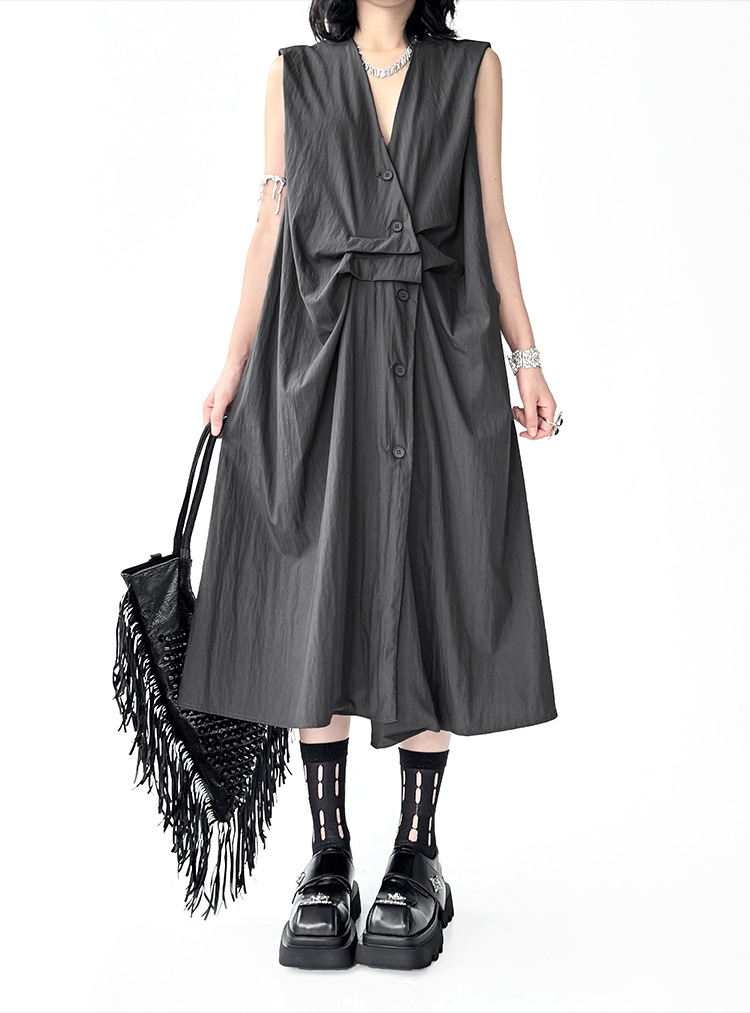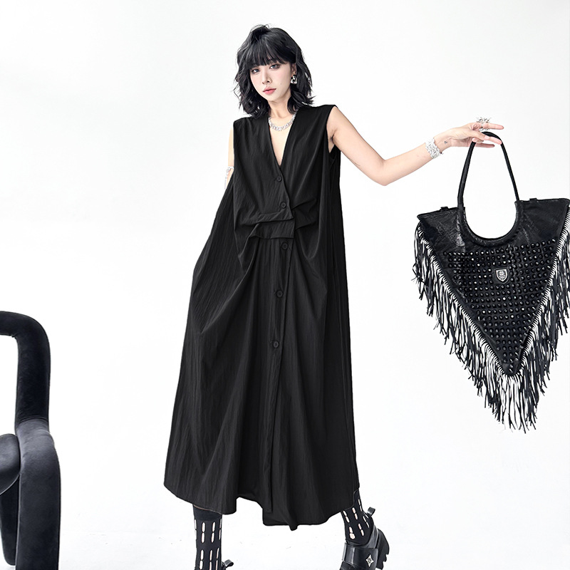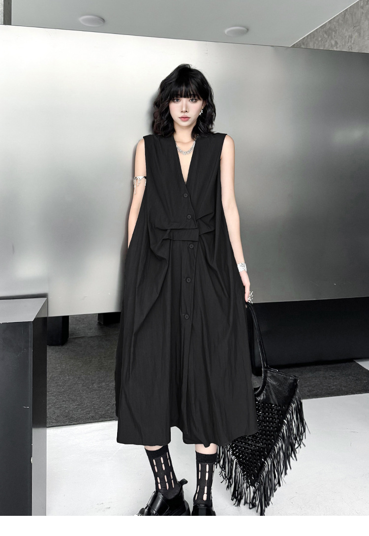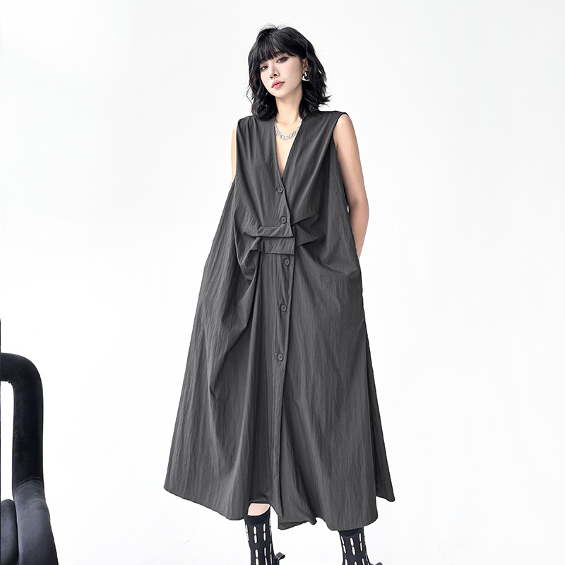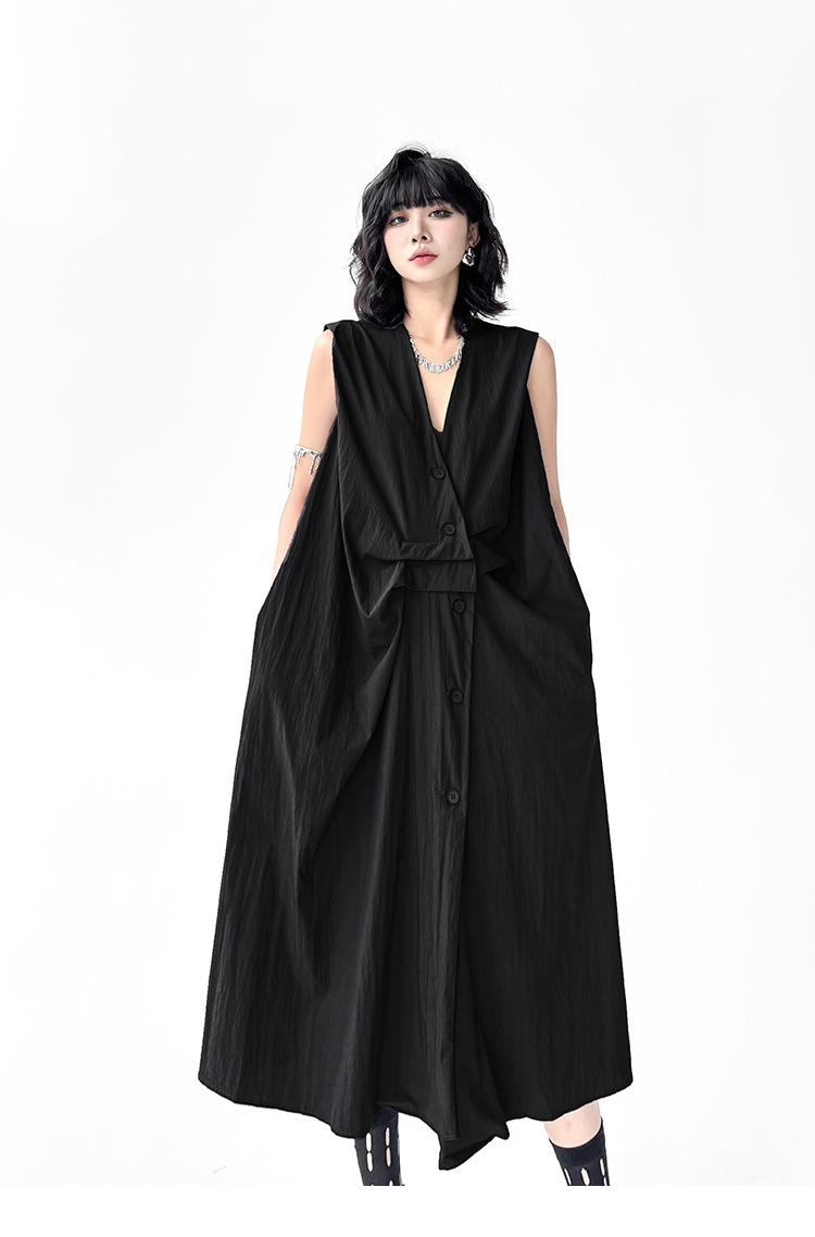 個性的なシルエットが魅力のノースリーブロングワンピース。