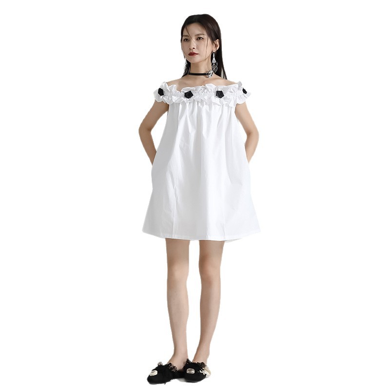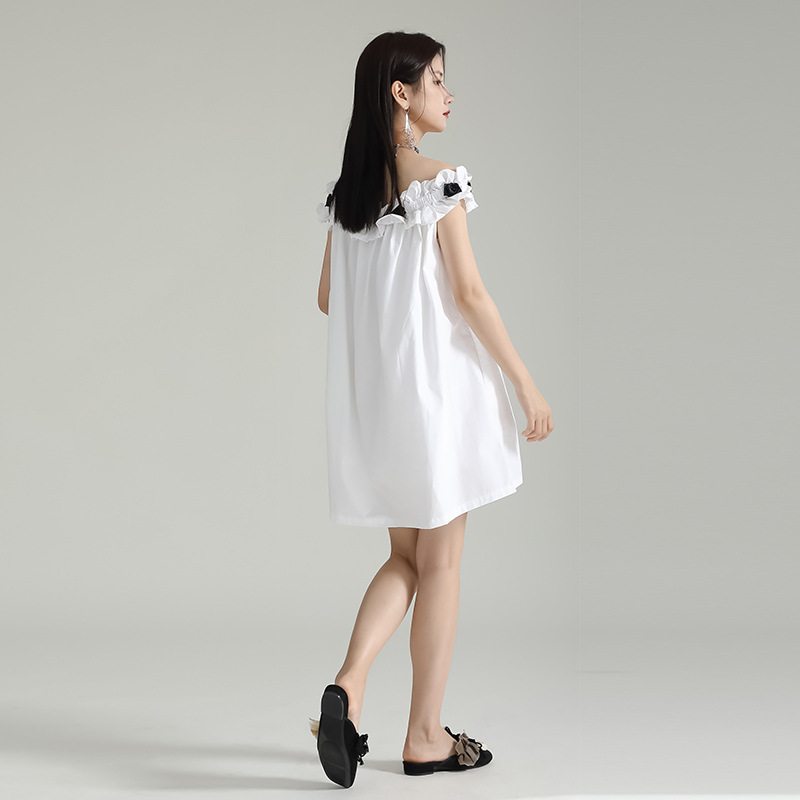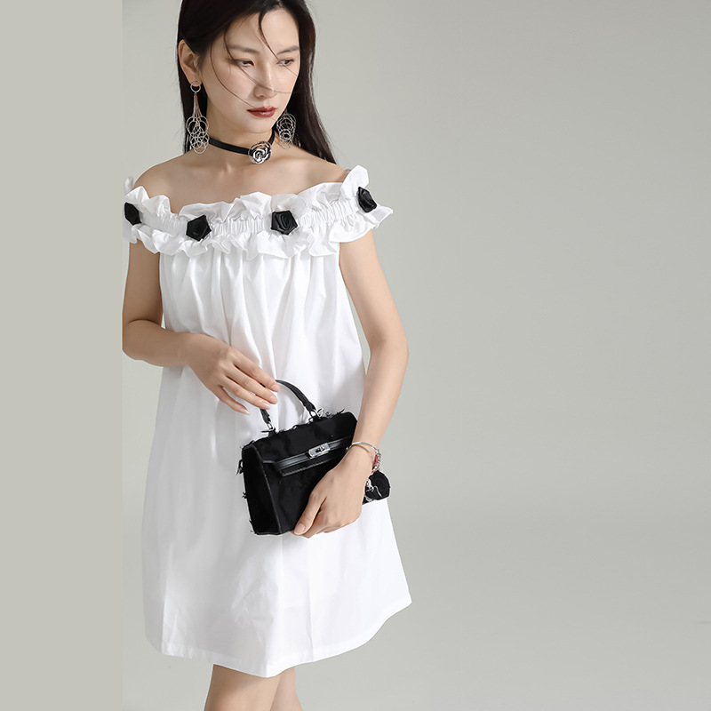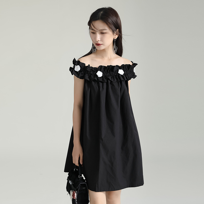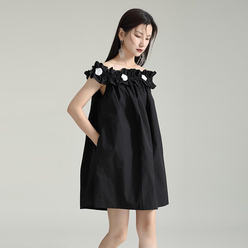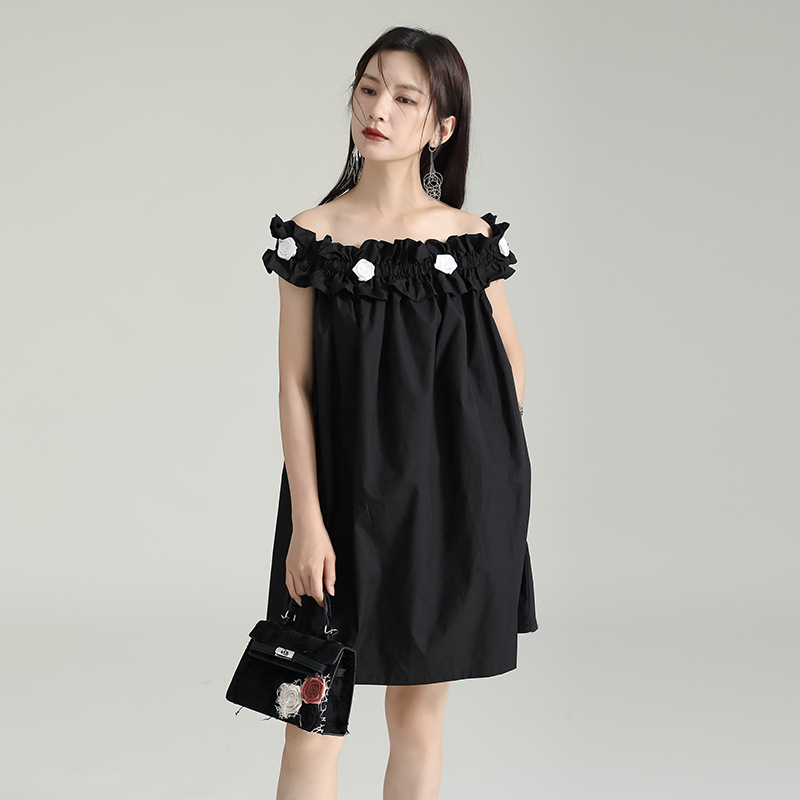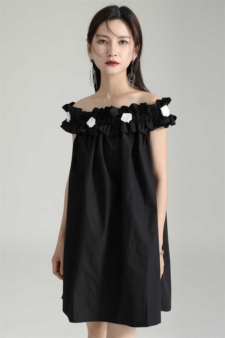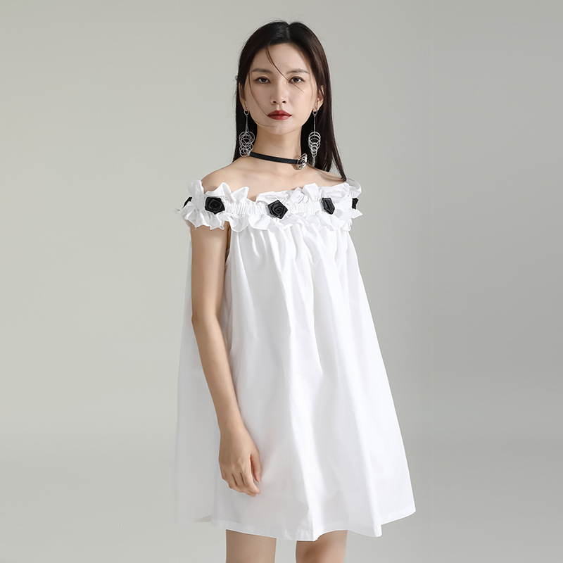 上品な立体花モチーフが印象的なオフショルダーデザインのノースリーブワンピース。