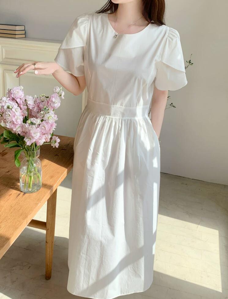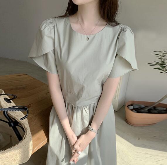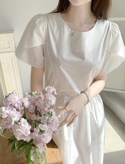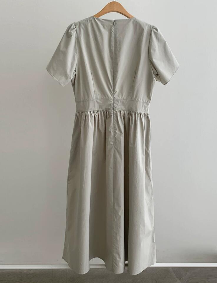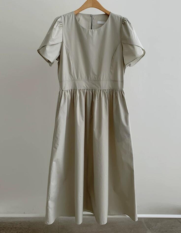 ウエスト部分の絞りが女性らしいシルエットを演出し、プリーツが優雅な印象を与えます。