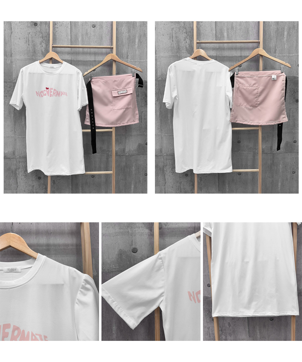 半袖ロング丈の文字ロゴワンピースとラップ巻き風フレアミニスカートがセットになった、個性的でおしゃれな二点組み合わせ。