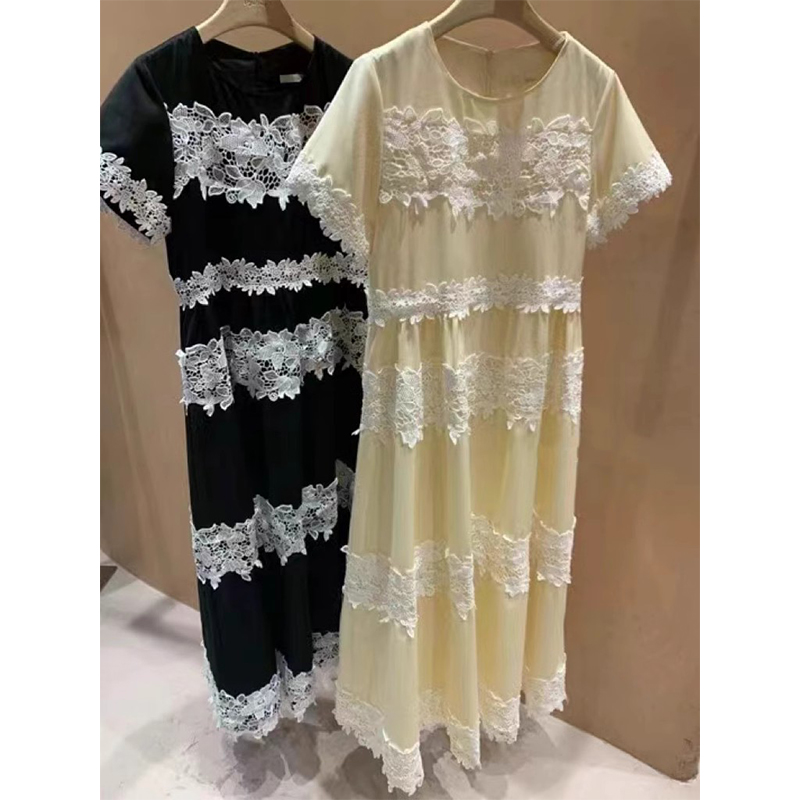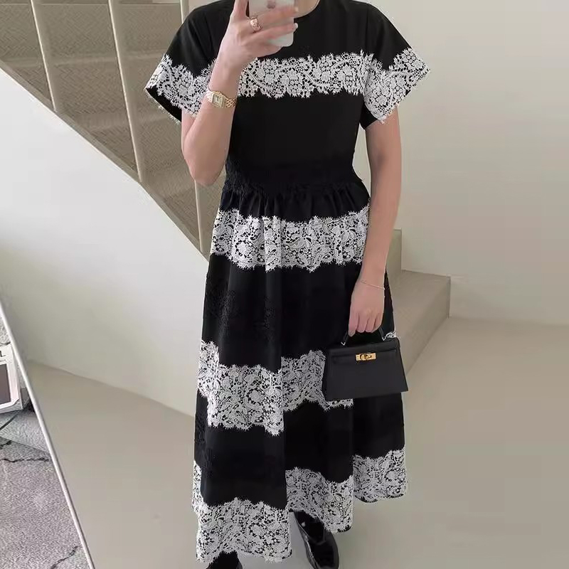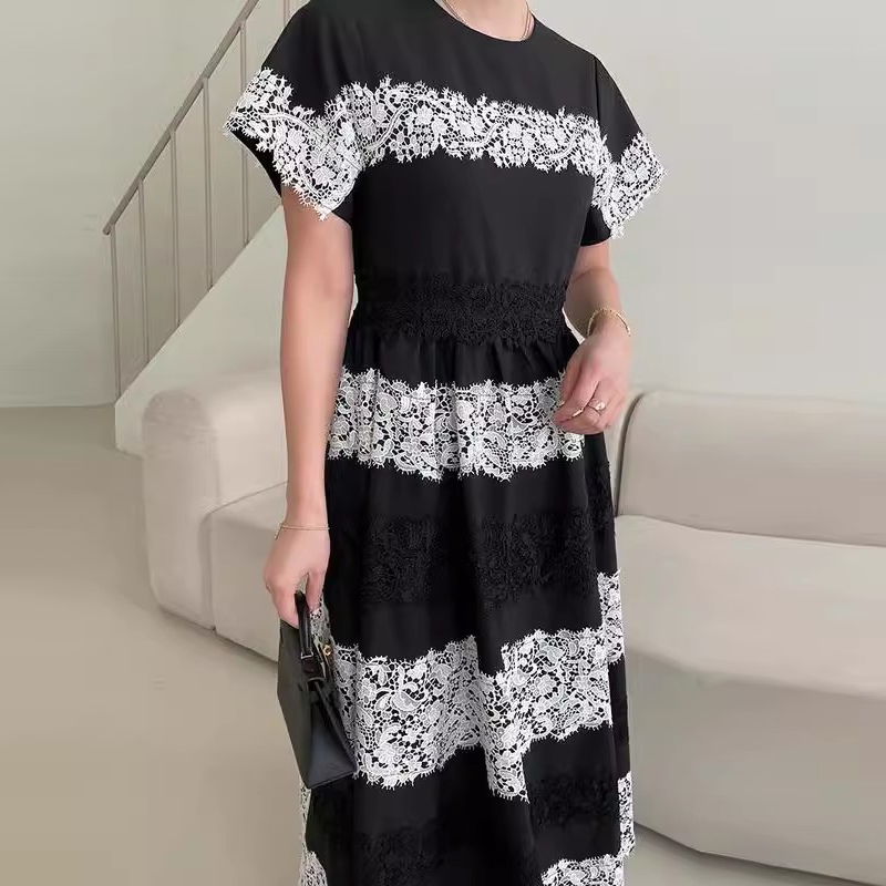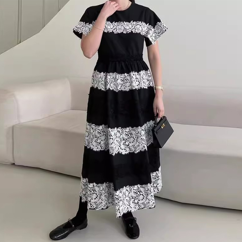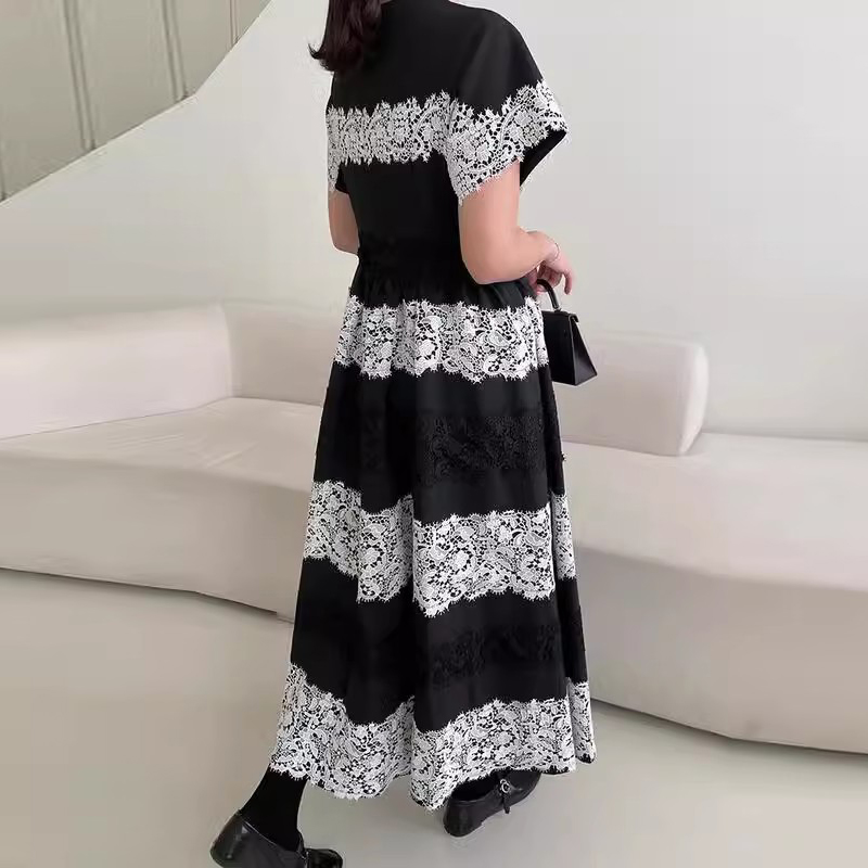 国内倉庫から発送される魅力的なフレアロングワンピースです。 黒と白のレースが交互に配された上品なデザインと高品質な素材が特徴的。 ご入金確認後、迅速に発送いたします。 日常使いから特別なお出かけまで幅広く活躍する一枚です。