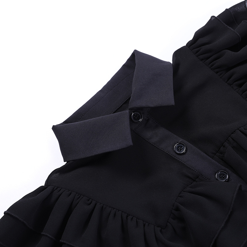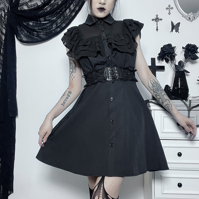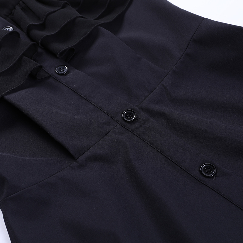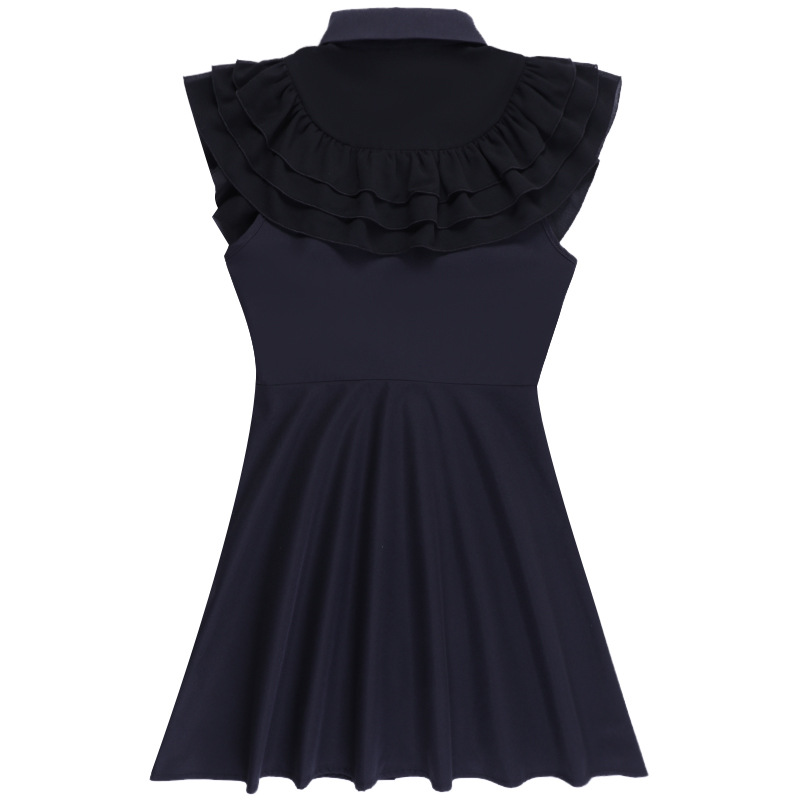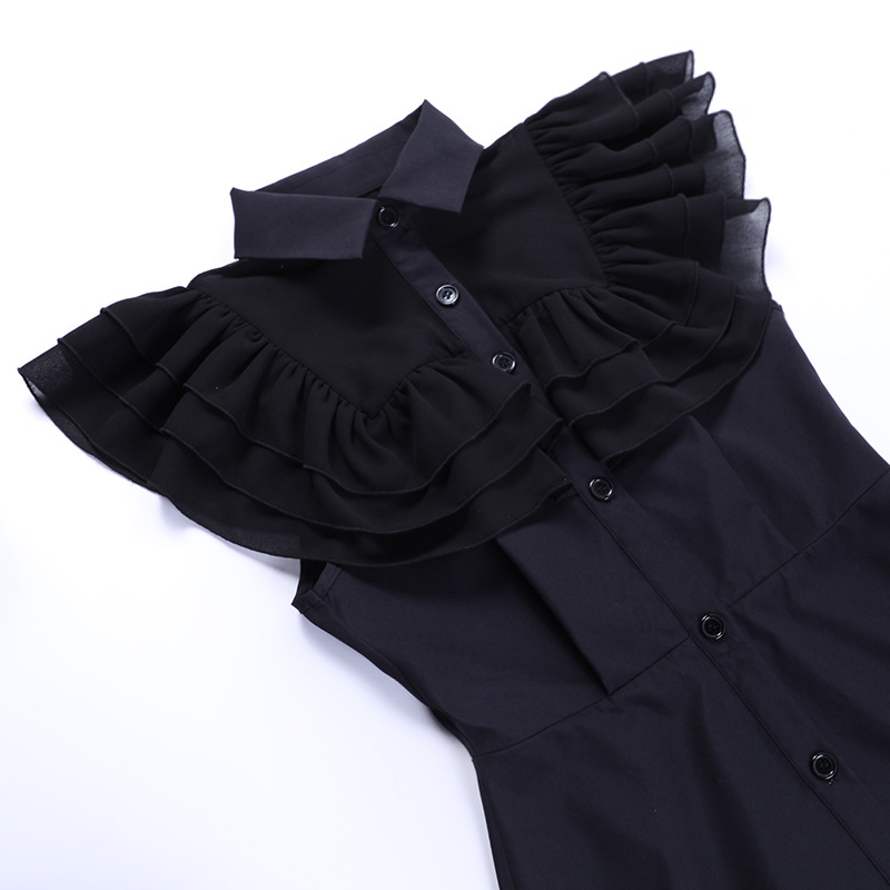 上品な黒色のノースリーブワンピースで、胸元の華やかなフリル装飾が印象的なデザインです。