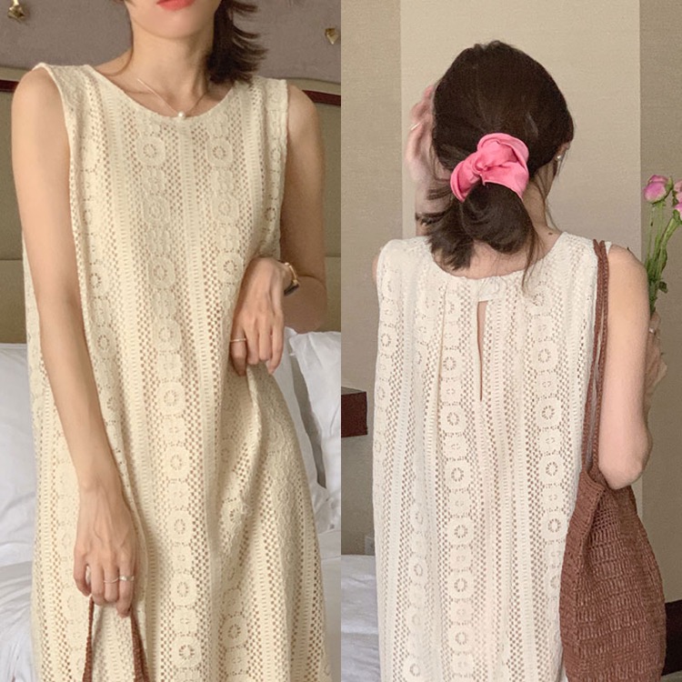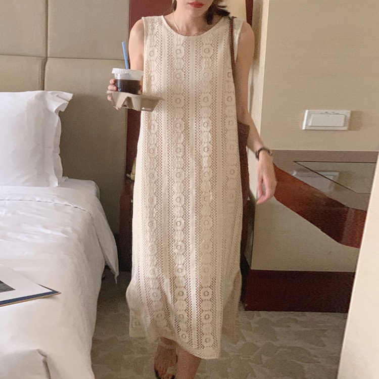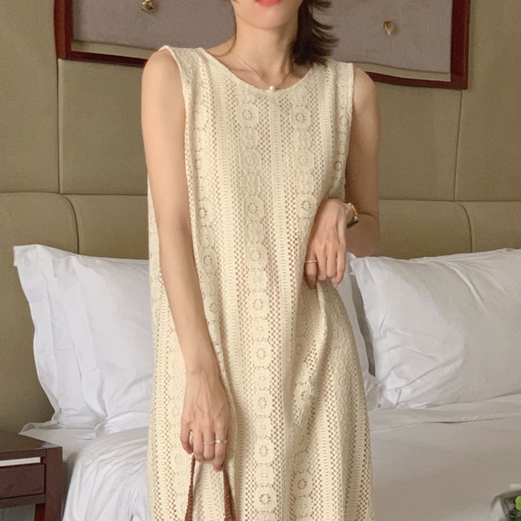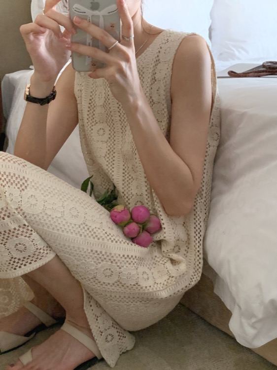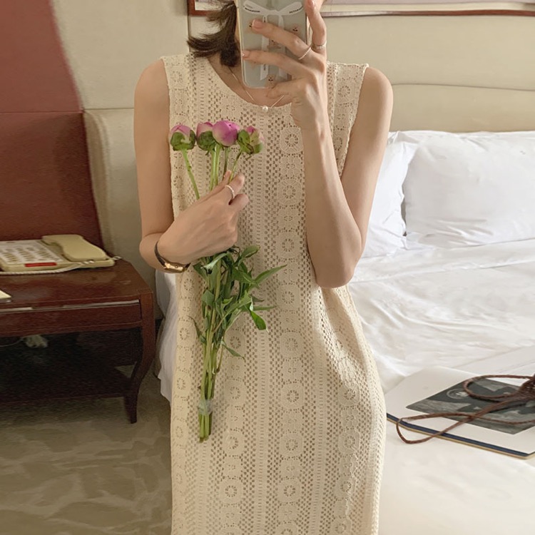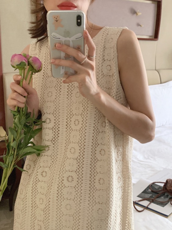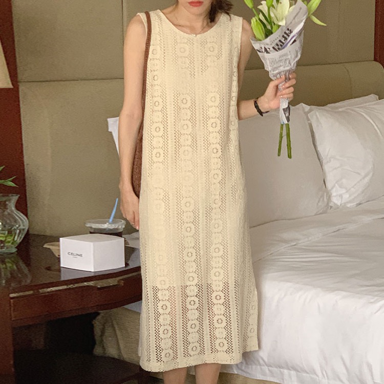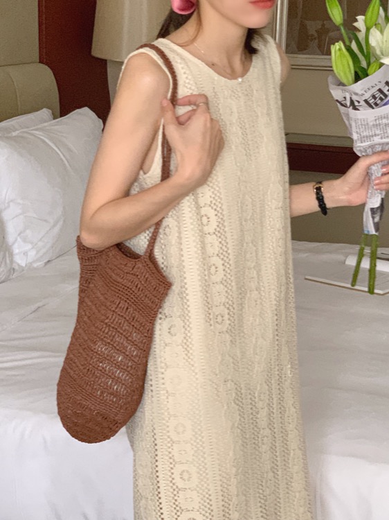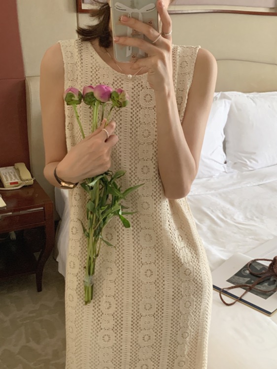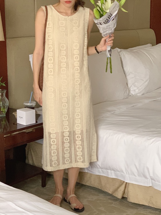 上品なレース編みが美しいノースリーブのロングワンピースです。