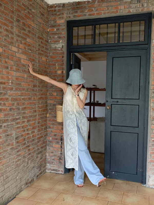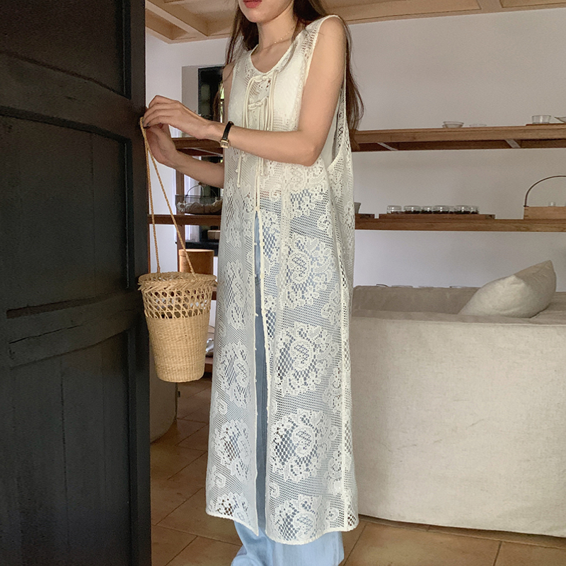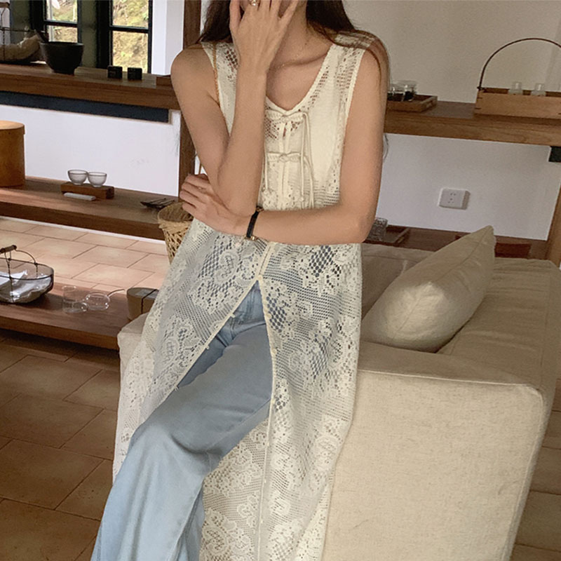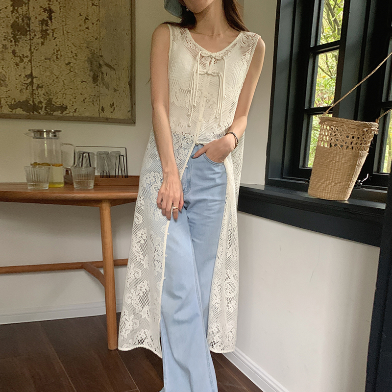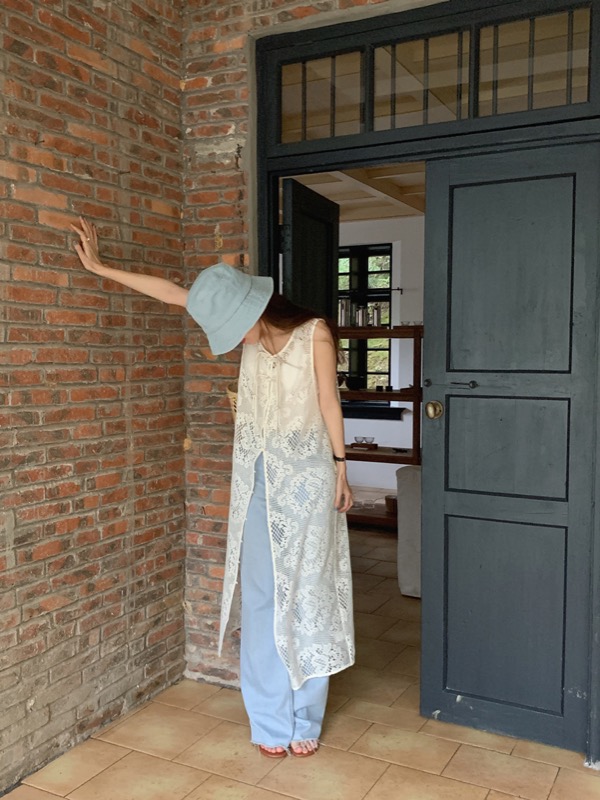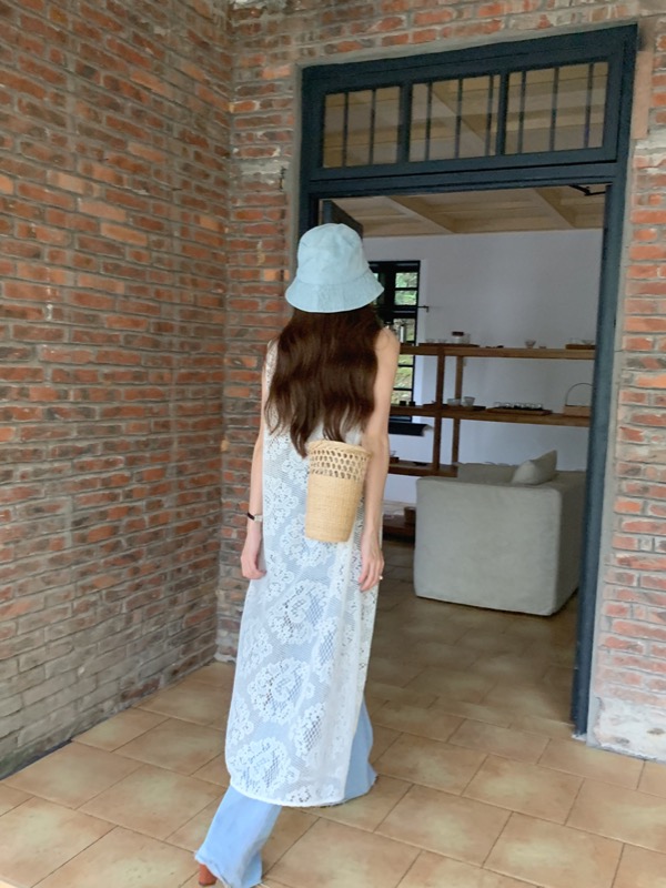 繊細な透かし編みが美しいロングワンピースです。ノースリーブで涼しく、スタイリッシュな着心地を提供します。