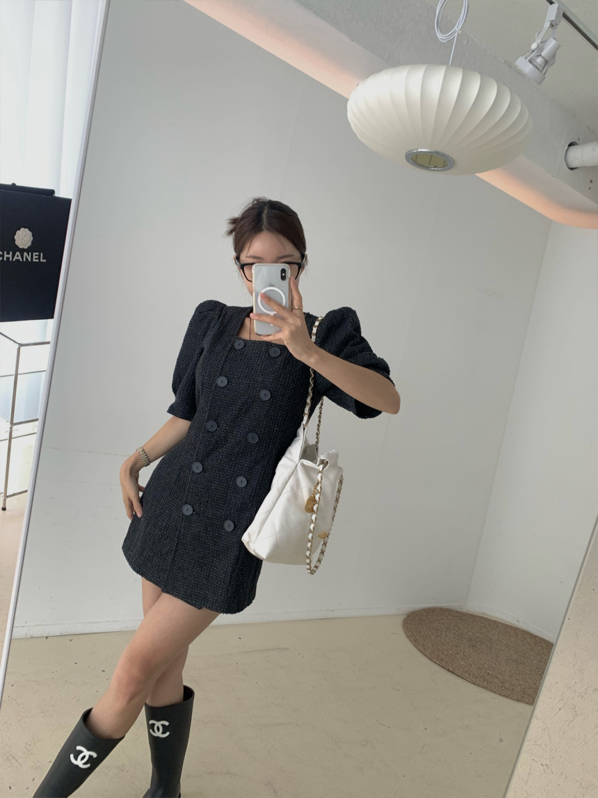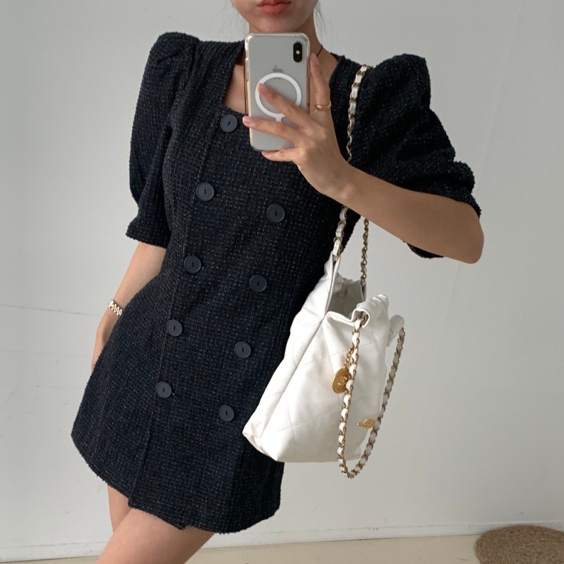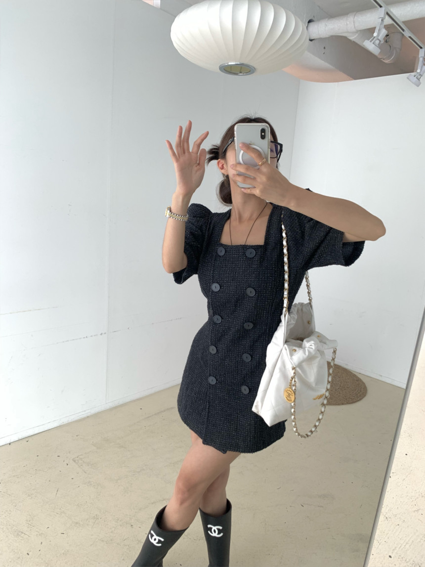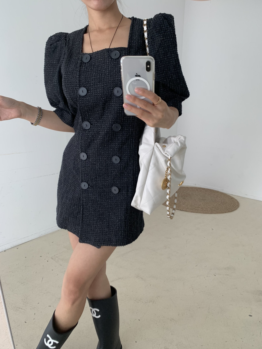 スクエアネックとダブルボタンが上品な印象を演出し、パフスリーブが女性らしさをプラス。