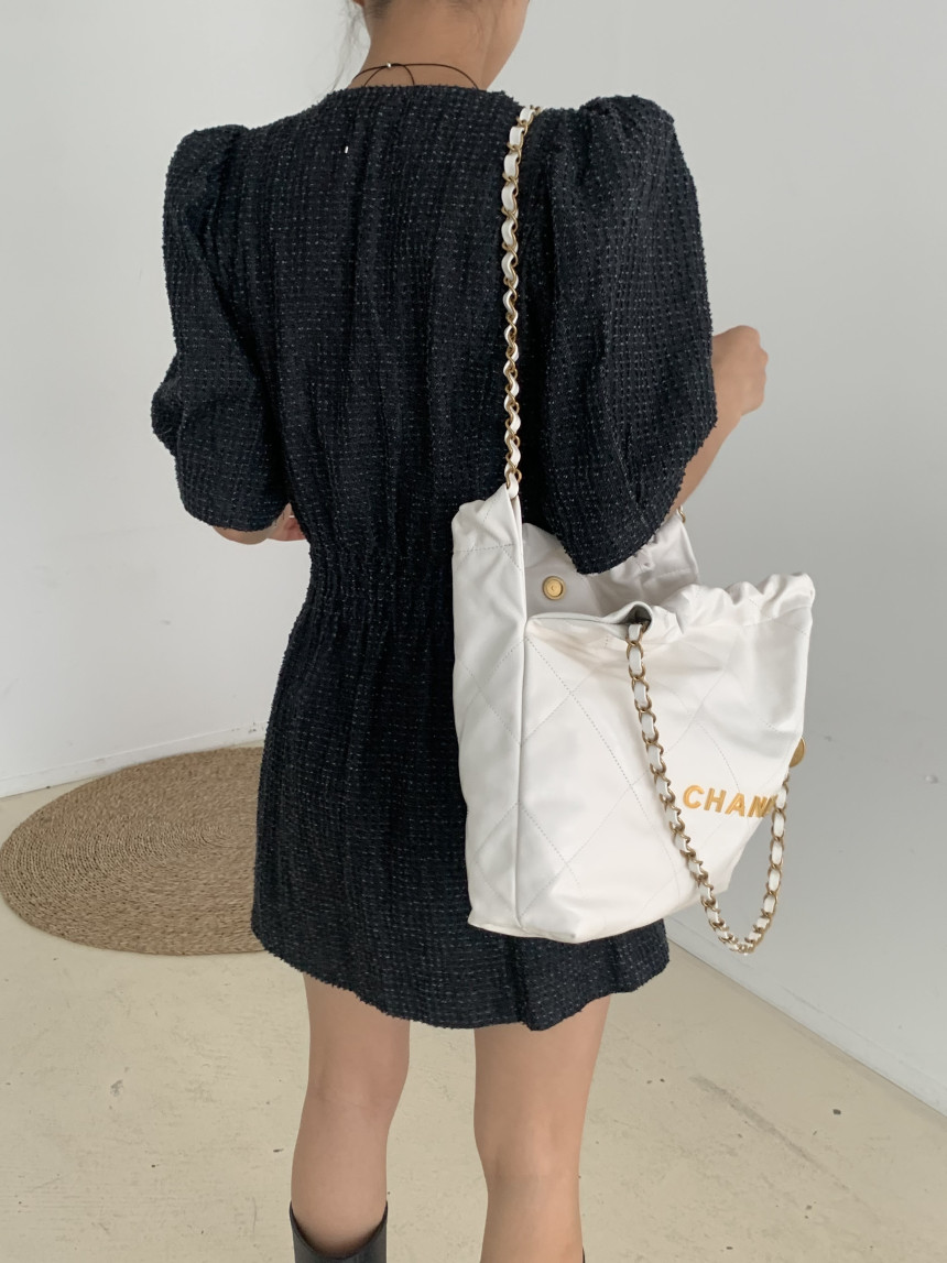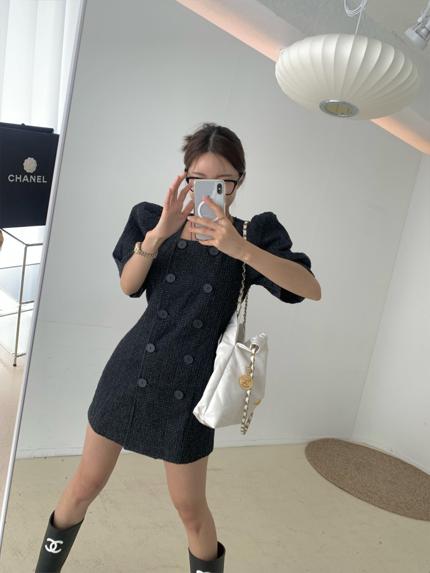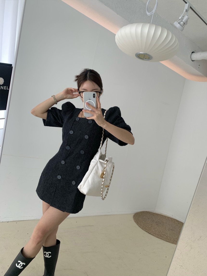 スクエアネックとダブルボタンが上品な印象を演出し、パフスリーブが女性らしさをプラス。