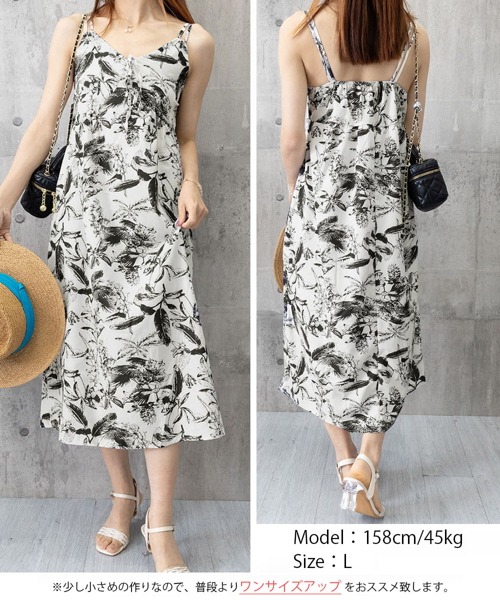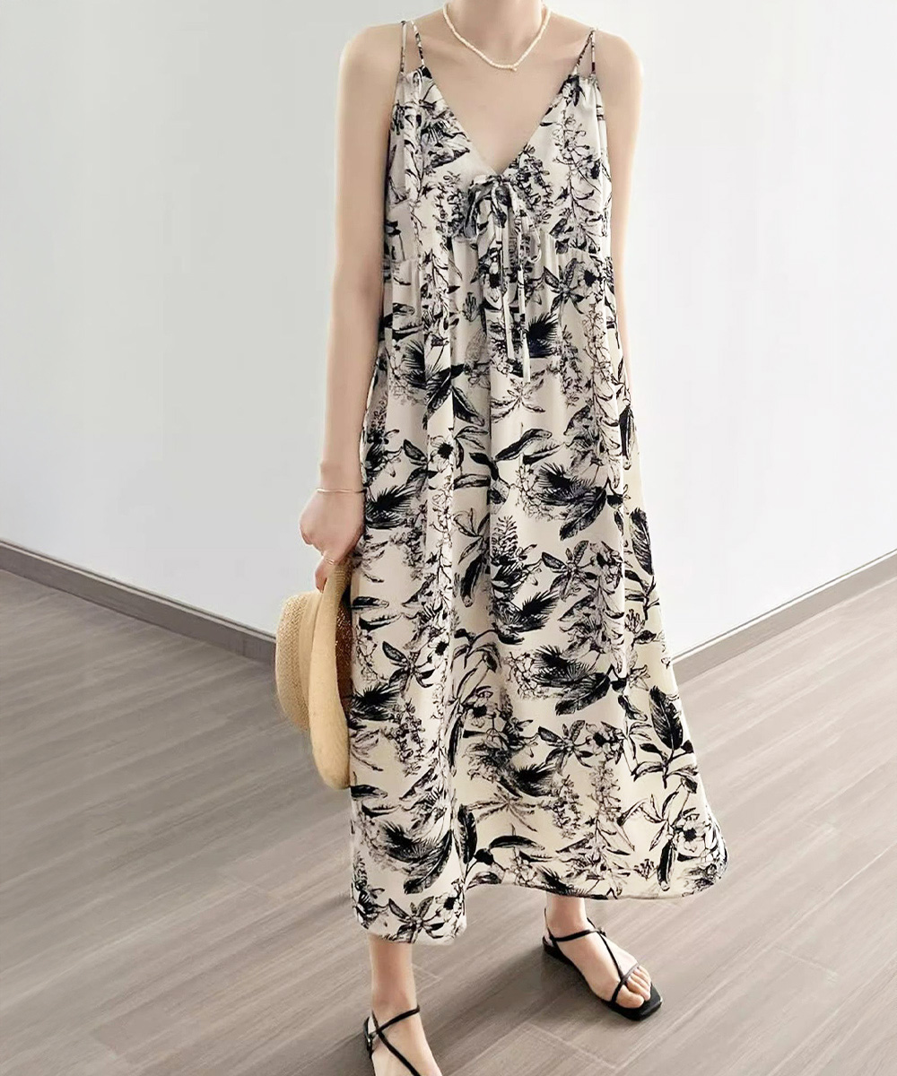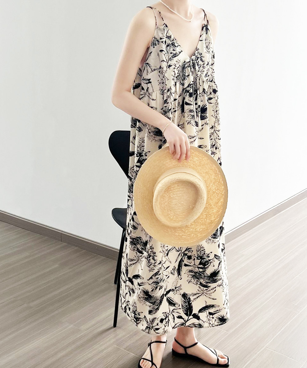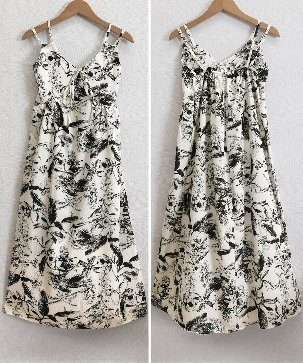 夏の涼やかな装いにぴったりな花鳥風月柄のキャミソールワンピース。