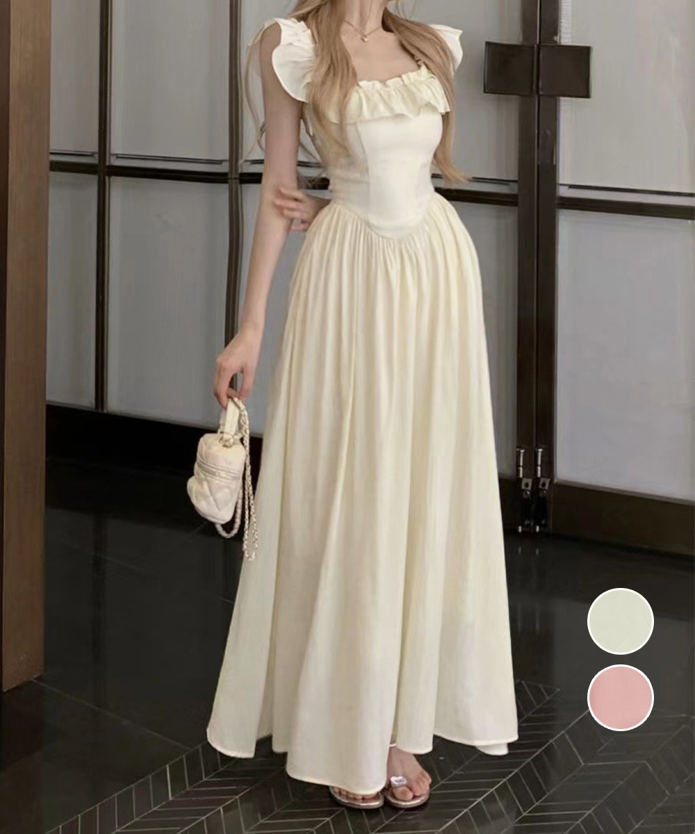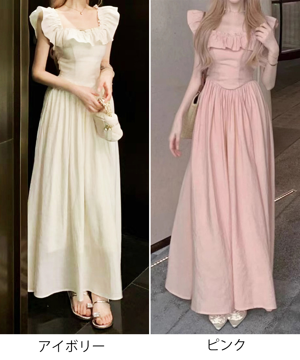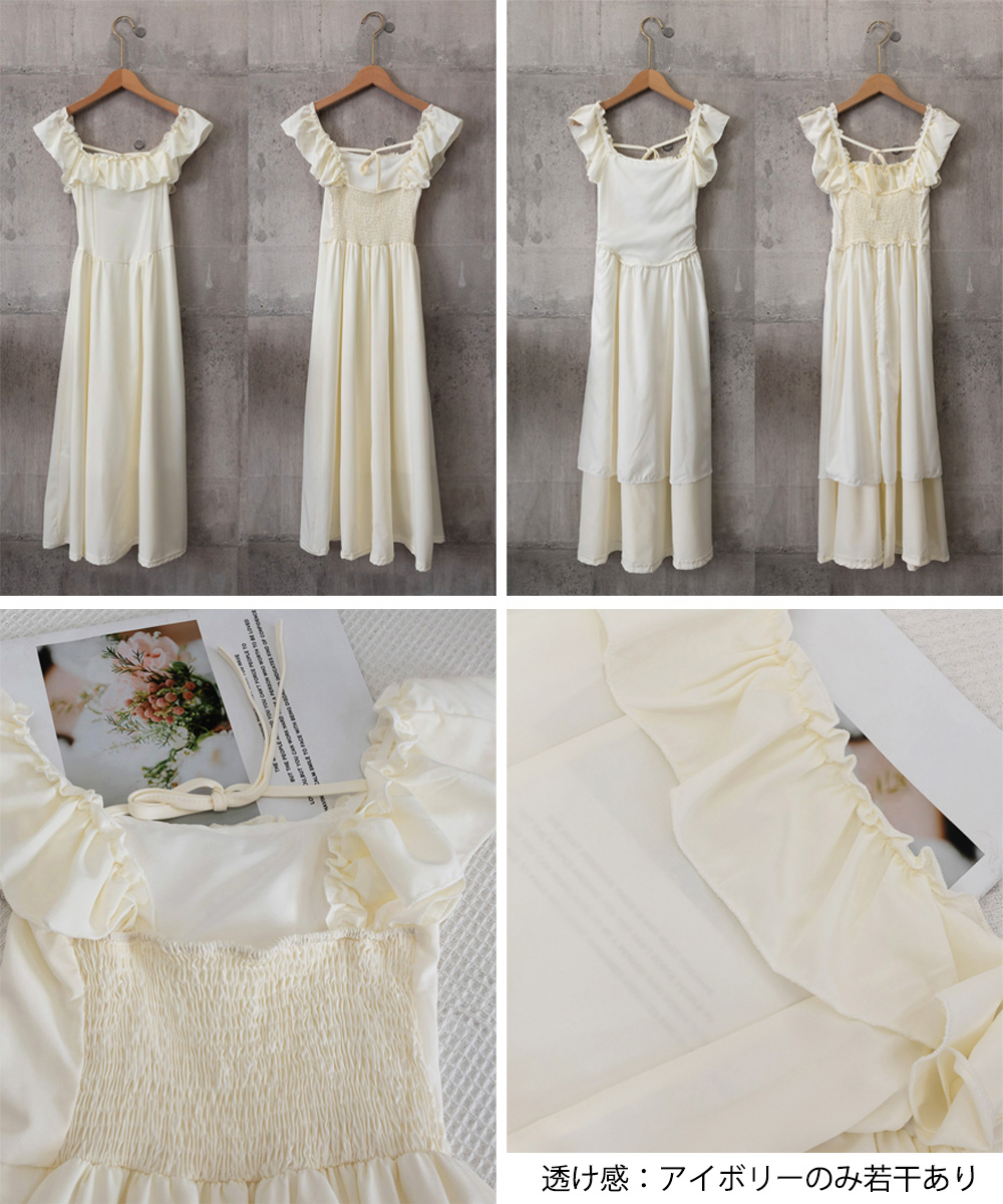 素材:ポリエステル100%。カラー:アイボリー/ピンク。サイズ:S/M。 [S]総丈:約113cm 裏地丈:約54cm 袖丈:約8cm 身幅:約30cm 胸囲(シャーリング仕様):約60-88cm ウエスト(ゴム仕様):約56-84cm ヒップ:約134cm。 [M]総丈:約117cm 裏地丈:約58cm 袖丈:約8cm 身幅:約32cm 胸囲(シャーリング仕様):約64-92cm ウエスト(ゴム仕様):約60-88cm ヒップ:約140cm。裏地:あり。伸縮性:シャーリング部分のみあり。透け感:アイボリーのみ若干あり。※すべて平置きサイズです(採寸方法違いより、多少の誤差がございますので、ご了承ください)。