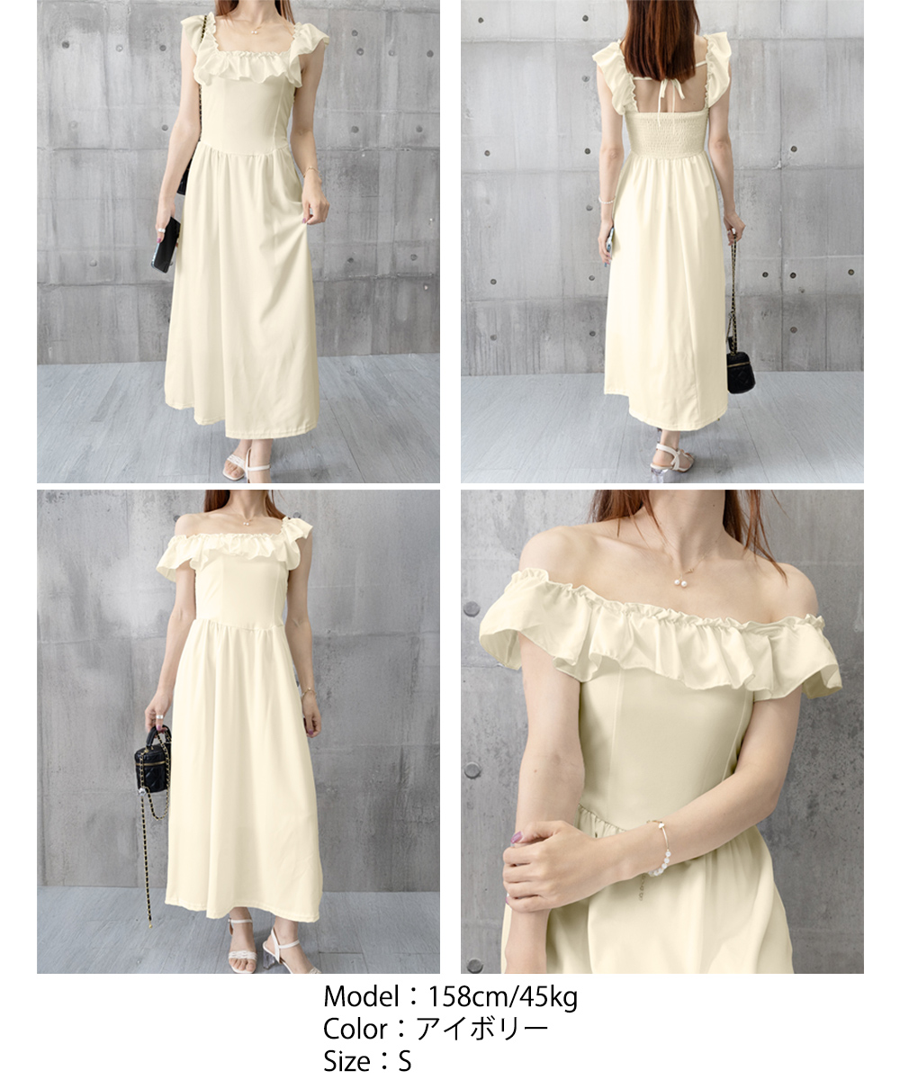 胸元のフリルデザインと肩の立体的なフリルが女性らしさを演出し、細見え効果も抜群。
