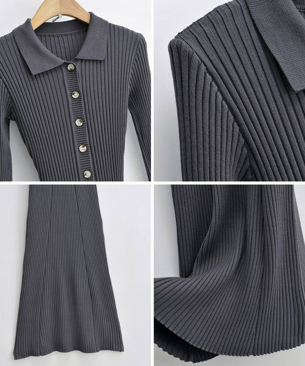 襟元が上品に開くことでデコルテラインが美しく見え、リブニット素材がごちゃつきやすい体型もすっきり見せます。