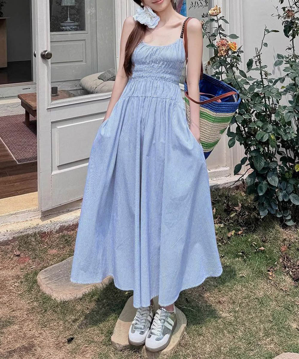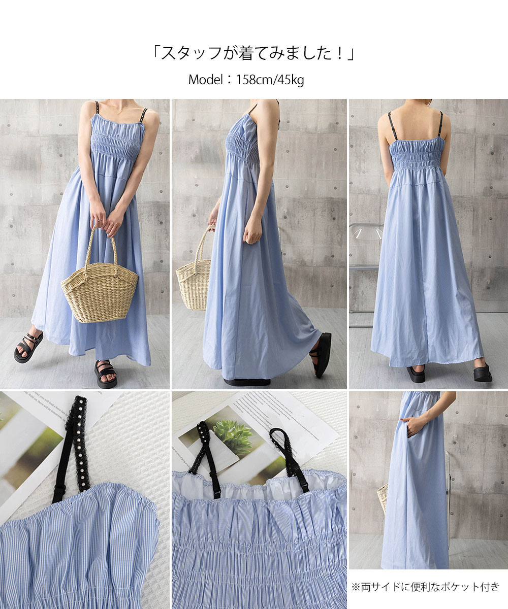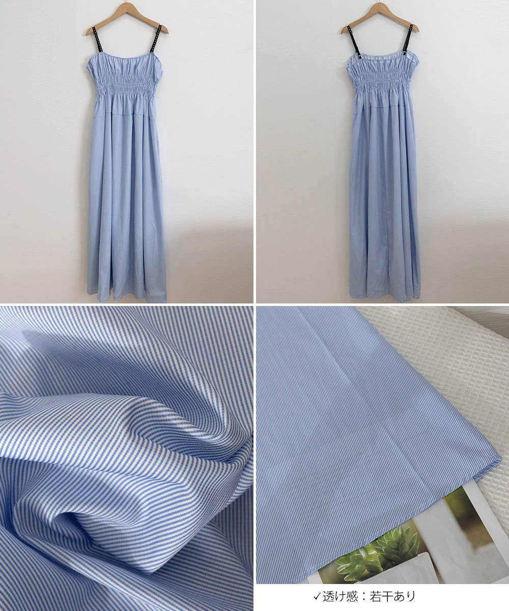 爽やかなストライプ柄が印象的な、大人可愛いキャミロングワンピース。
