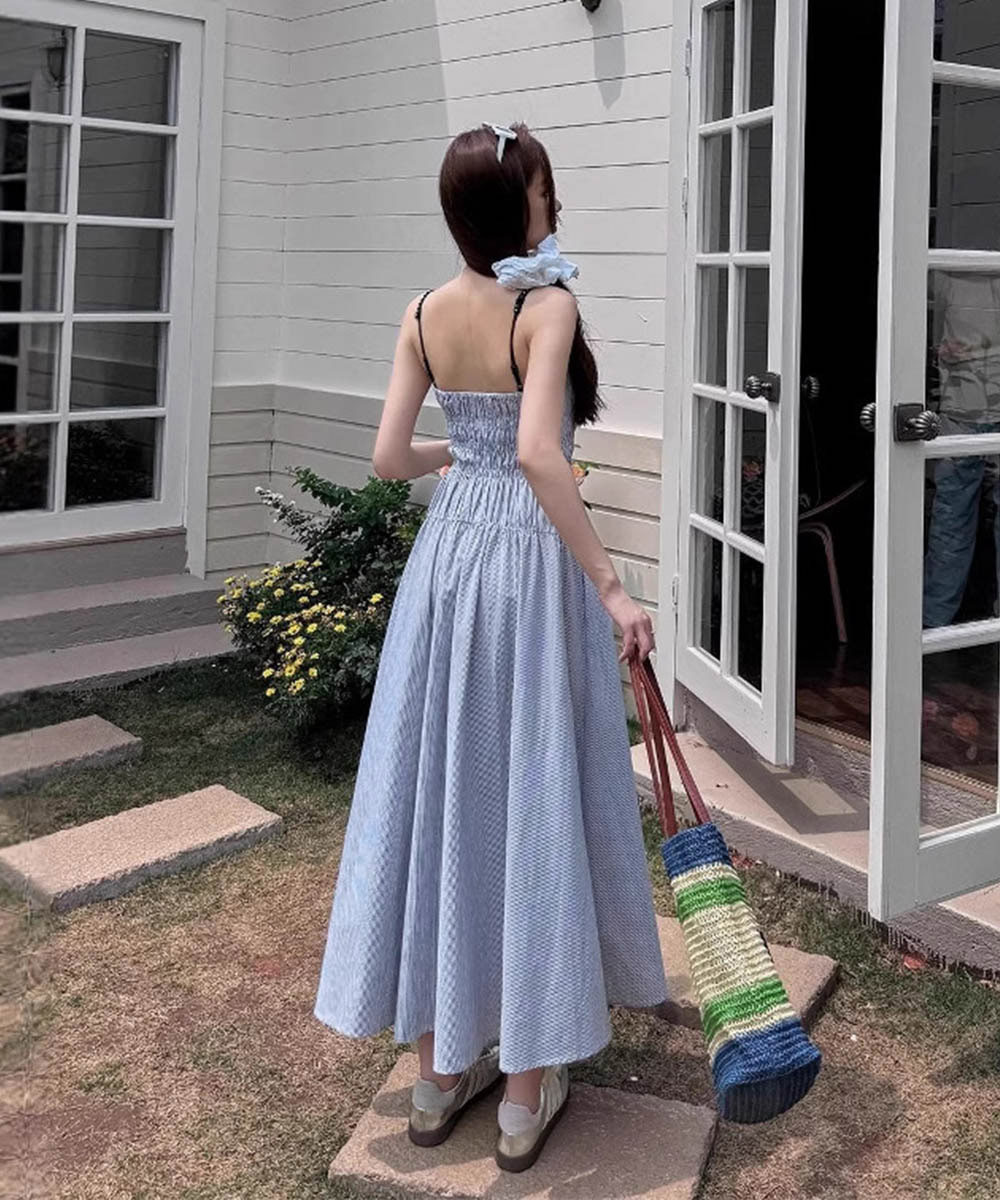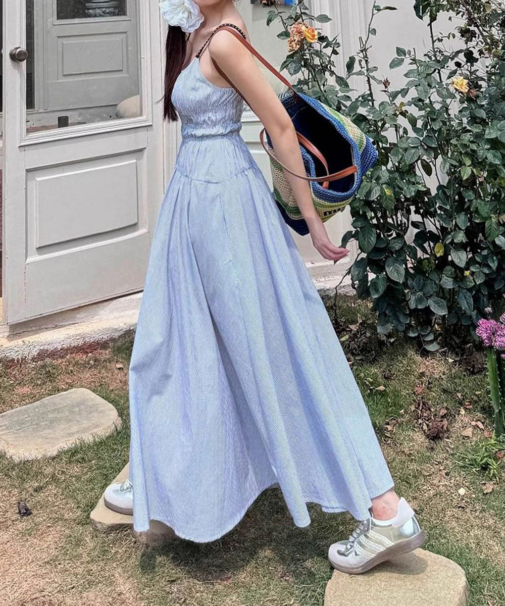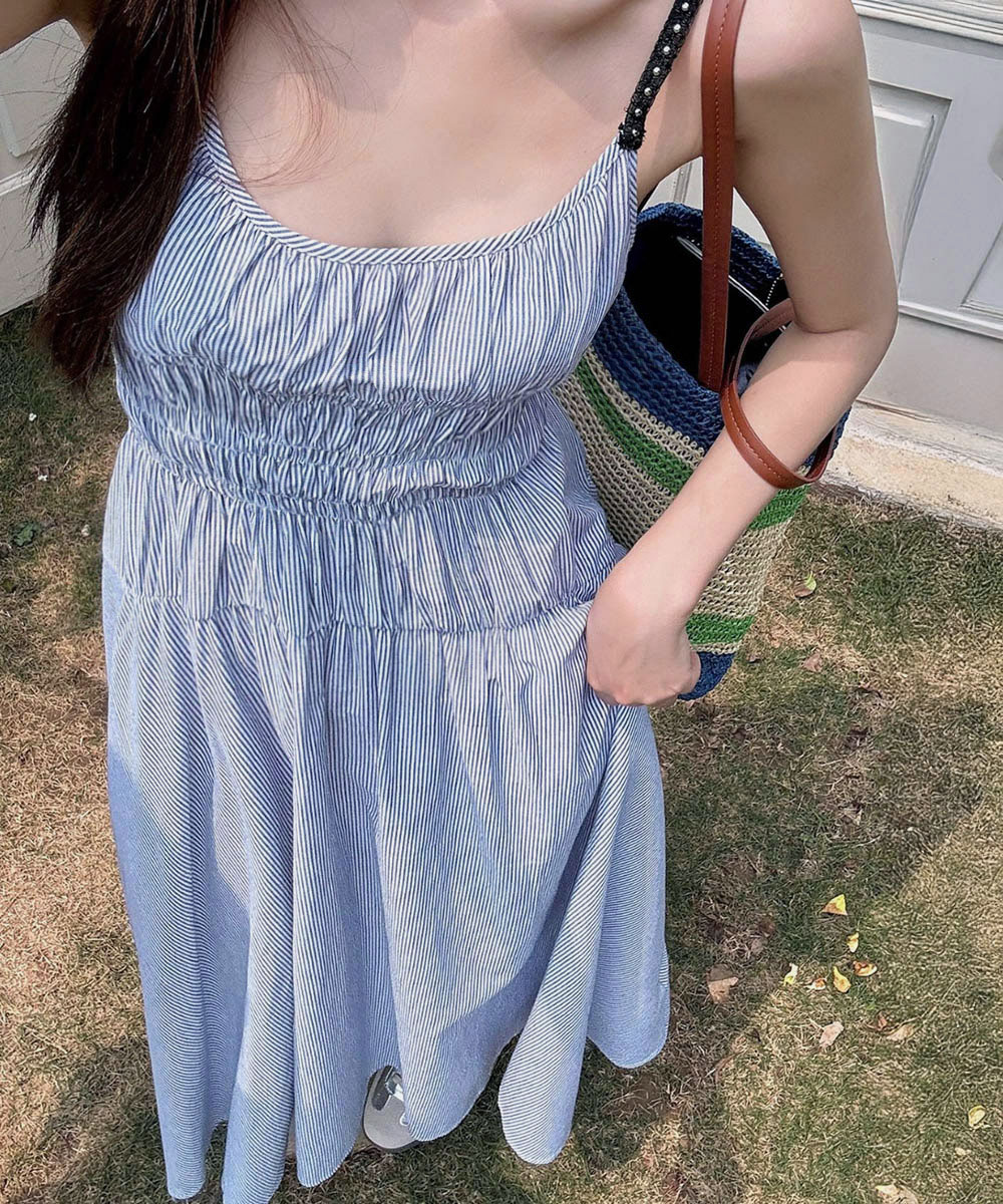 爽やかなストライプ柄が印象的な、大人可愛いキャミロングワンピース。