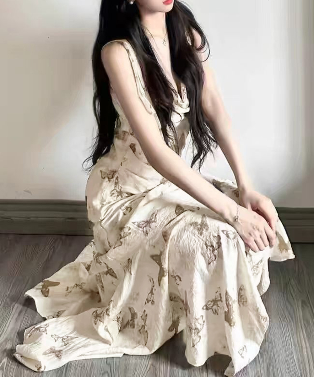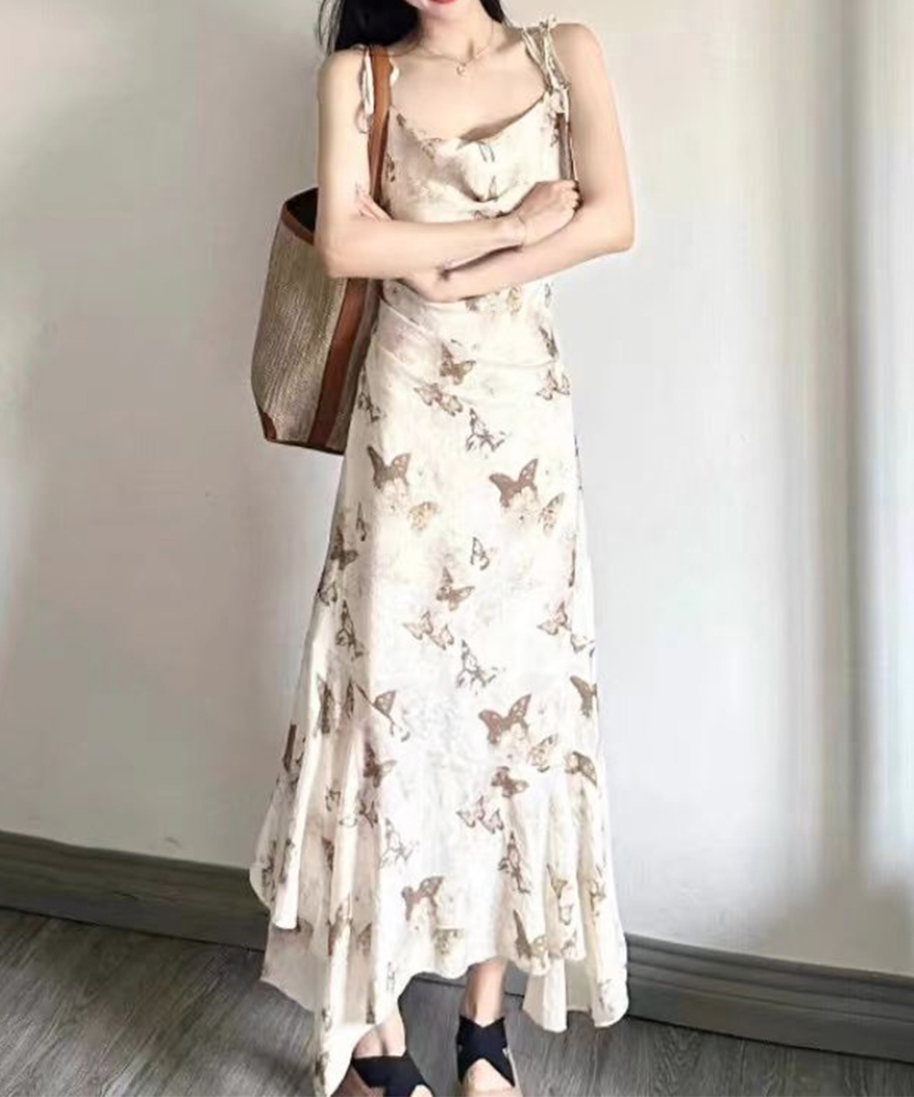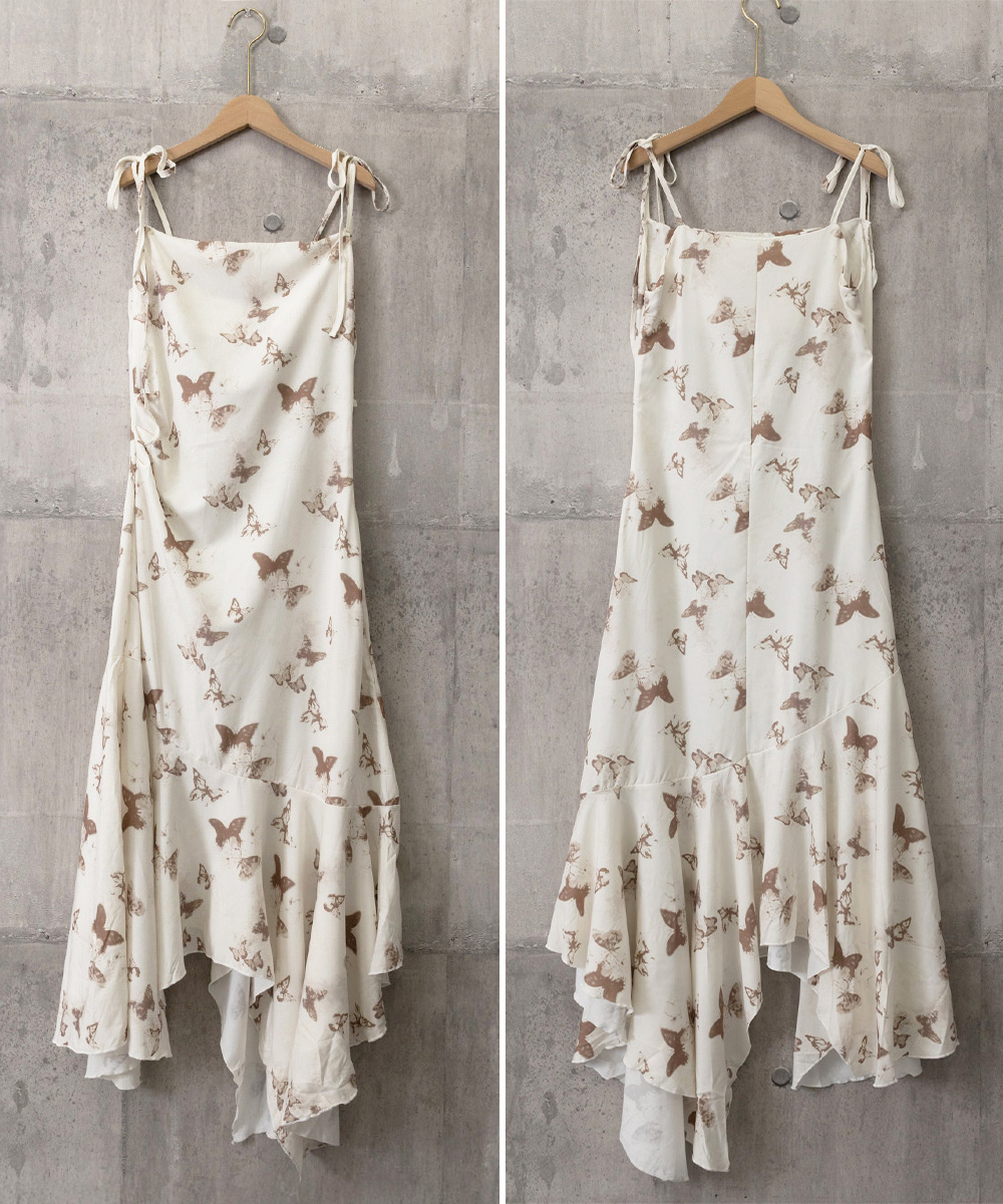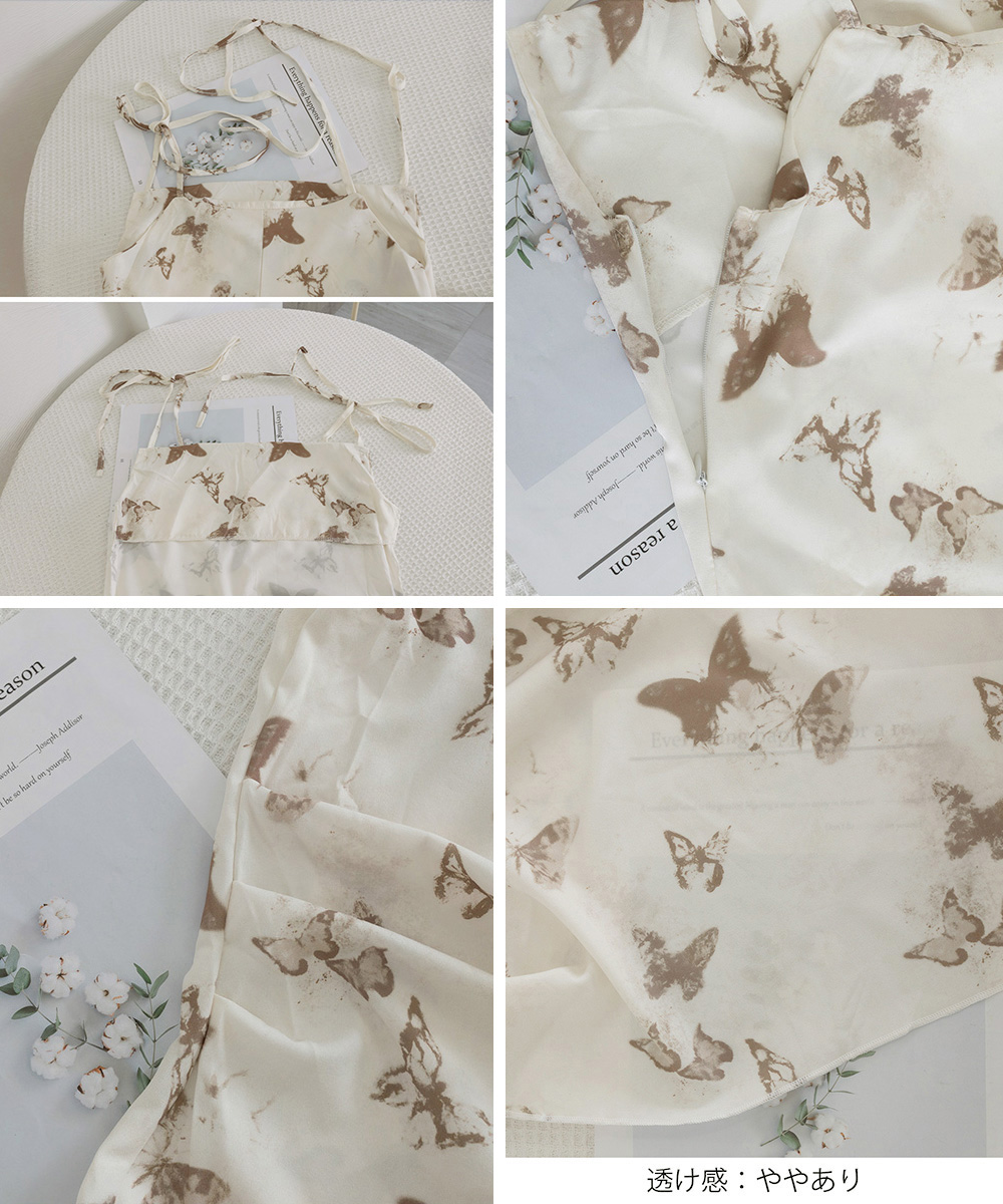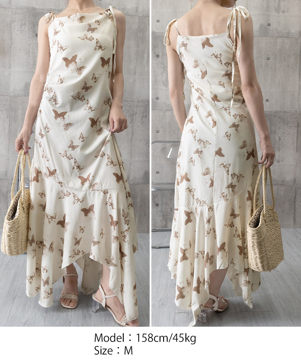 蝶柄が華やかな印象を演出する、女性らしいキャミタイプのロングワンピース。