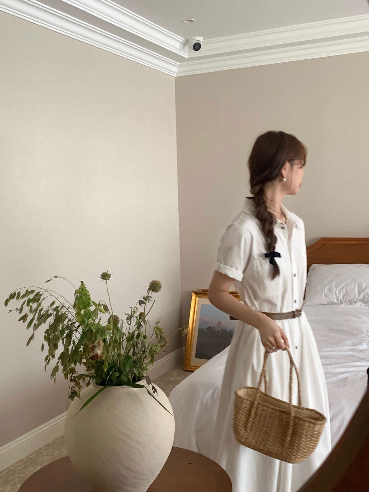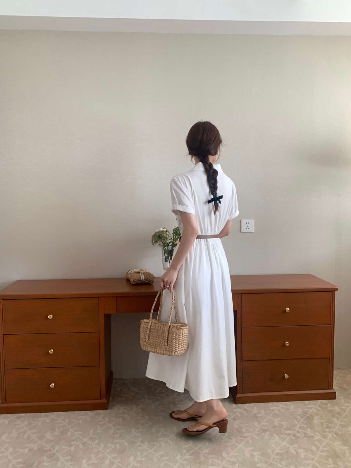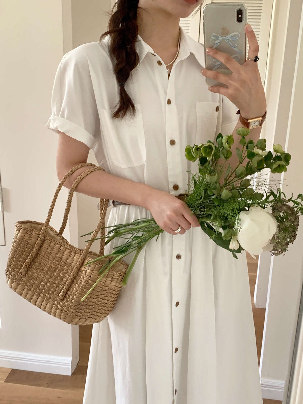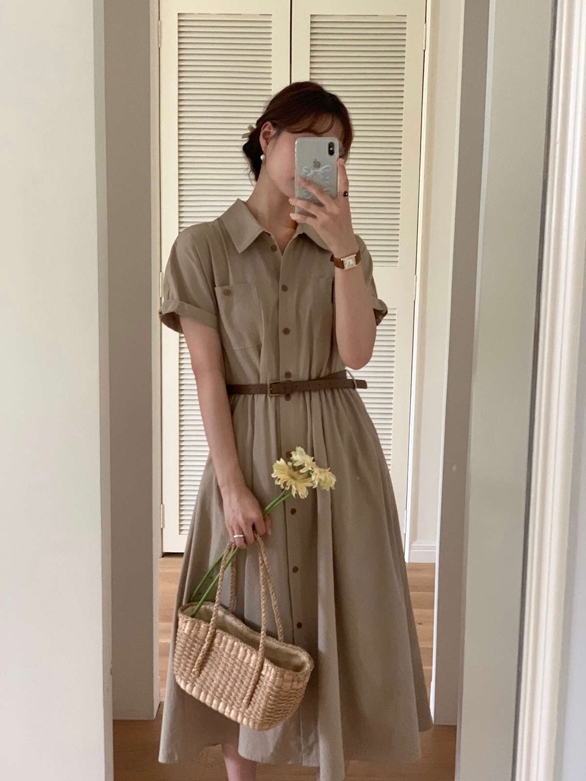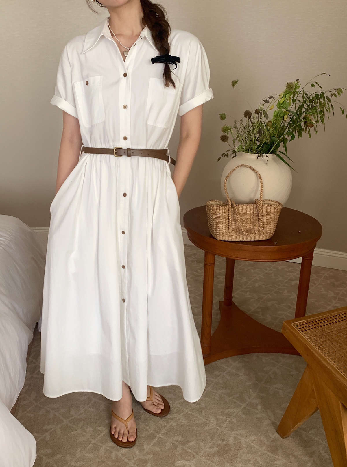 上品な韓国風デザインのシャツタイプロングワンピースです。