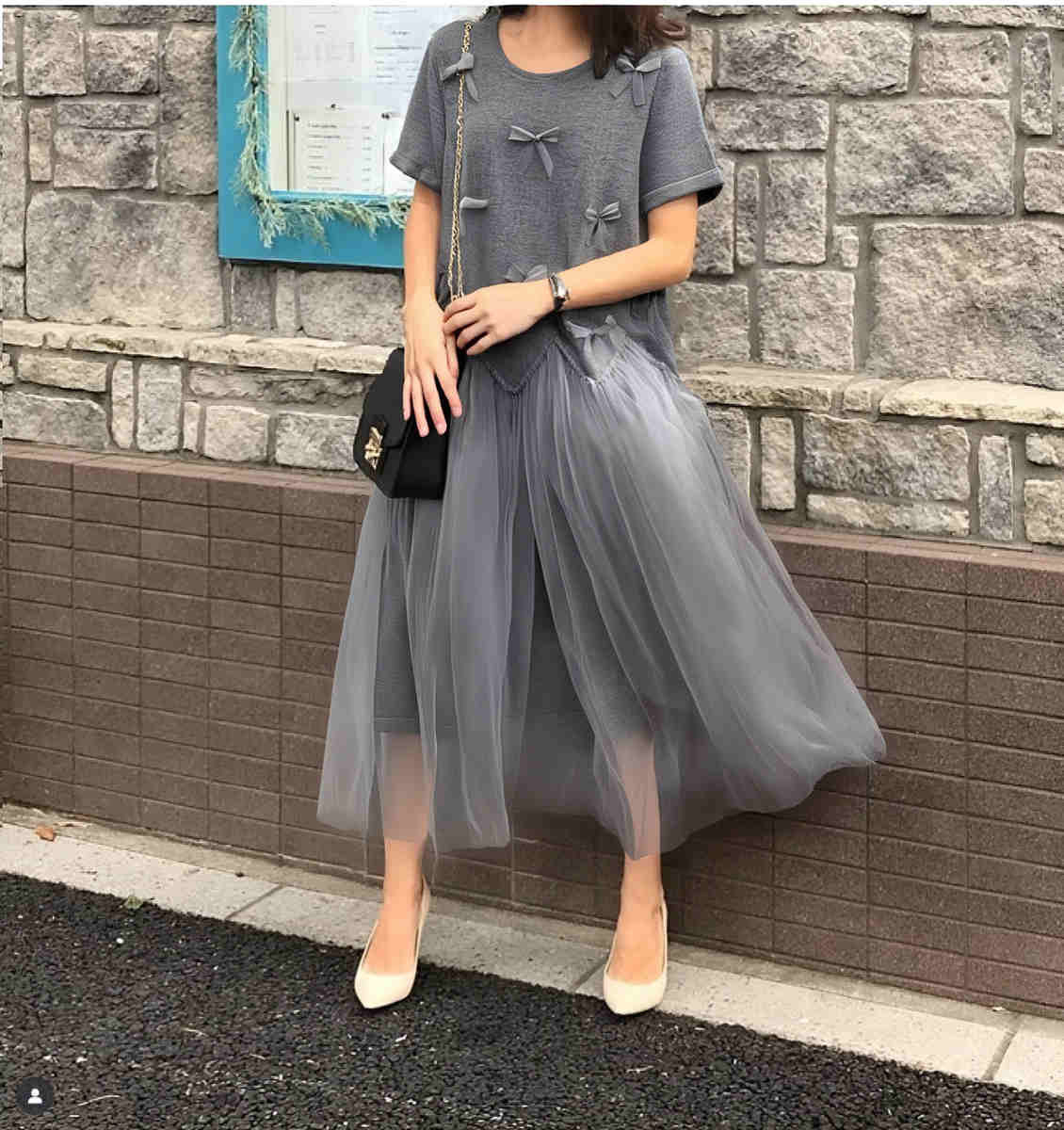 短袖トップスと透け感のあるフリルスカートの組み合わせで、