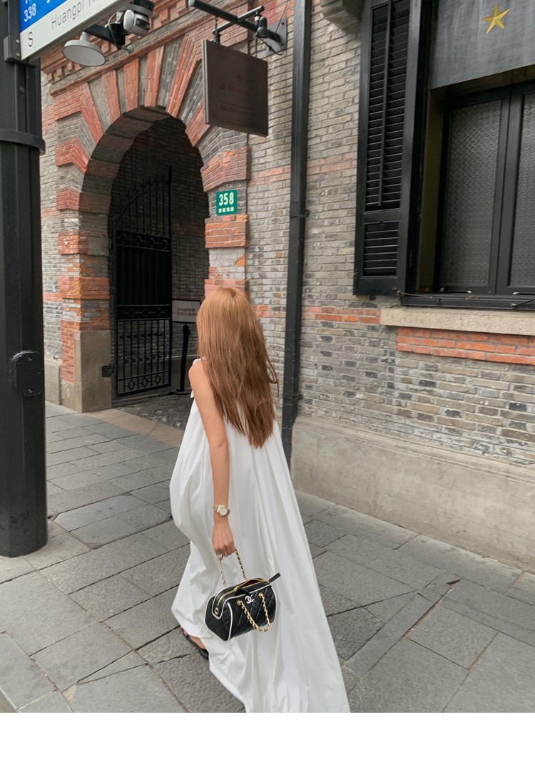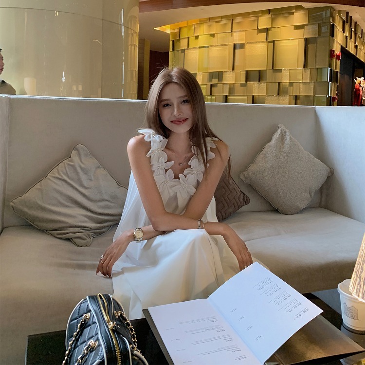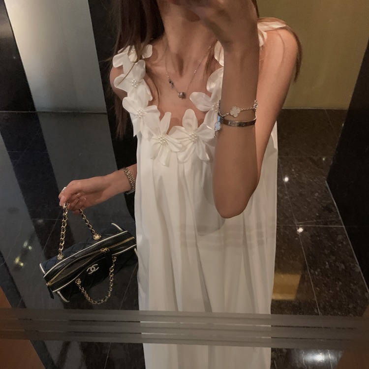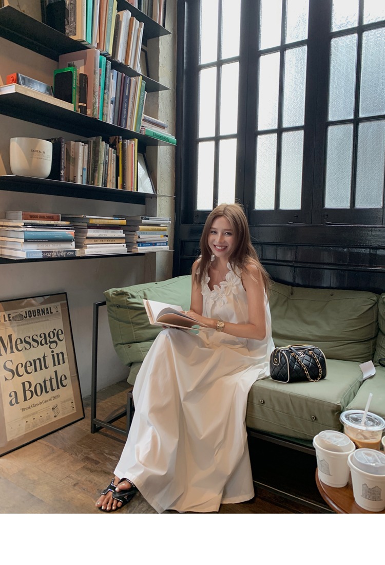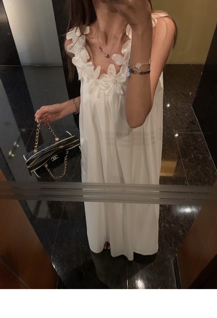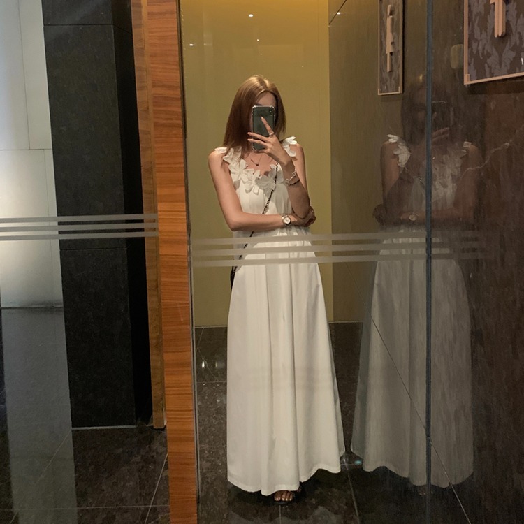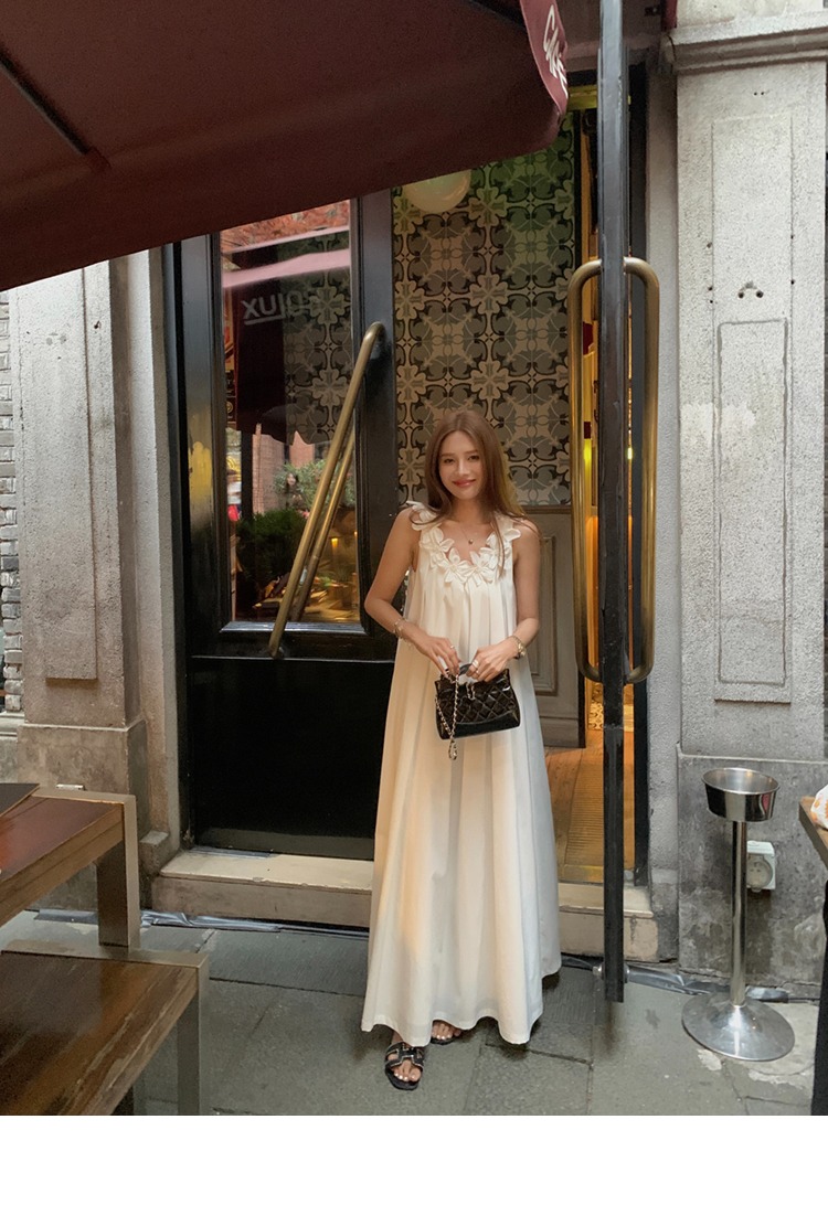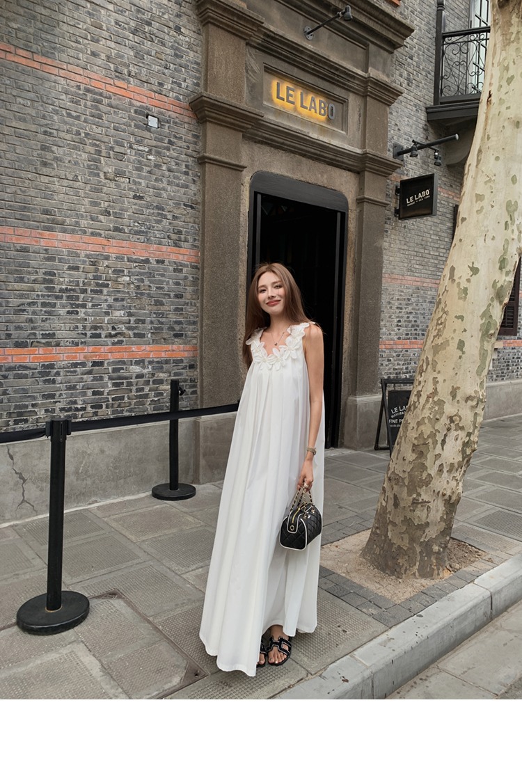 胸元の立体的な花柄装飾が上品で可愛らしい印象を演出するノースリーブのロングワンピースです。