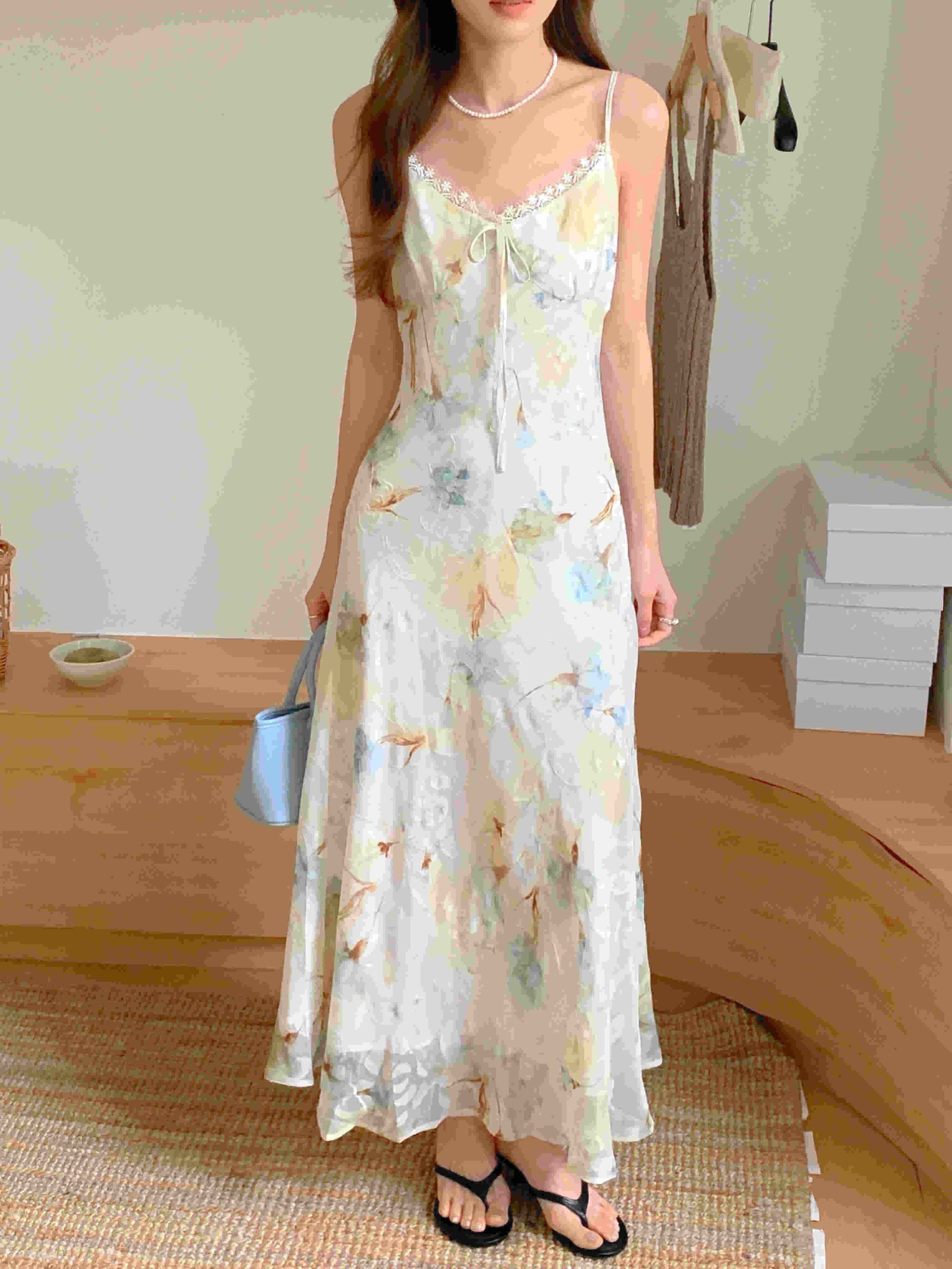 上品な花柄が魅力的なキャミソールタイプのロングワンピース。