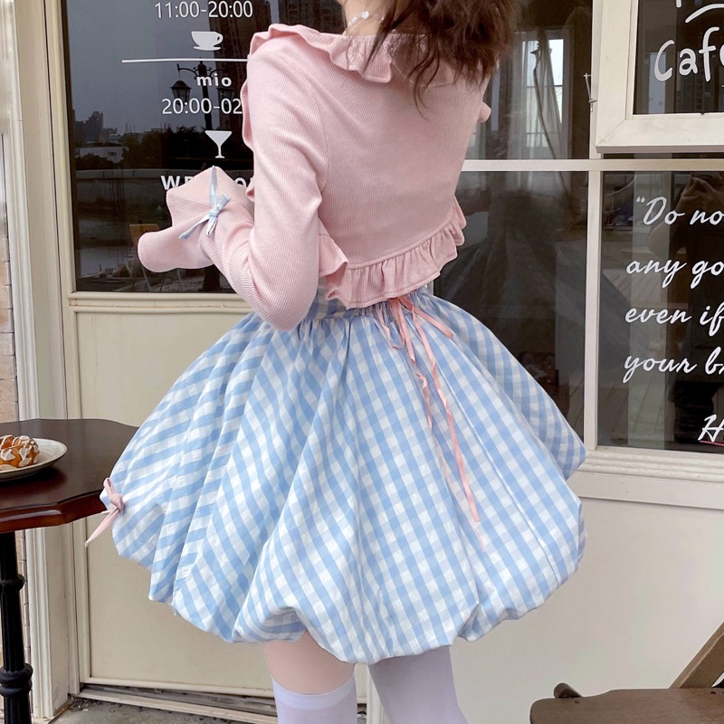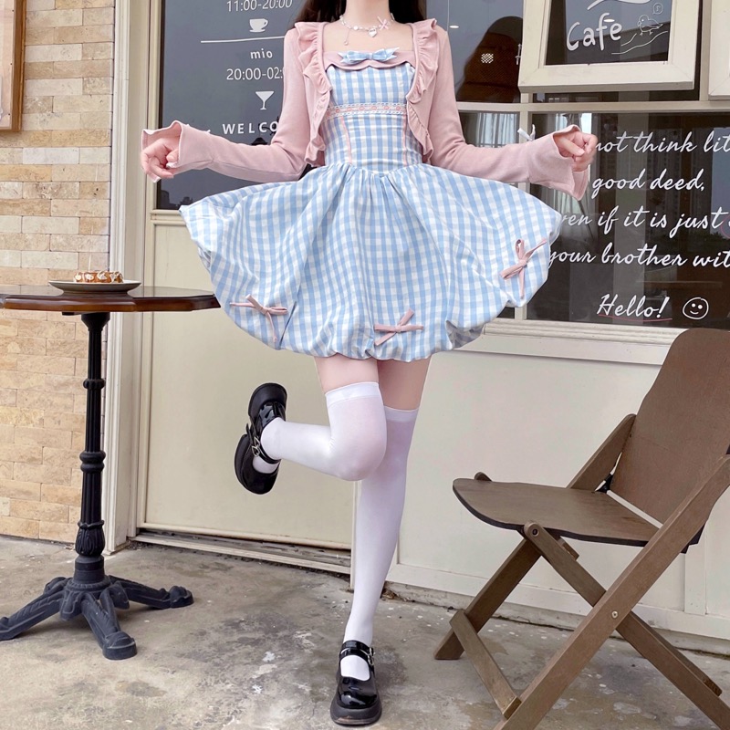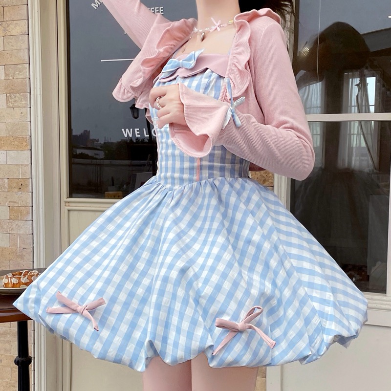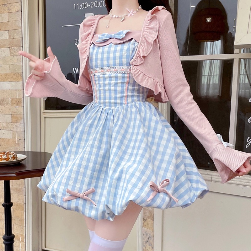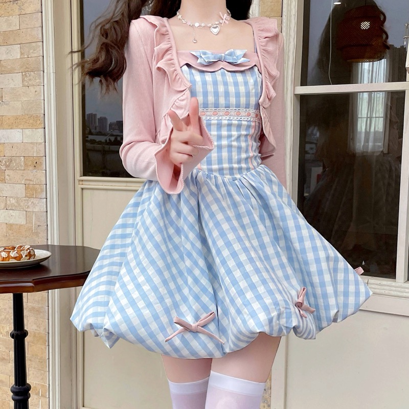 優雅な水色格子柄のフレアロングワンピースと桃色カーディガンの上品なセットです。