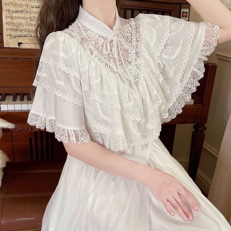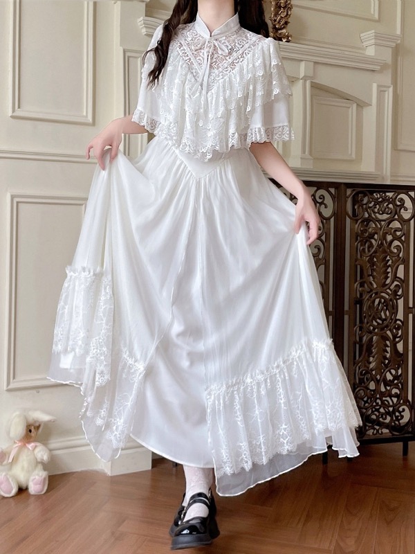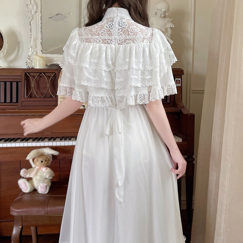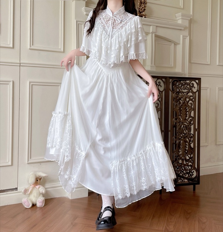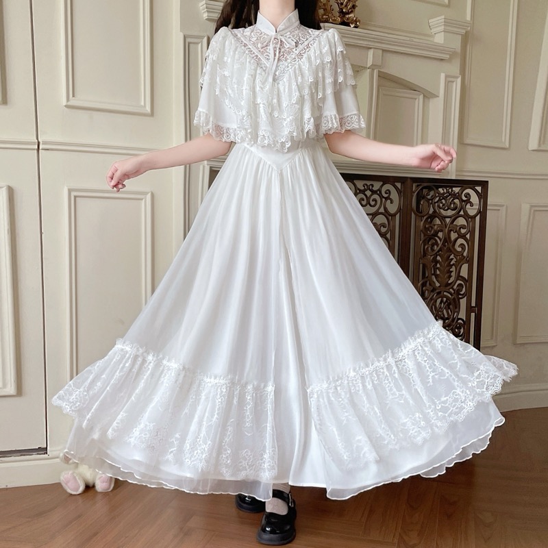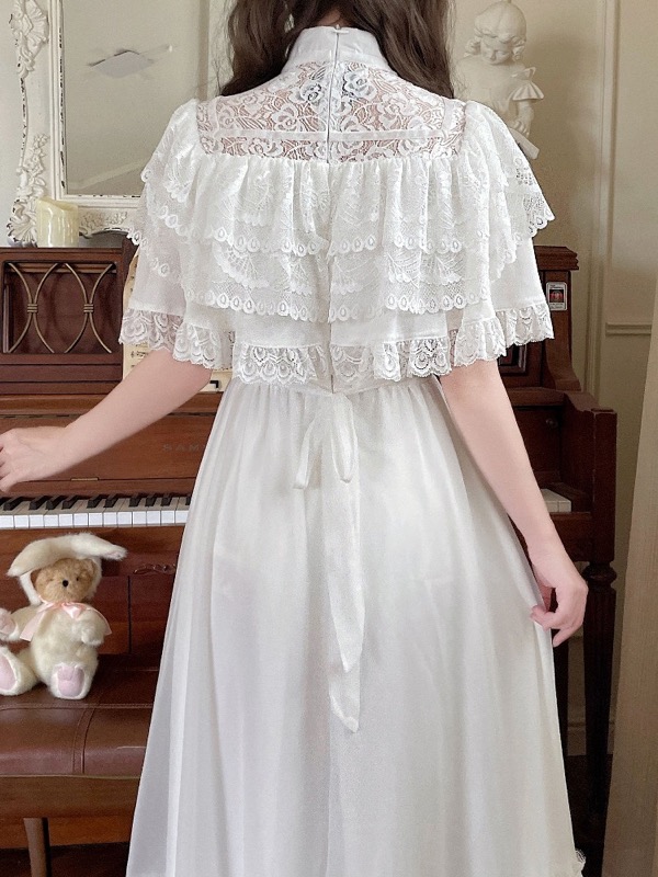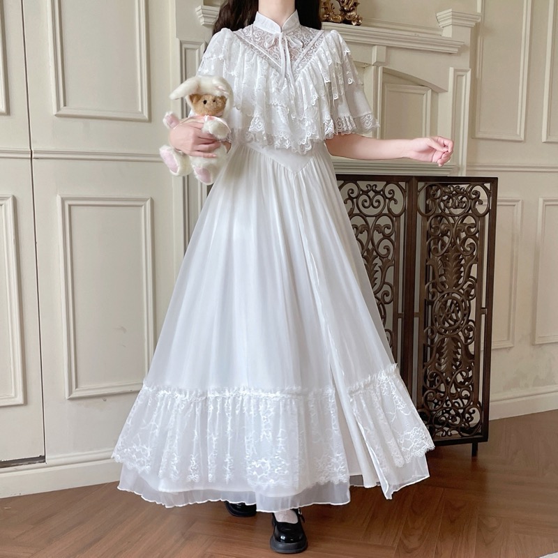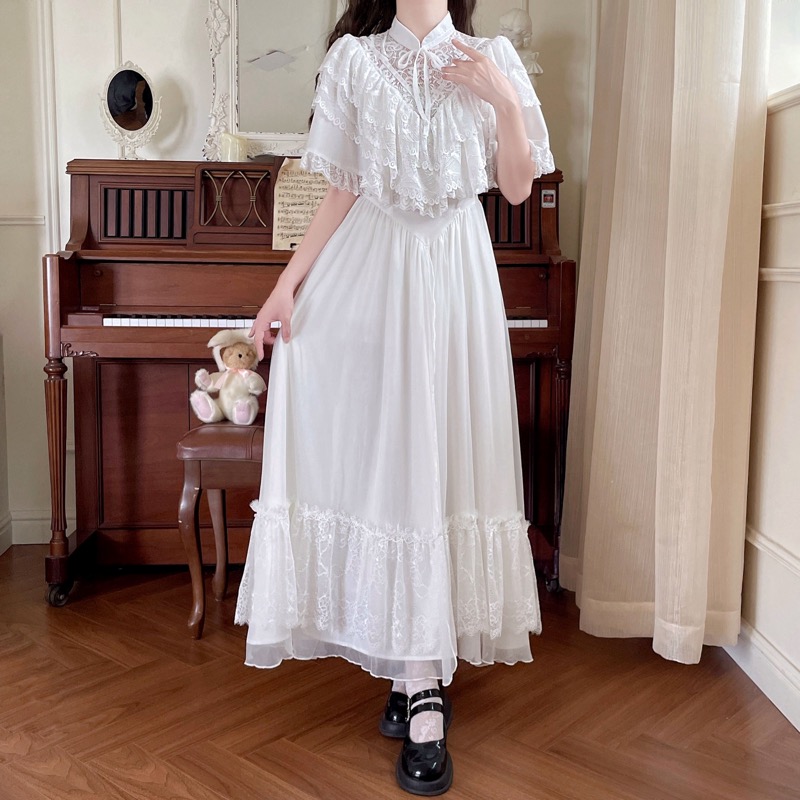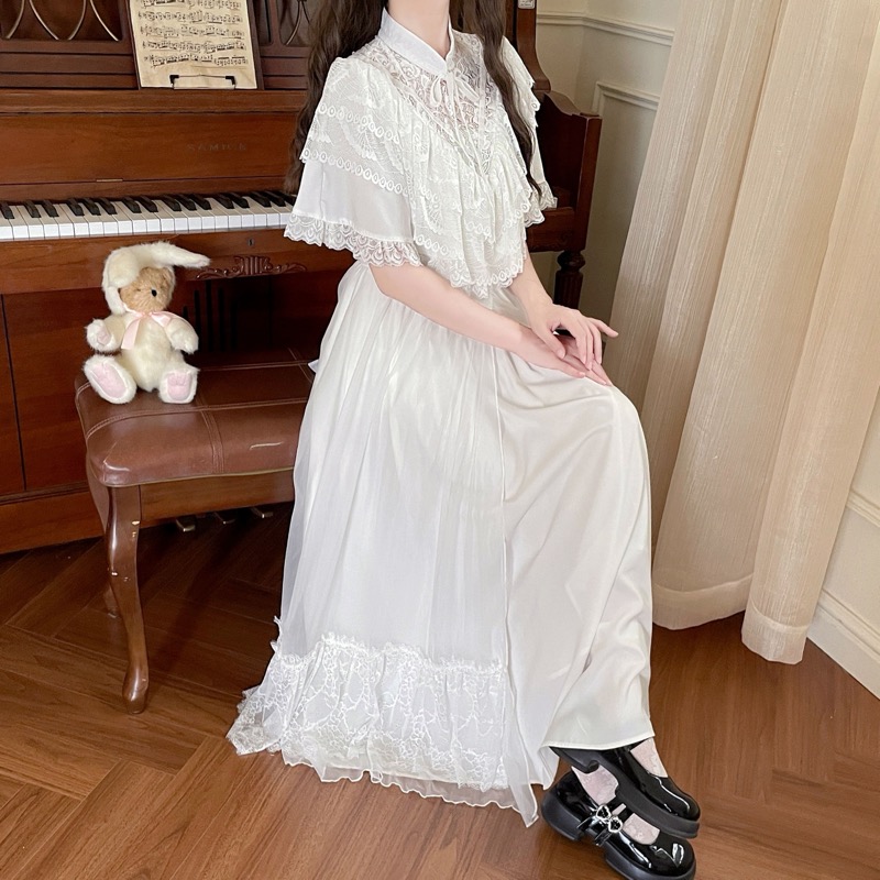 繊細なレースとフリルが美しいロングワンピースです。 上品で快適な着心地を提供するデザインが特徴で、半袖で季節を問わず活躍します。 カジュアルな日常使いから特別なお出かけまで幅広く対応できる魅力的なアイテムです。