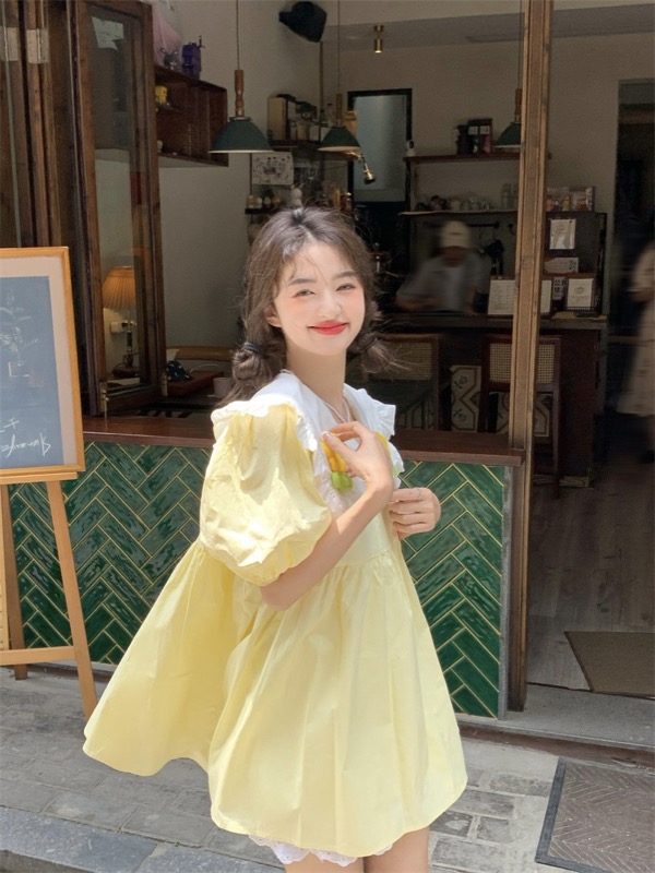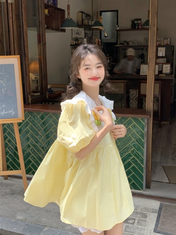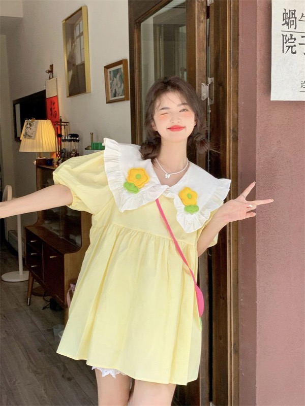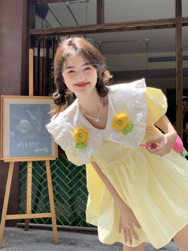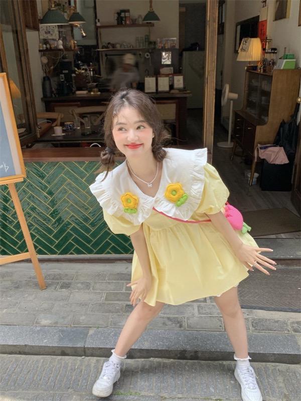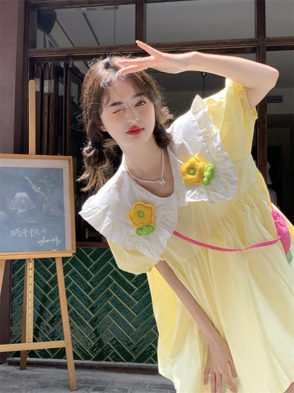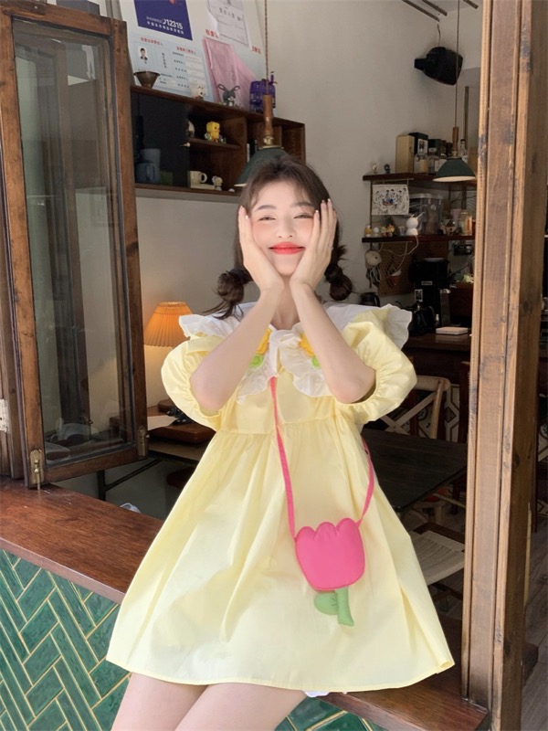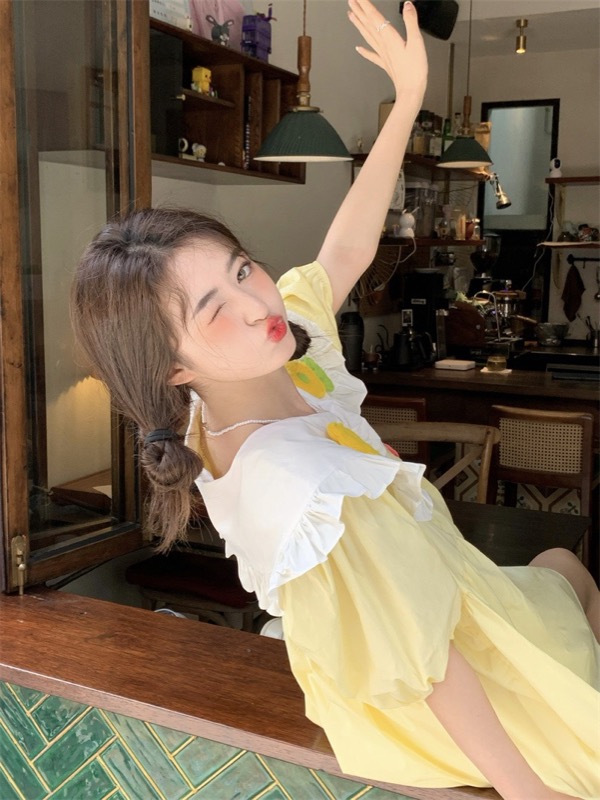 可愛らしい花柄刺繍とフリル襟が特徴的なロングワンピースです。