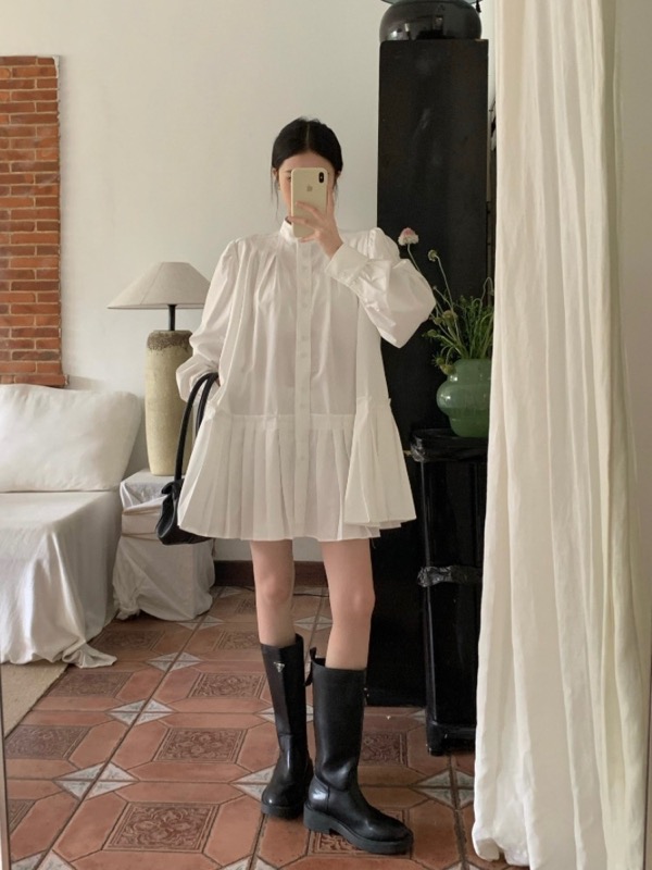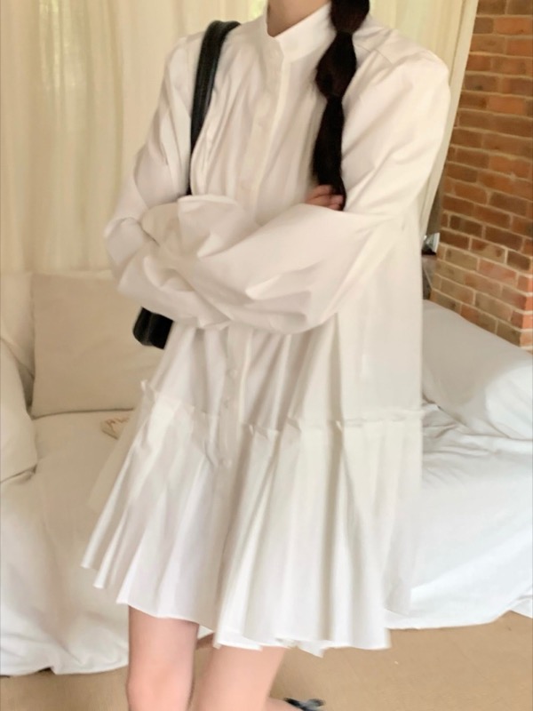 上品な白色のシャツワンピースで、快適さとスタイルを兼ね備えたデザインです。