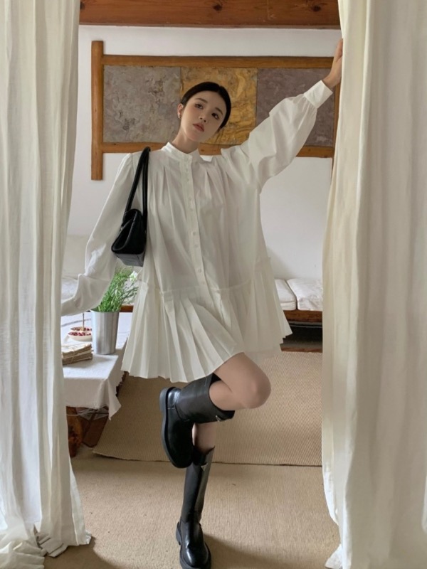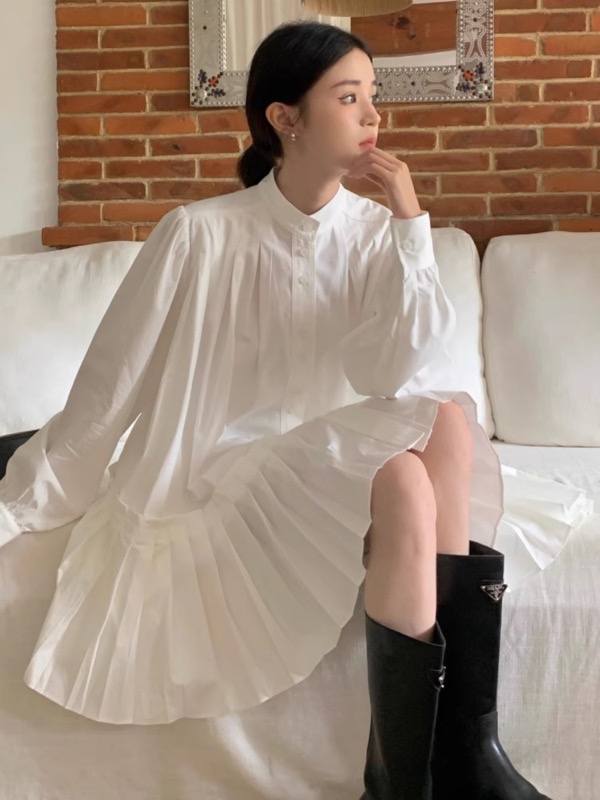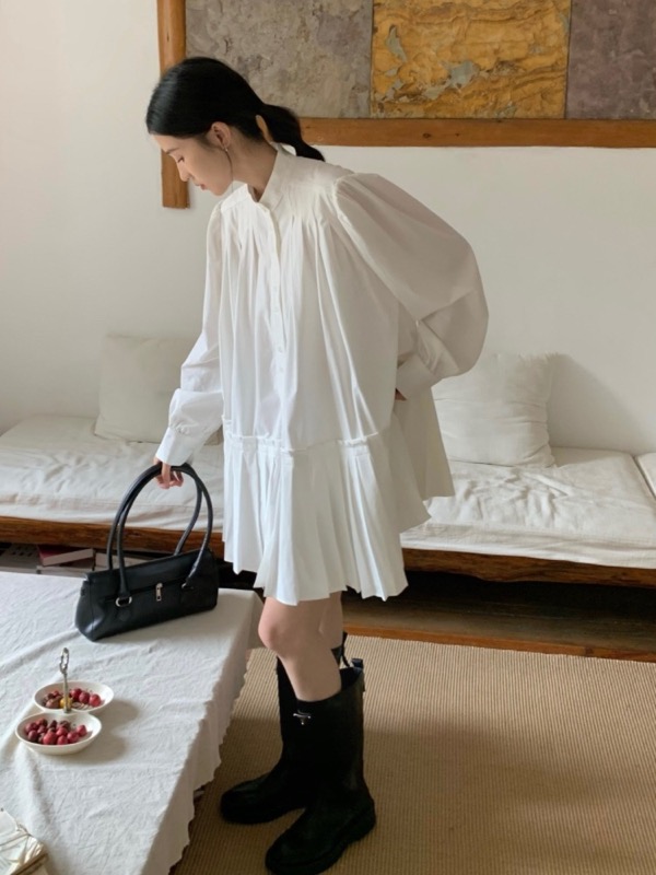 長袖でプリーツの効いた裾が女性らしいシルエットを演出し、ロングワンピースとして様々なシーンで活躍します。