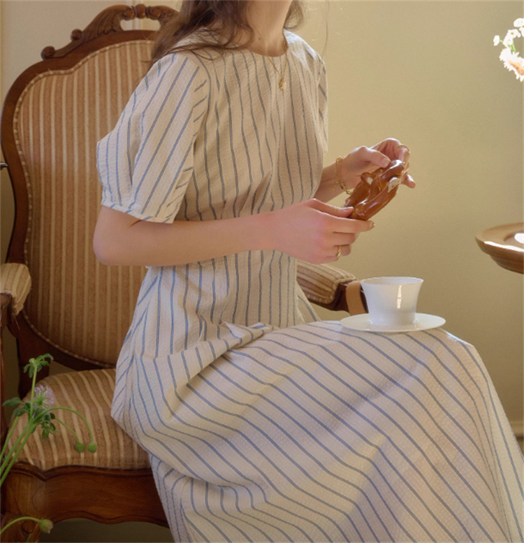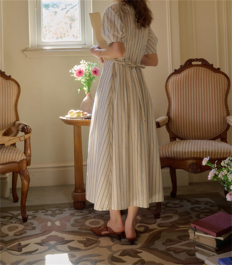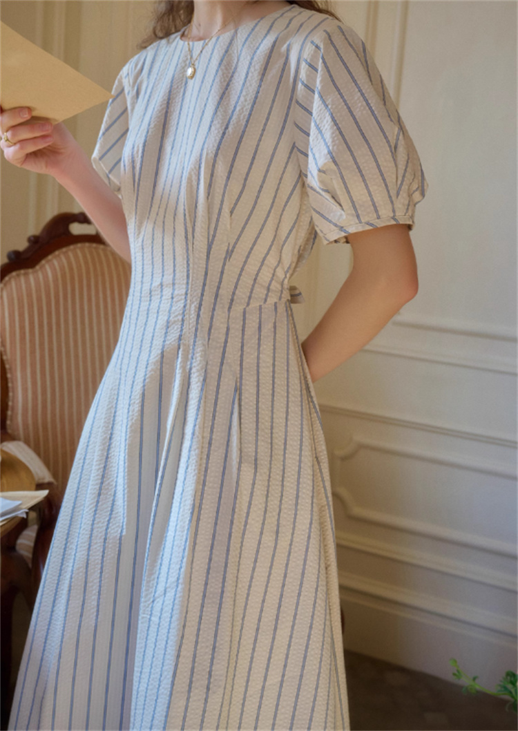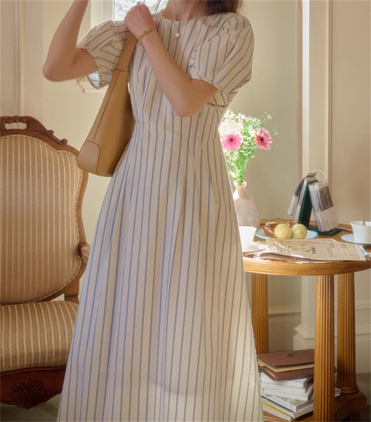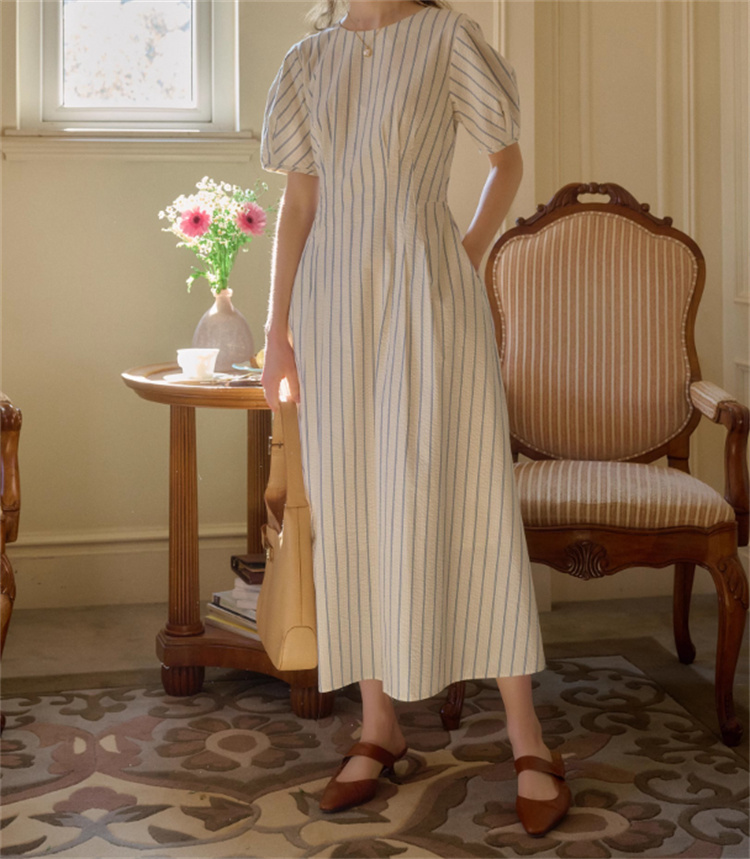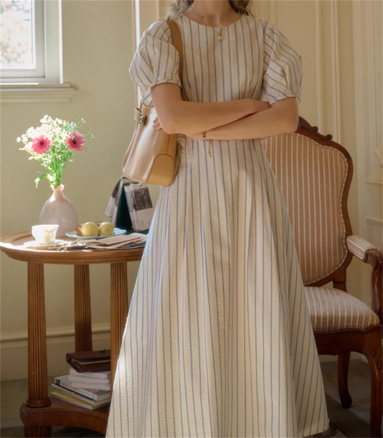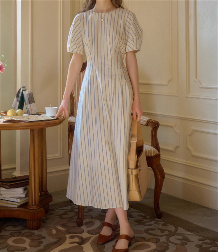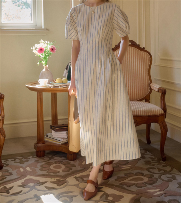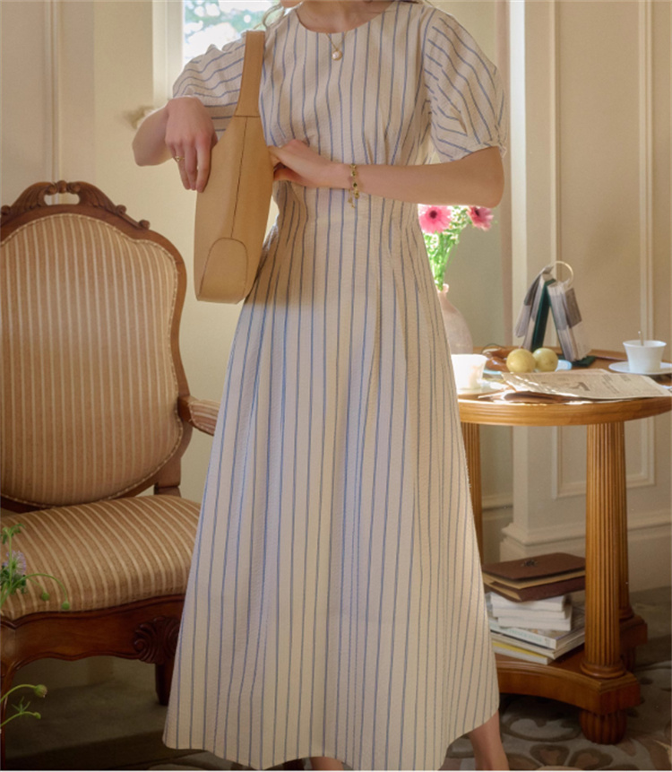 エレガントな縦縞柄が美しいフレアタイプのロングワンピースです。