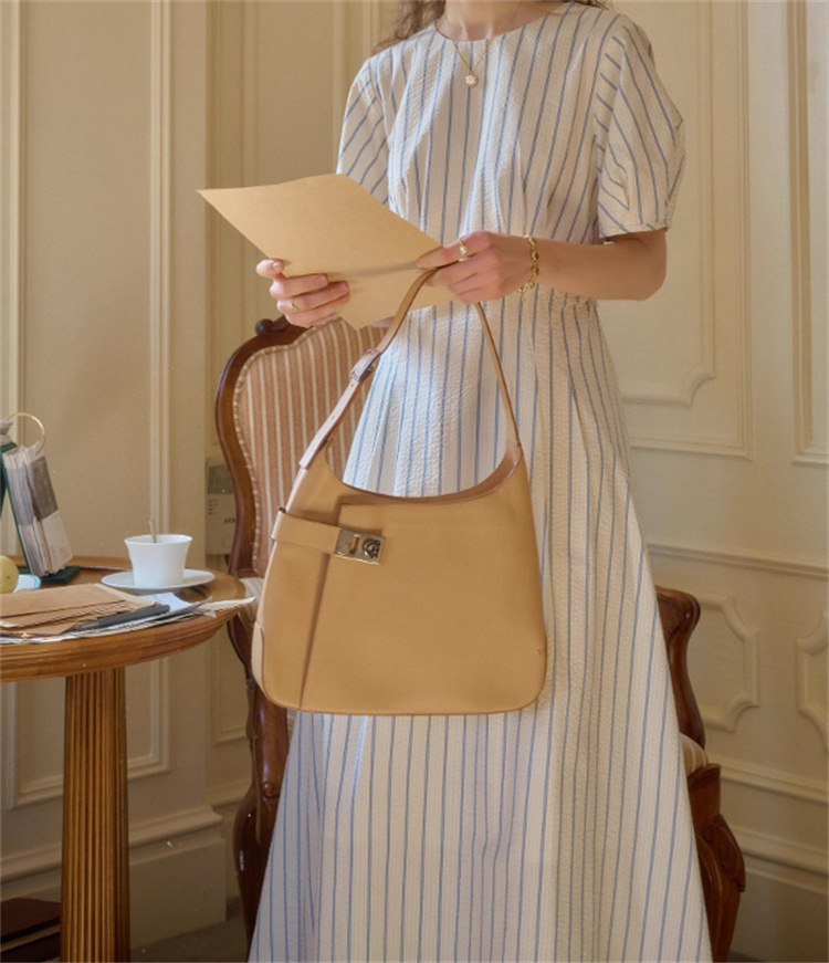 カラーは落ち着いたベージュ系の縦縞模様です。